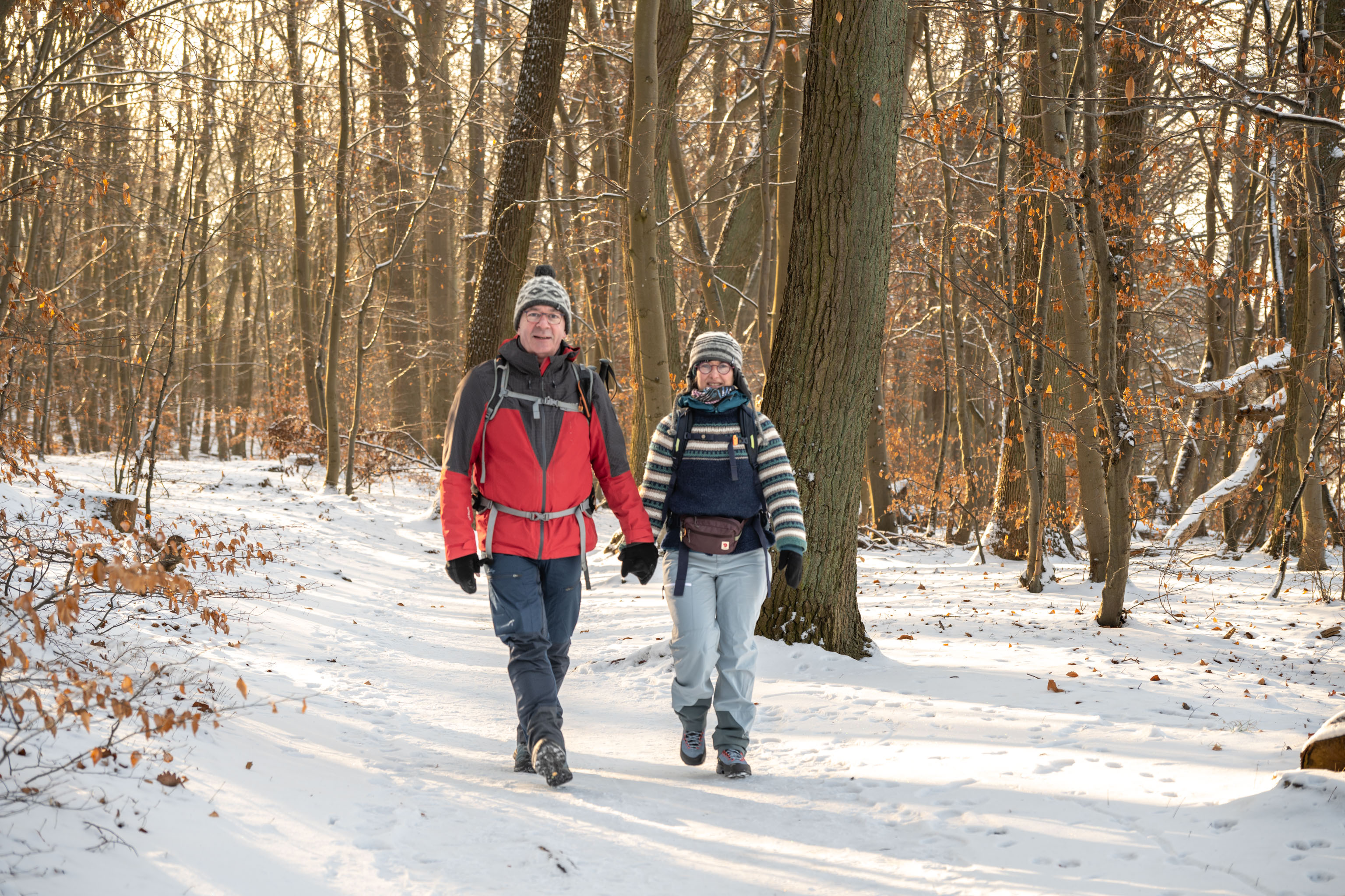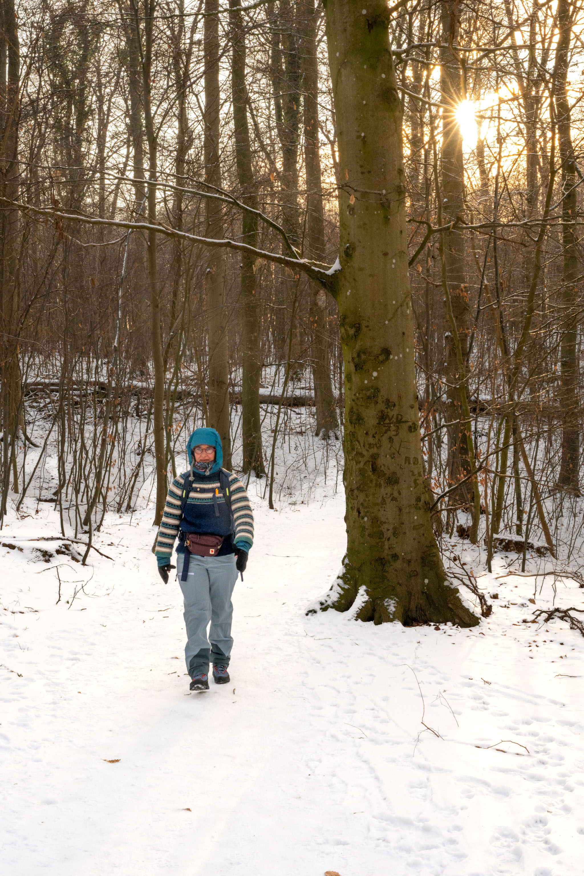 Lange Zeit dachten wir nicht, dass es heute ein gemeinsames Selfie geben wird – zu sehr schreckte uns der Gedanke ab, das eiskalte Stativ aufbauen zu müssen. Als dann aber die Sonne immer stärker durch kam und wir gleichzeitig windgeschützt durch ein kleines Wäldchen wanderten, war es dann doch erträglich.