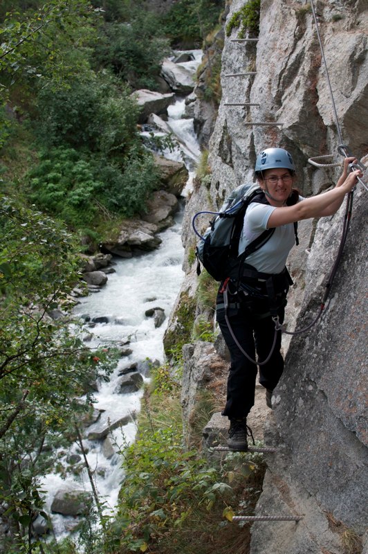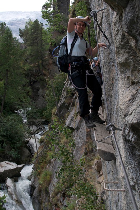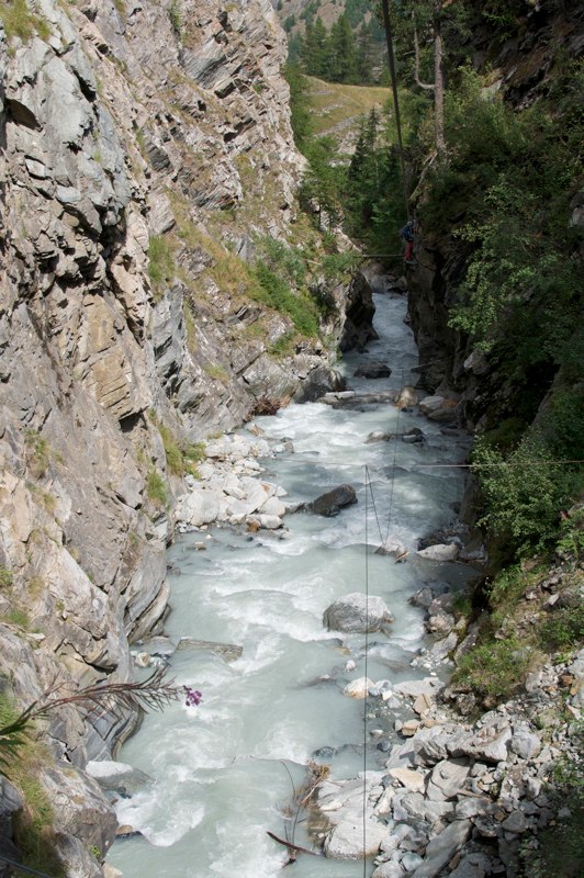 Hier in der Gegend kommt man wandermäßig überhaupt nicht voran, weil es nur so vor (heute sogar etlichen jungen) Murmeltieren wimmelt, die einem den Weg versperren (und ausgiebig fotografiert werden wollen). So sind wir heute Vormittag/Mittag nur auf den Hannig (2.350 m) spaziert und haben den Nachmittag und Abend stattdessen in einer Schlucht zwischen Saas-Fee und Saas-Grund verbracht. Die ist nämlich murmeltierfrei. Wahrscheinlich wäre es aber sinnvoller gewesen, wenn Mia weitere 10.000 Murmeltierfotos gemacht hätte und ich stattdessen die Höllenängste hätte vermeiden können, die ich in der Schlucht überstehen musste ;-)