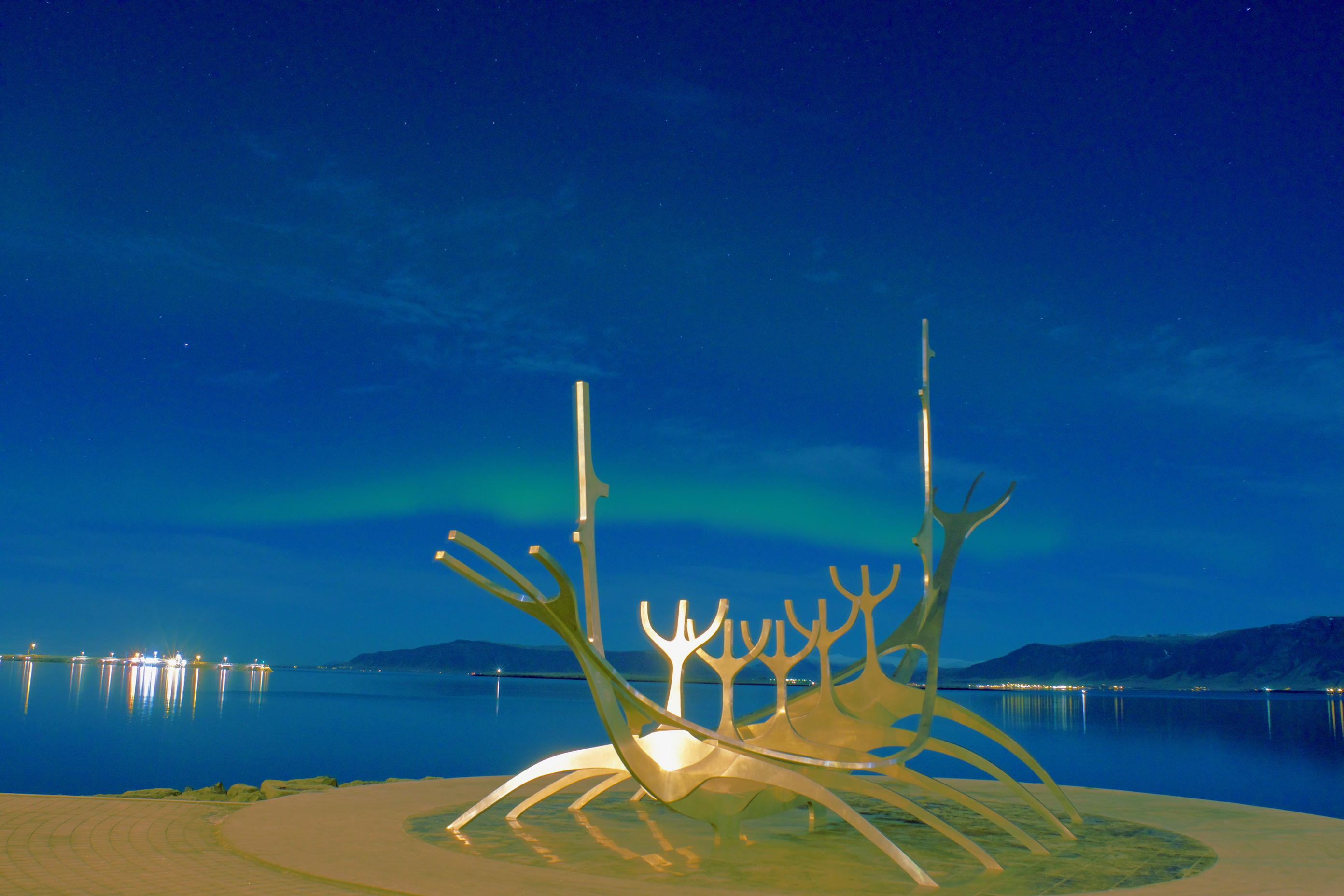 Und auf dem Heimweg zurück zu unserem Hotel – es war bereits dreiviertel eins – haben wir dann mitten in Reykjavík am "Sonnenschiff" noch einmal ein Polarlicht gesehen.