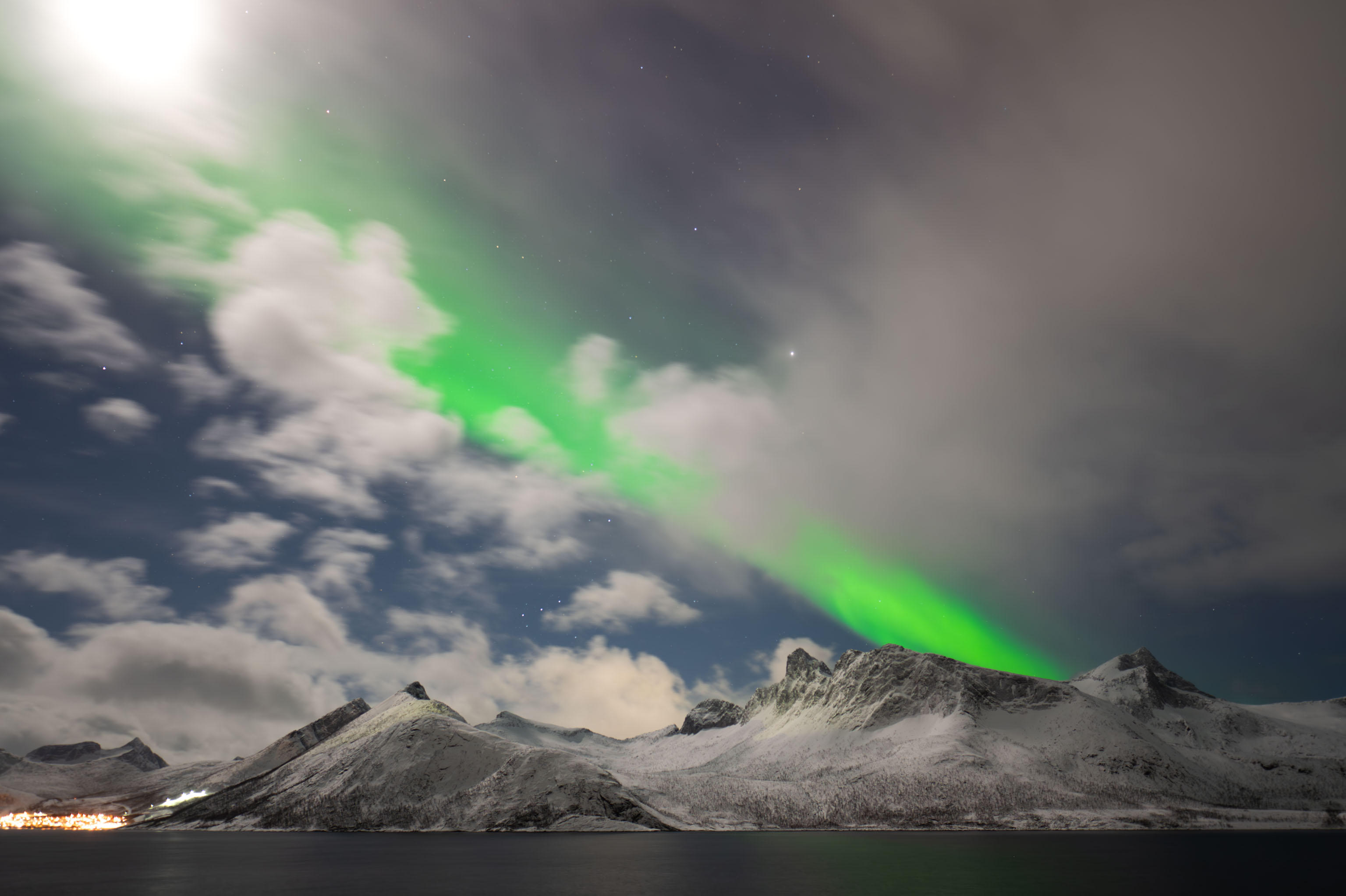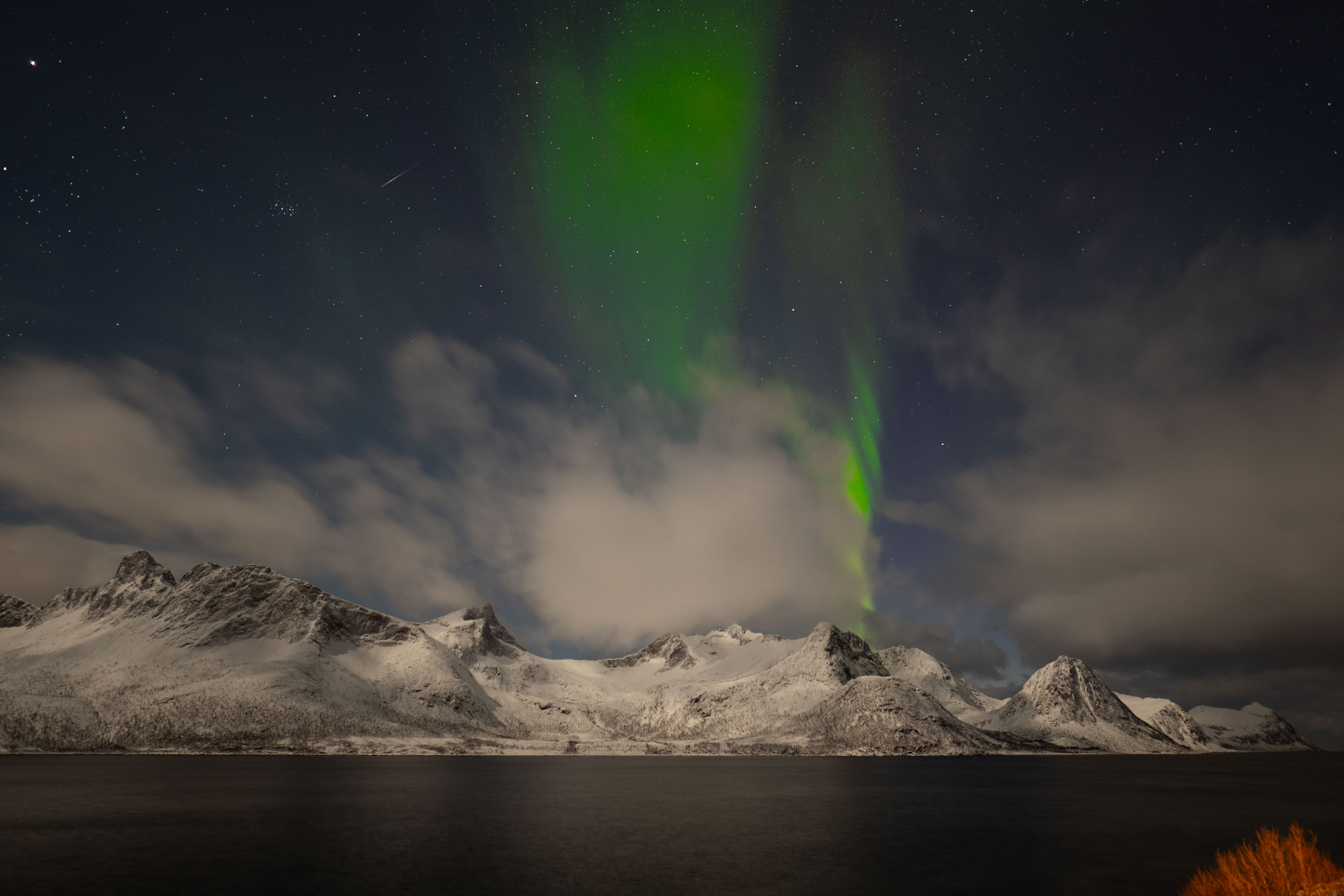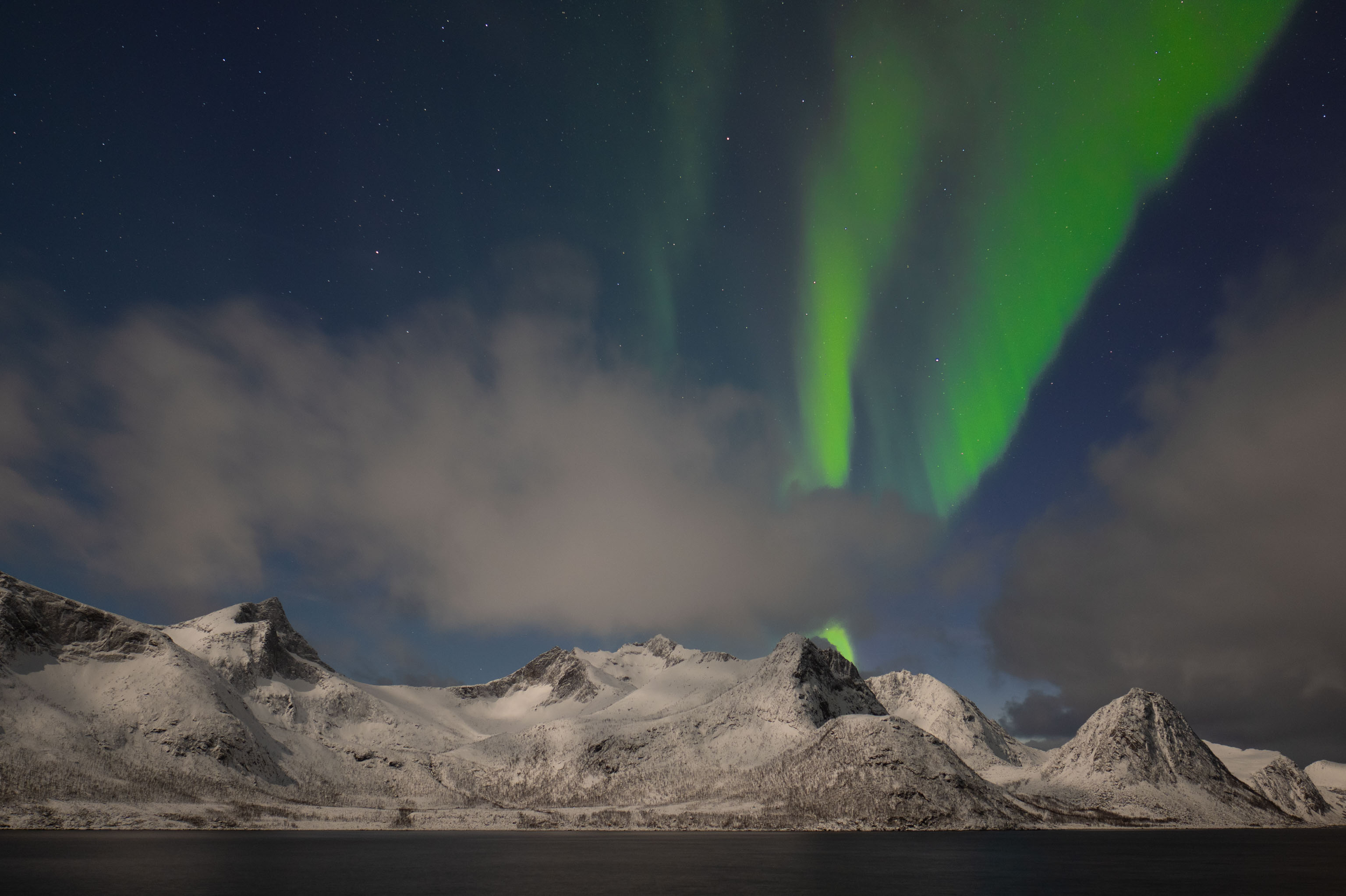 Die Polarlichter waren zwar auch in der vergangenen Nacht nicht optimal (es sollen in den nächsten Tagen noch bessere kommen), aber die schneebedeckten Berge geben bisher zumindest die beste Kulisse für unsere Polarlichtbeobachtungen her.
