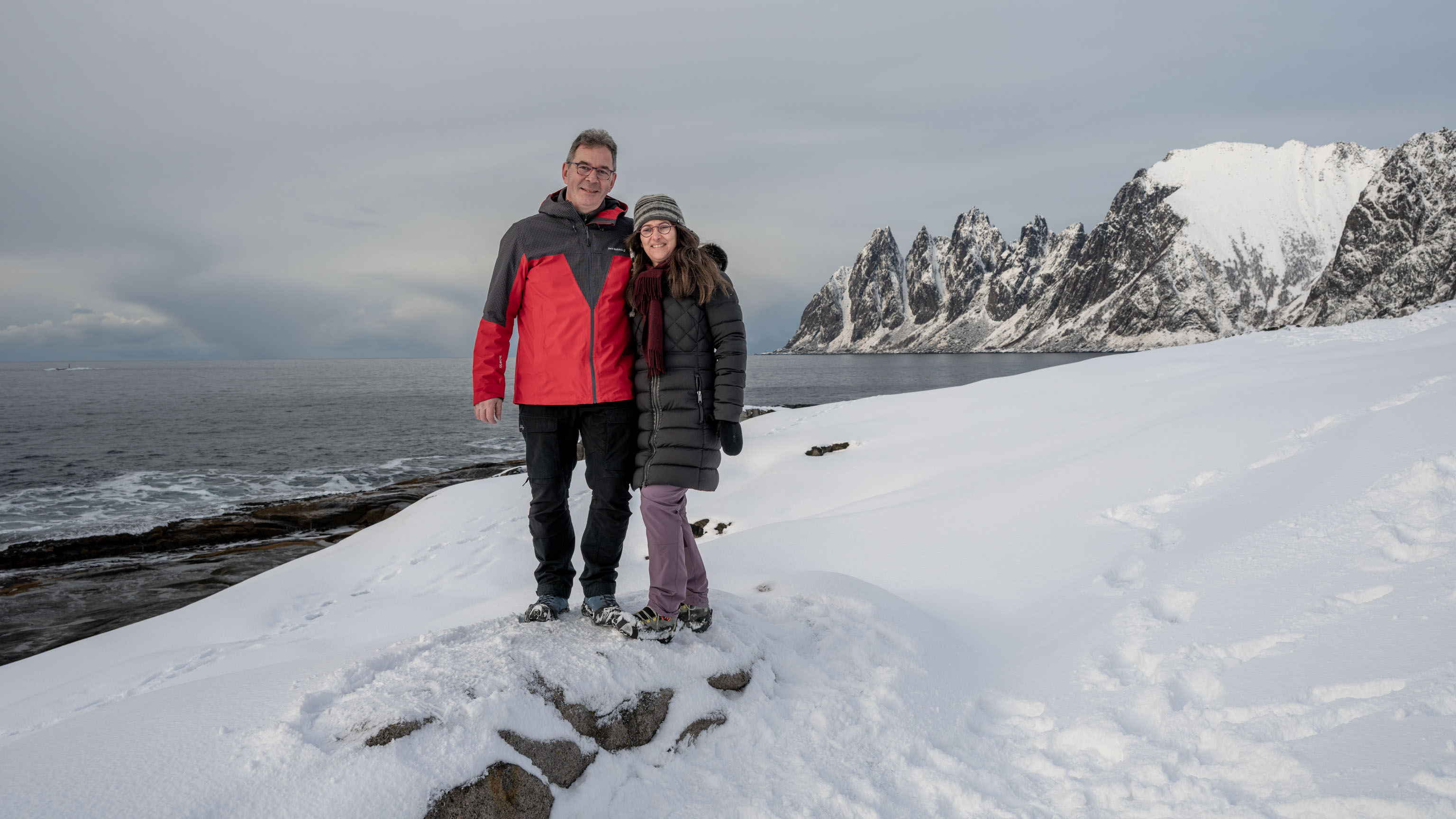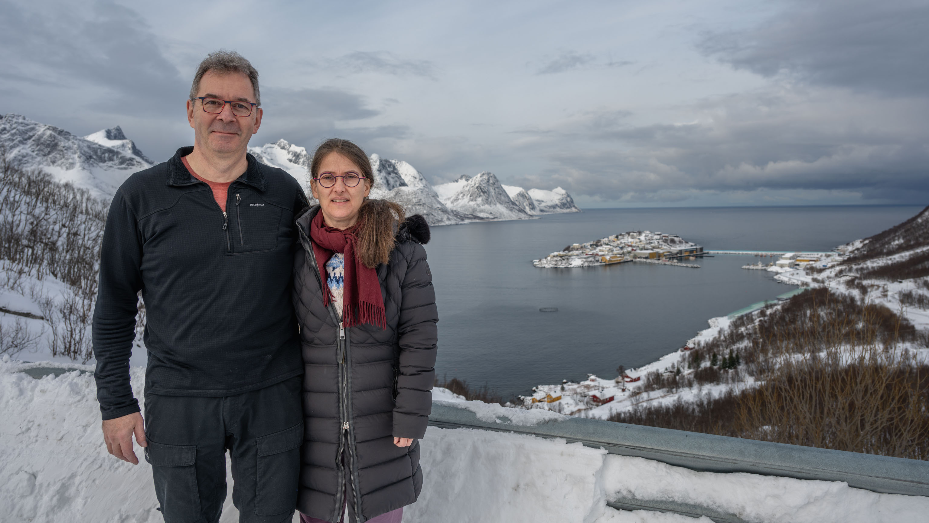 Das erste Motiv aus der heutigen Bildergalerie kennt ihr natürlich schon: der Blick von einer der Serpentinen hinunter auf Husøy – wir dachten uns, es ist heute immer noch schön und zusätzlich waren gerade nette Französinnen zur Hand, die uns fotografieren konnten. Die nächsten vier Fotos sind aus Fjordgård und von der Fahrt dorthin. Dann kommen zwei Fotos von uns am Ersfjordstrand vor den Teufelszähnen und auf den letzten drei Fotos kann man die Teufelszähne von Tungeneset aus in ihrer vollen und bekannten Schönheit bestaunen.
