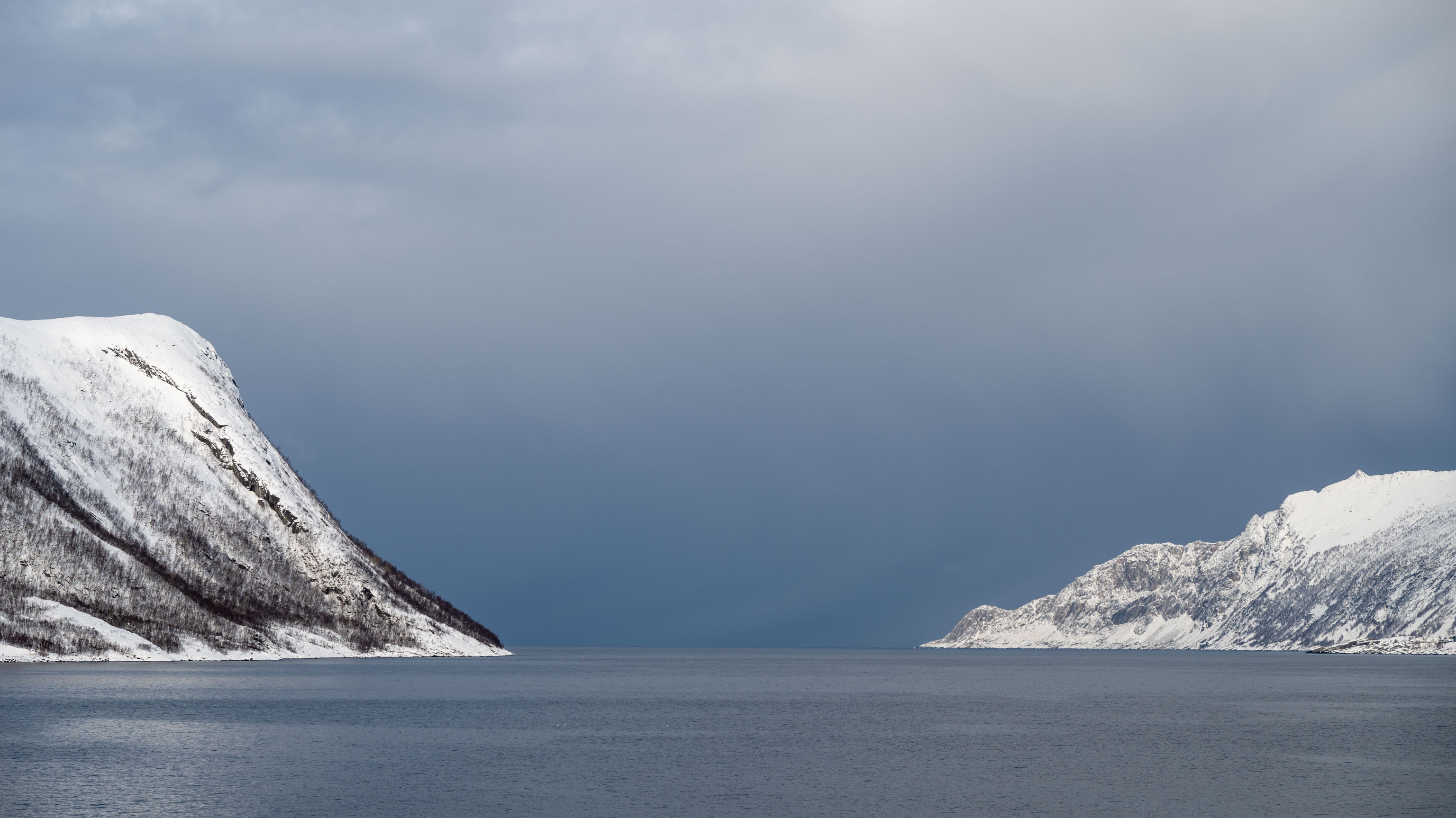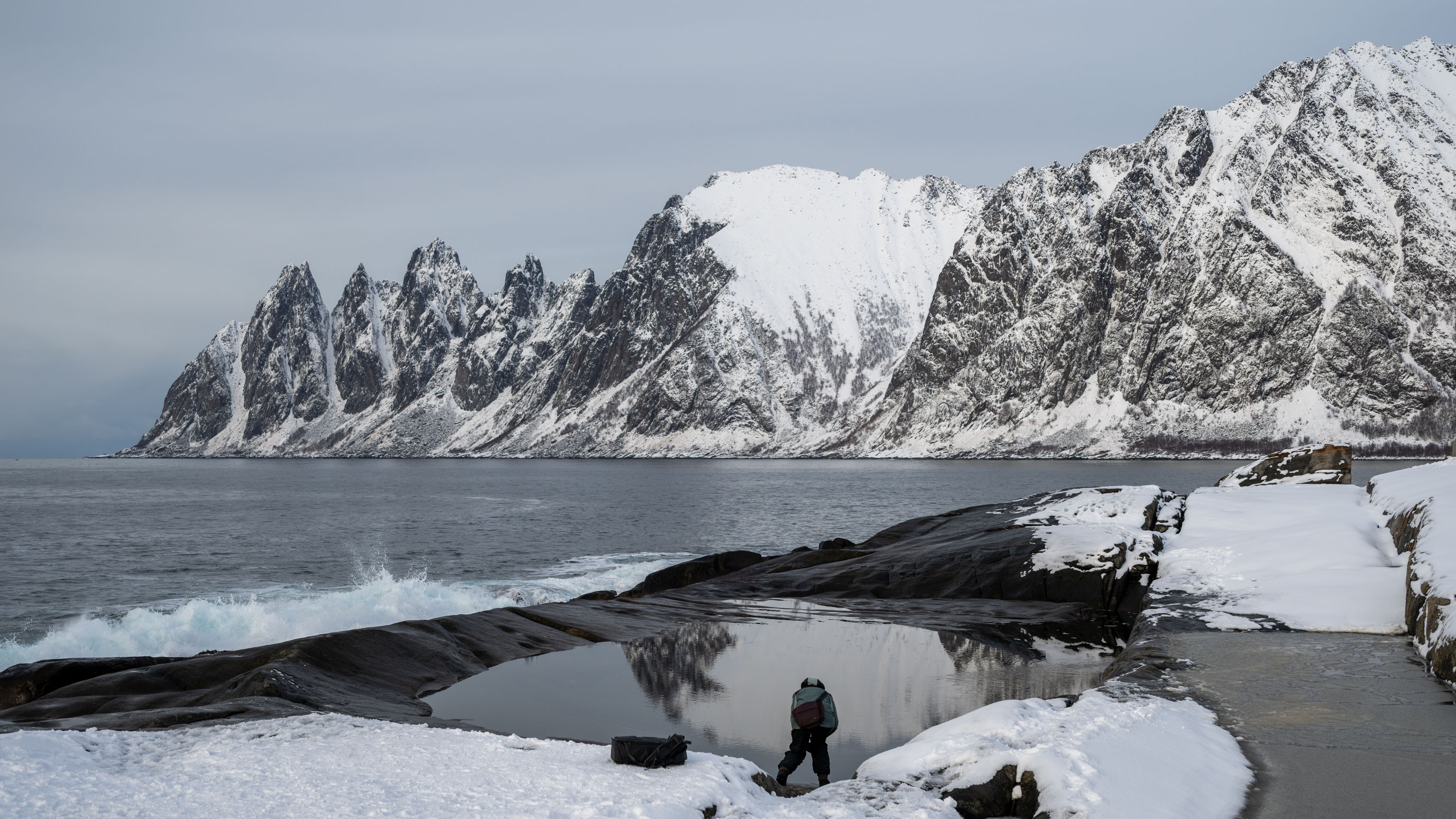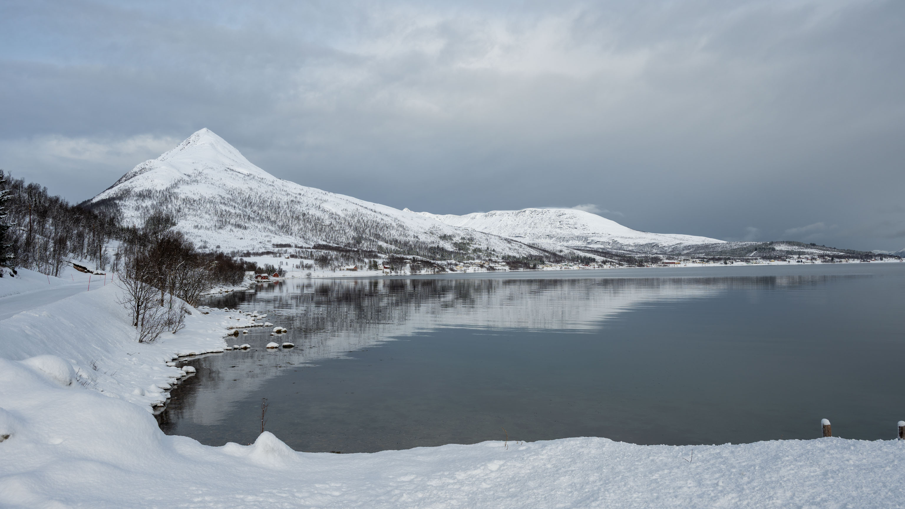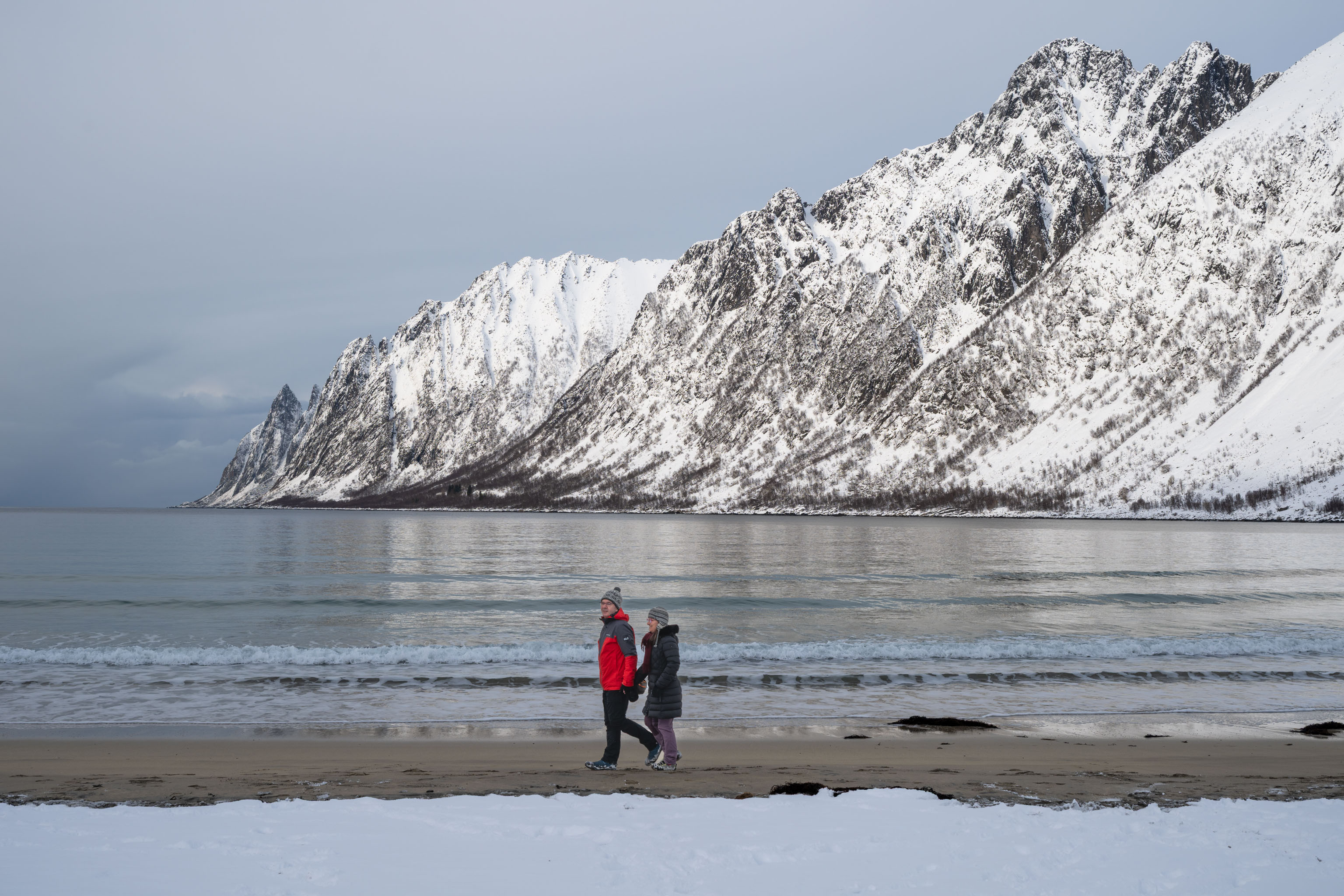Die Teufelszähne sind mit Sicherheit das bekannteste Fotomotiv auf Senja. Eigentlich wollten wir ab übermorgen von unserem nächsten Quartier aus dort hin – von dort ist es viel näher. Aber die Wettervorhersage veranlasste uns, kurzfristig nach dem Besuch in Fjordgård direkt weiter an den Ersfjordstrand und nach Tungeneset zu fahren – von diesen beiden Punkten kann man die Teufelszähne am bestehn sehen. Vielleicht schauen wir in ein paar Tagen ja trotzdem noch einmal vorbei – dann vielleicht bei Schneesturm.