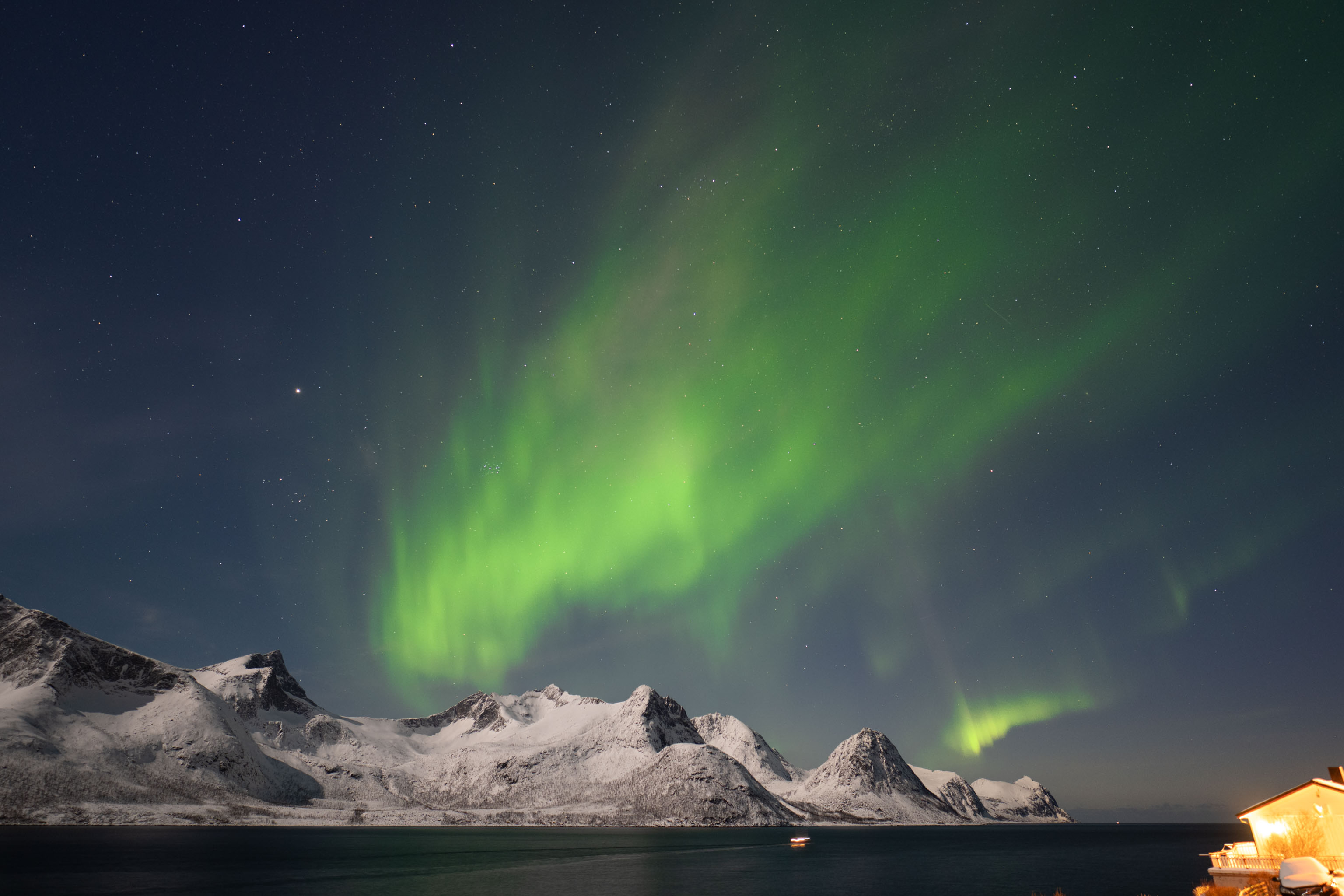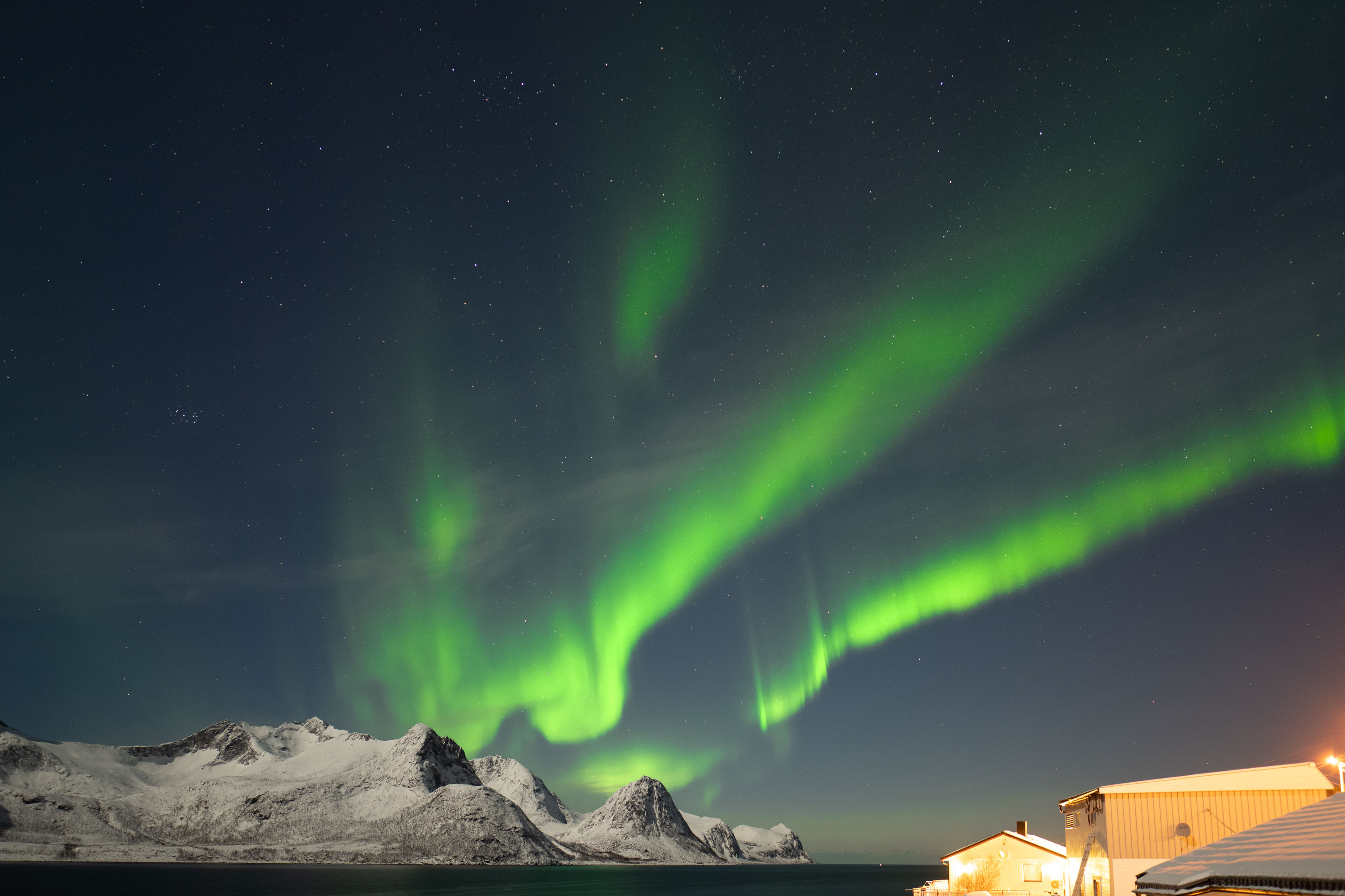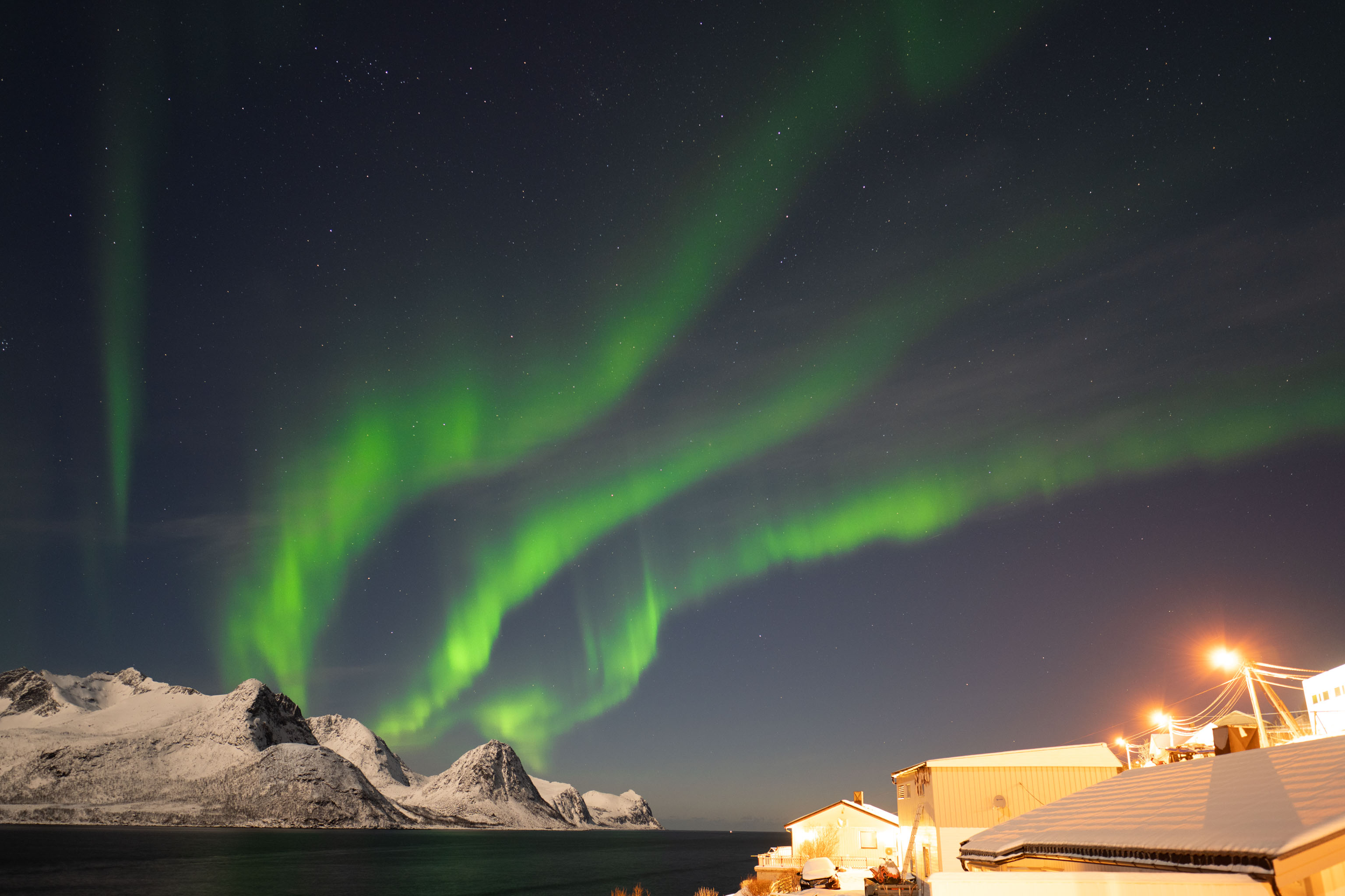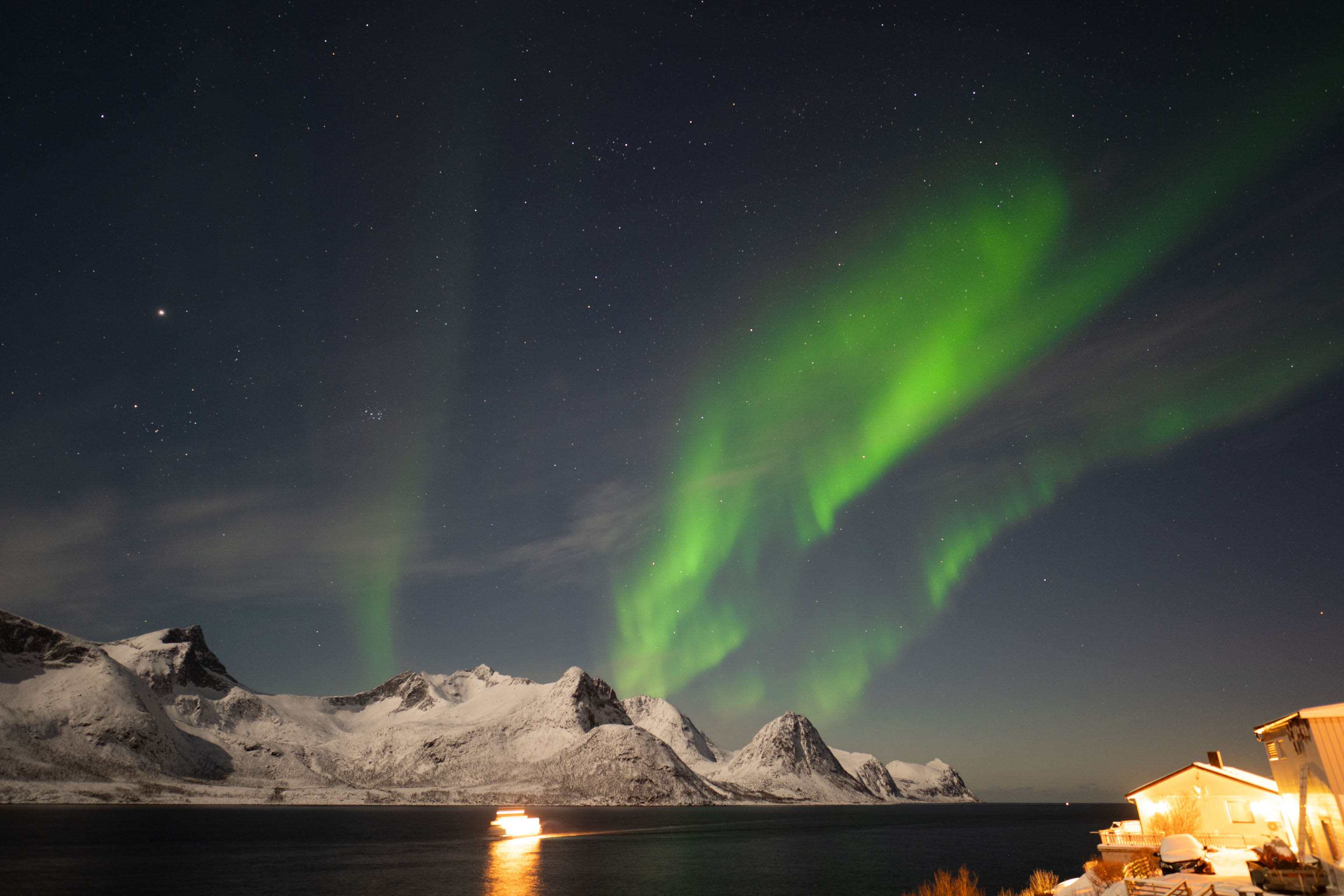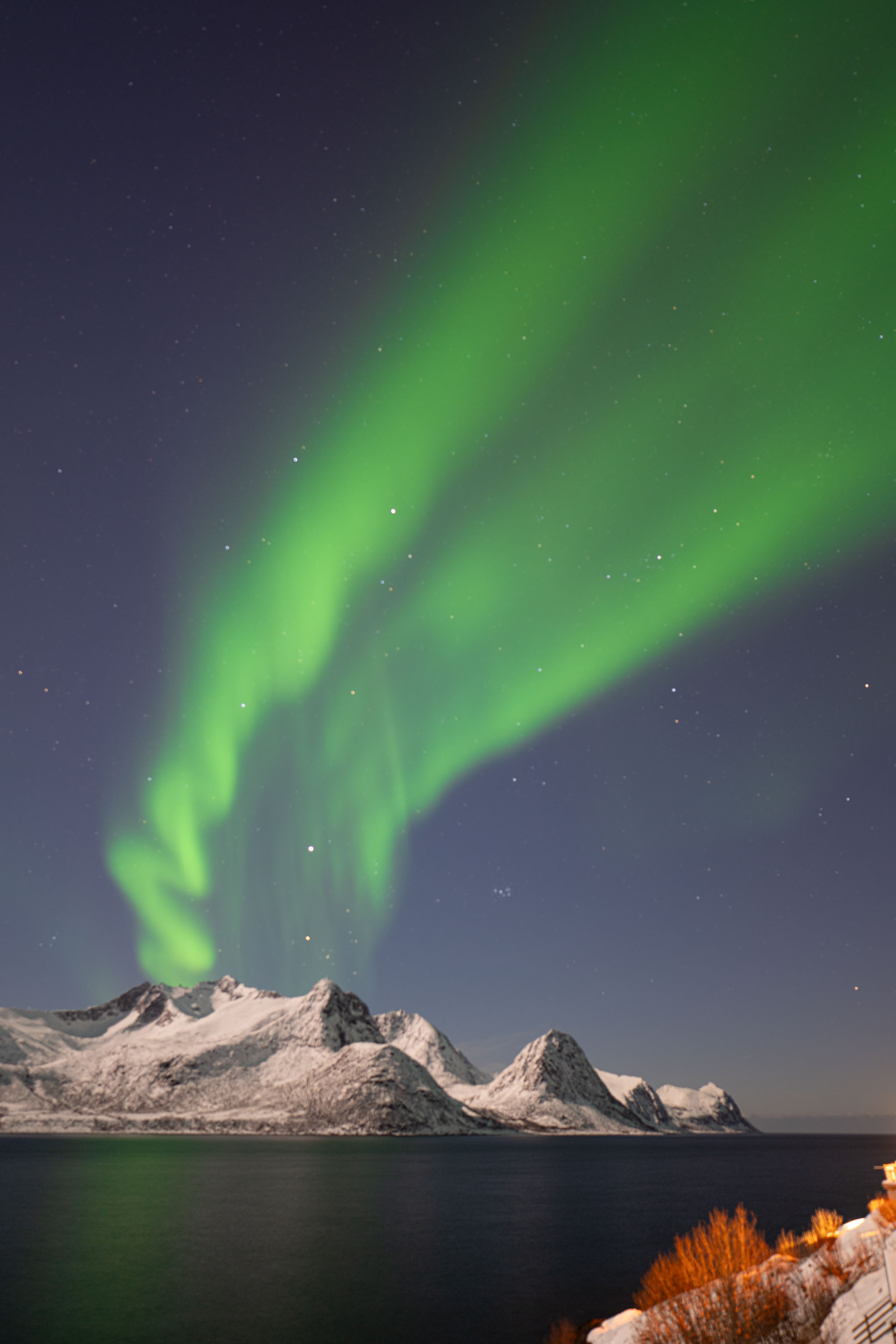 Die gestrigen Lichter waren mindestens so farbenfroh kräftig und tanzend wie vor drei Jahren vor dem Red Fjordhouse – sie haben lediglich den Himmel nicht ganz so raumfüllend eingenommen wie damals.
