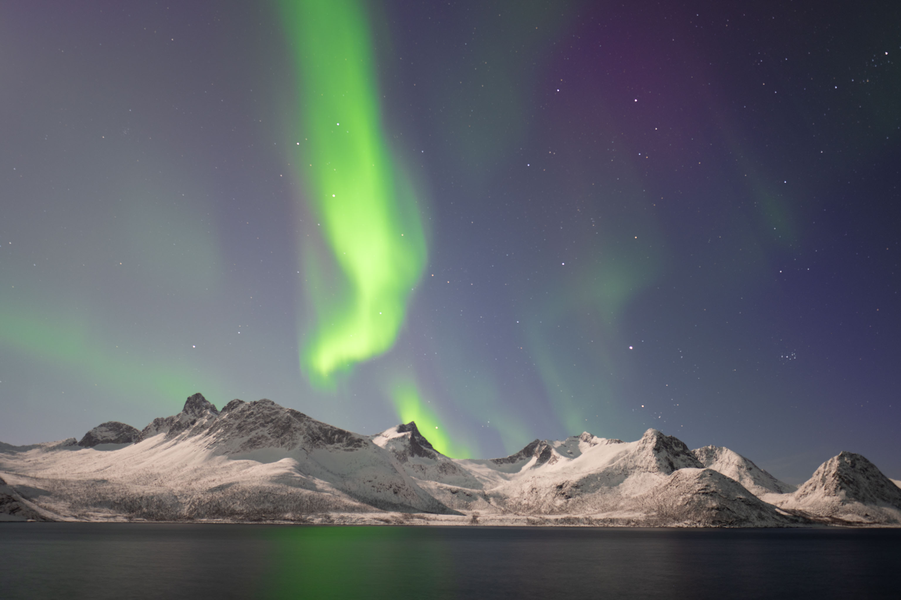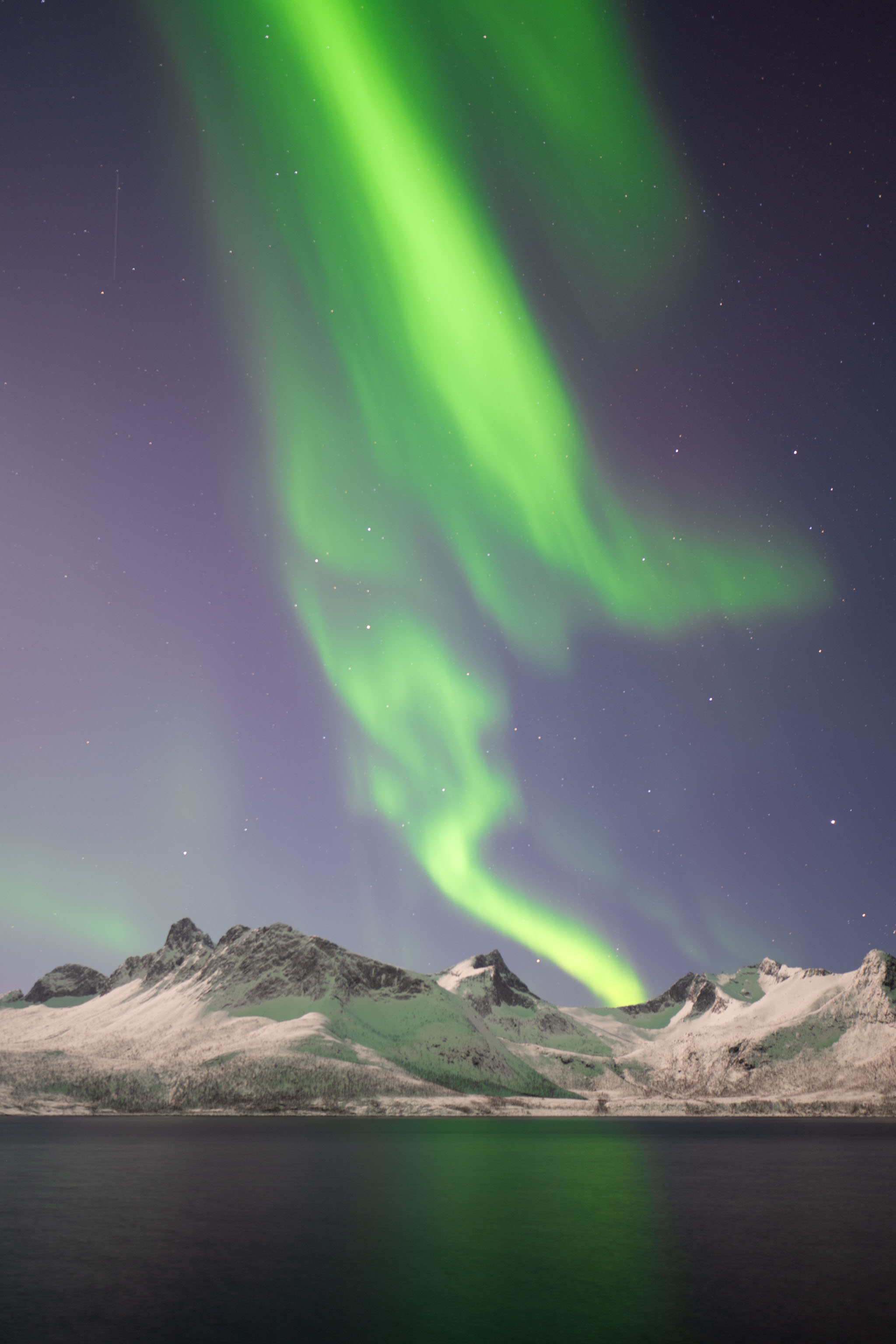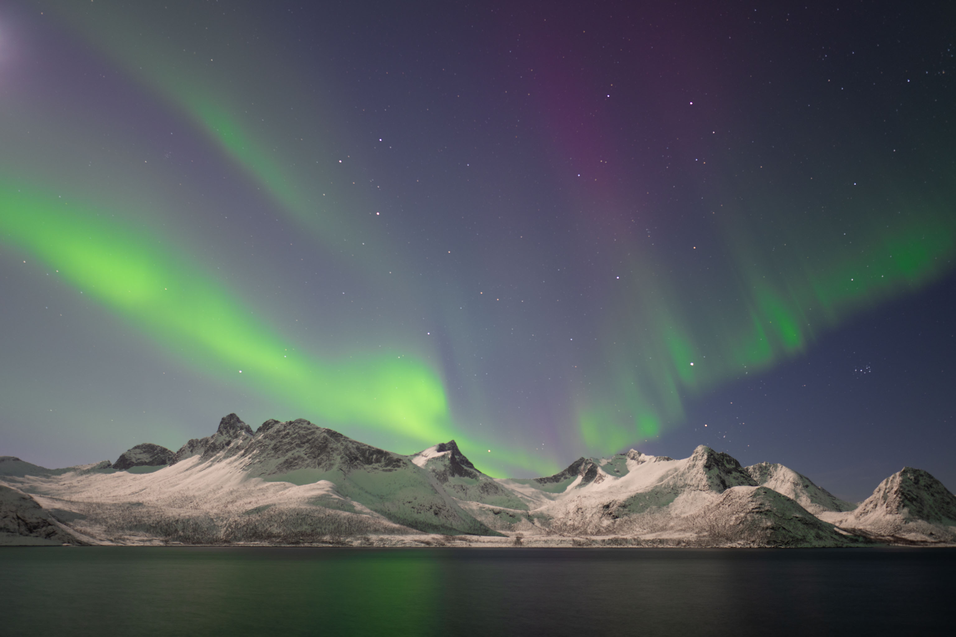 Normalerweise kommen die Farben von Polarlichtern auf einem langzeitbelichteten Foto deutlich kräftiger raus, als man sie mit bloßem Auge sieht. Vergangene Nacht war das über längere Zeit anders.