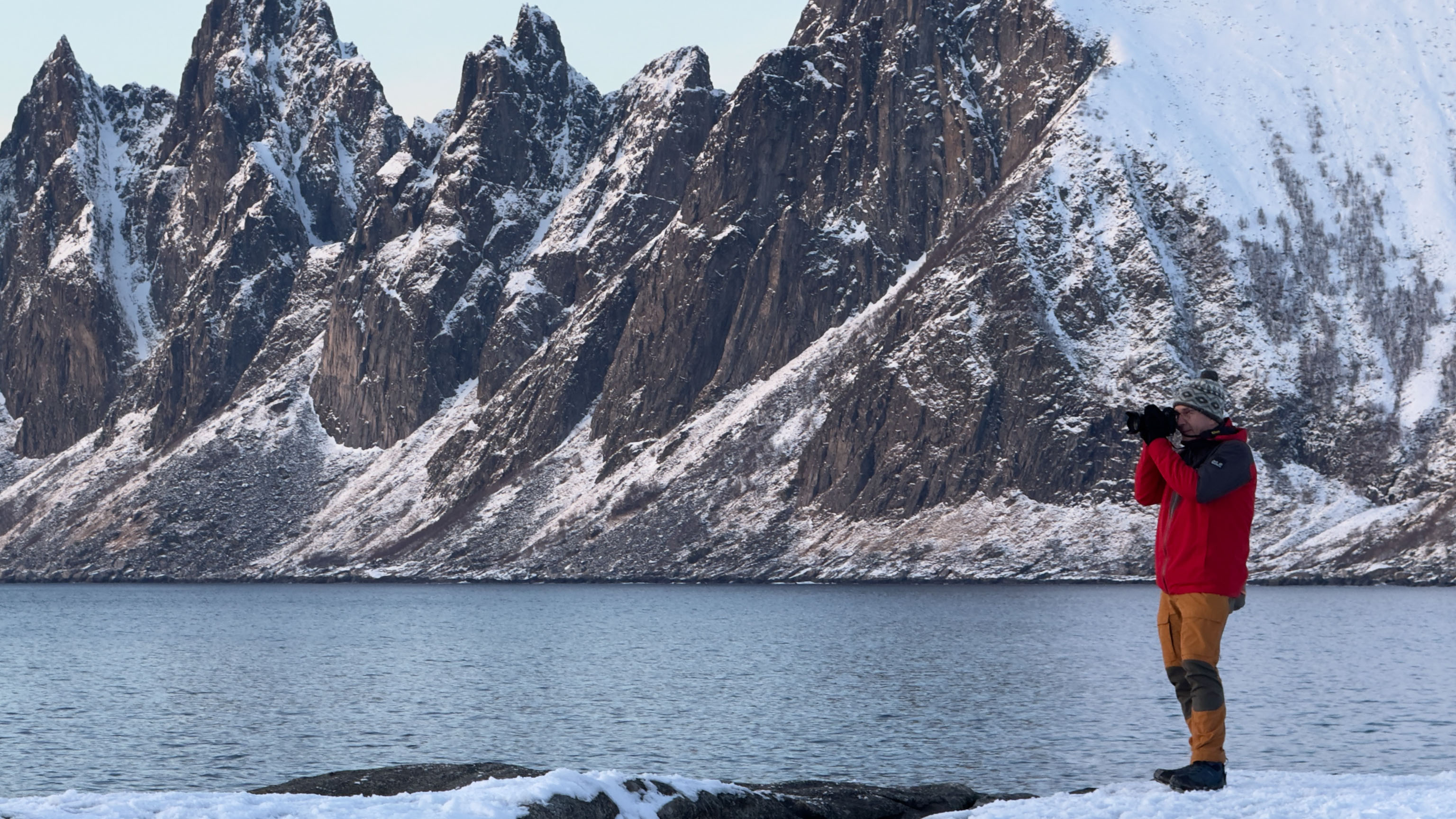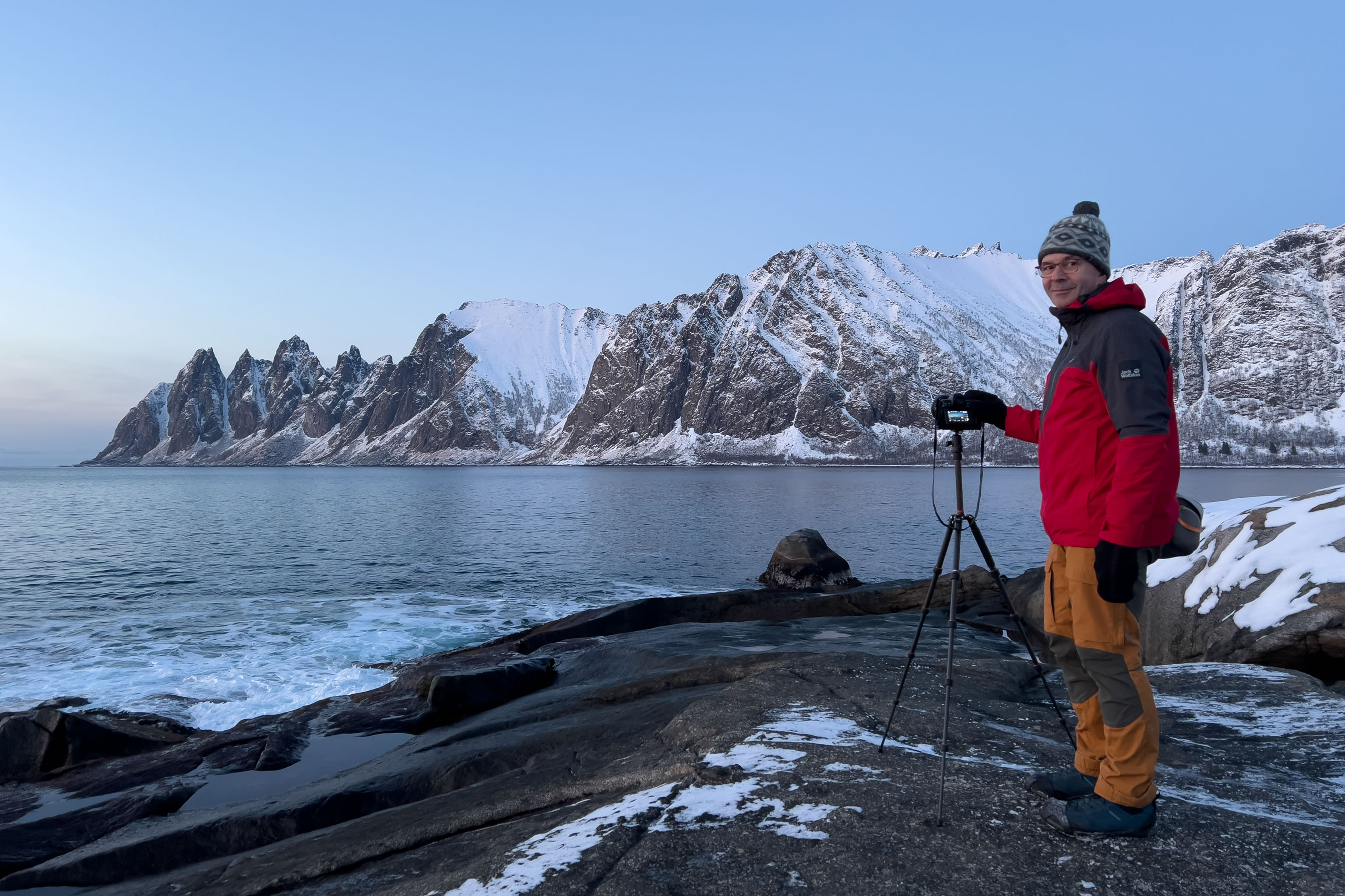 Maria hat übrigens auch heute wieder ein bisschen nebenher gefilmt – allerdings nicht vom Schluss mit den Polarlichtern über den Teufelszähnen, denn sonst hätte es das Titelfoto, wie ich genau diese Szene fotografiere, nicht gegeben.