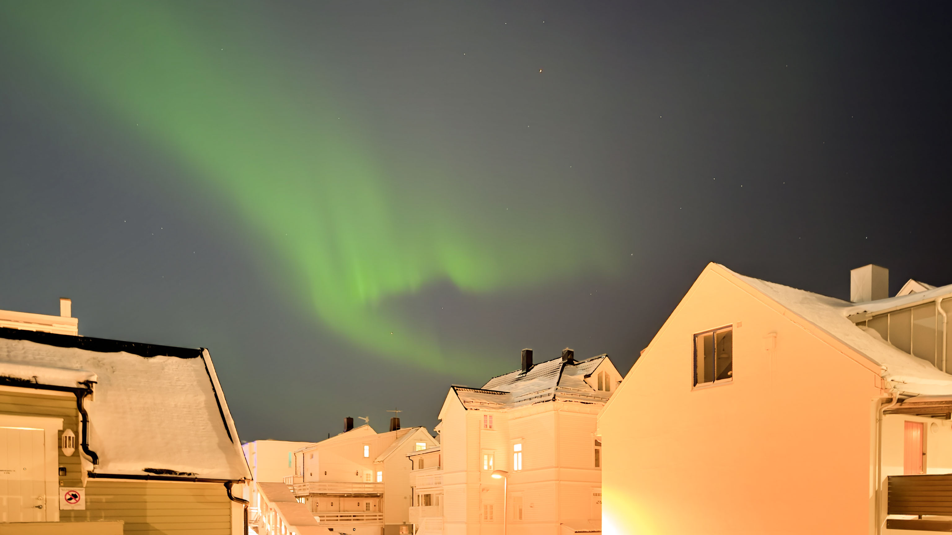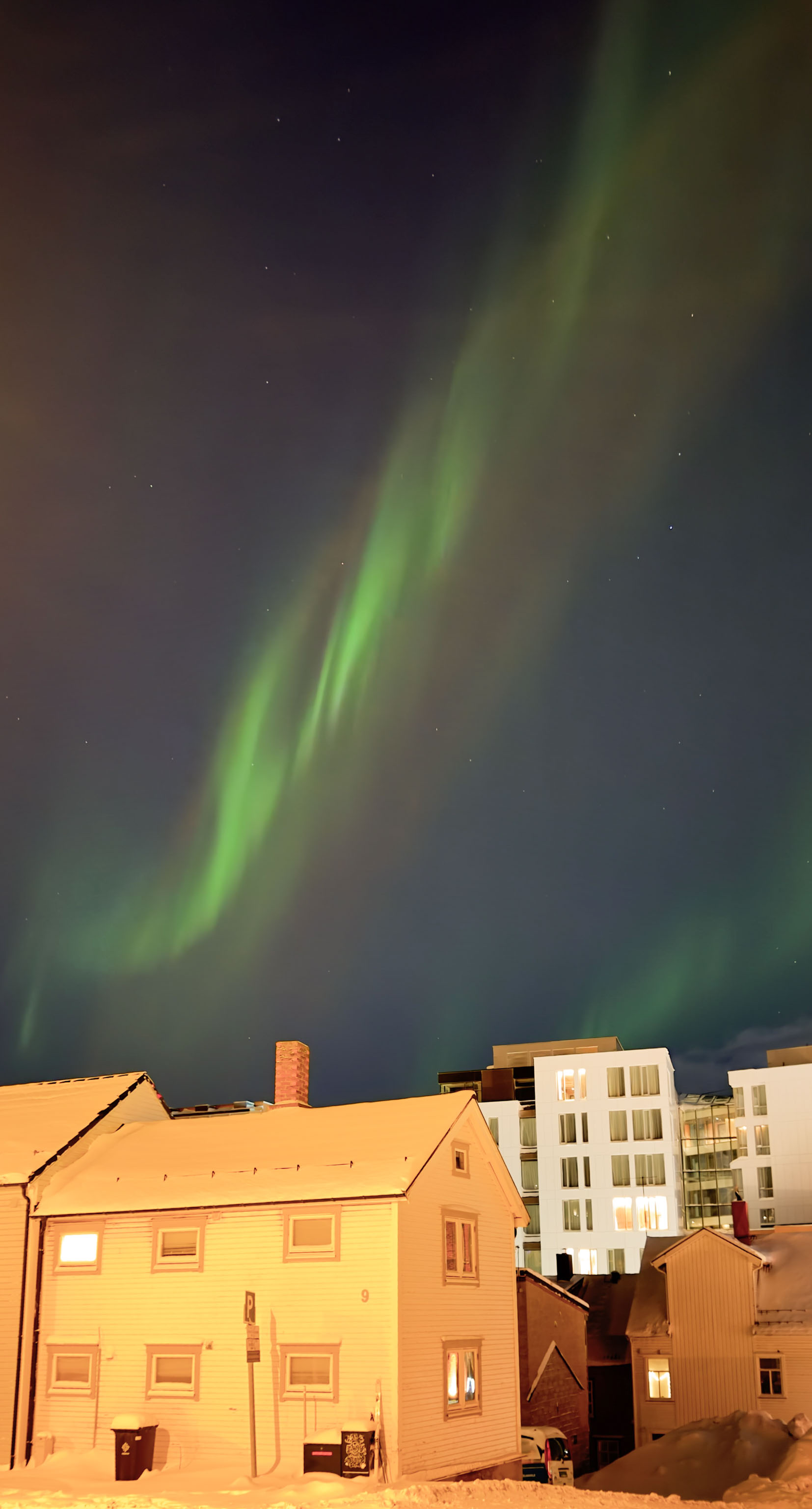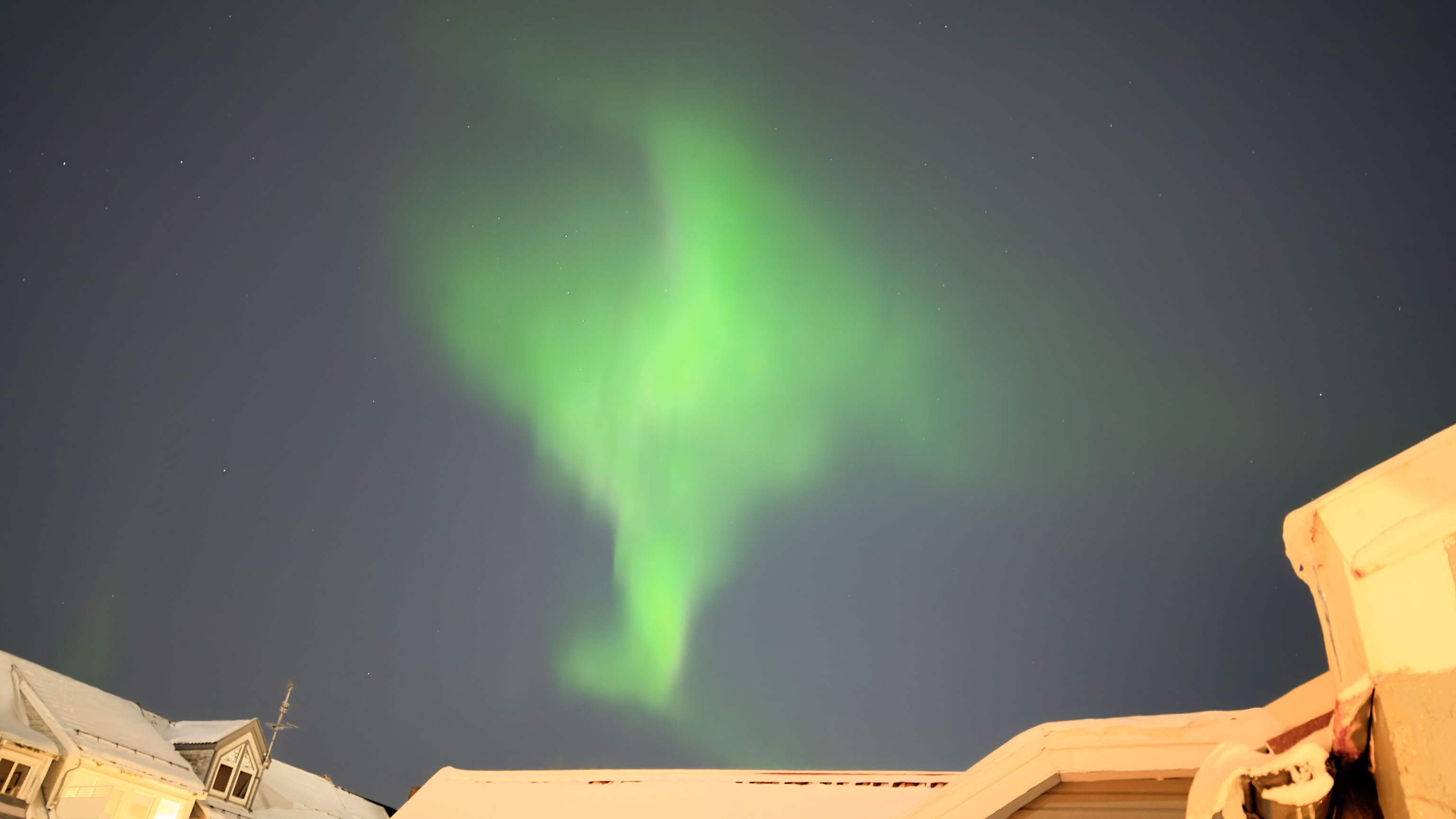 Auf der anderen Seite waren die Polarlichter über Tromsø in der vergangenen Nacht gar nicht so schlecht – besonders wenn man bedenkt, dass wir hier mitten in einer Stadt mit all ihrer Lichtverschmutzung sind und wenn man weiß, wie das Wetter noch wenige Stunden vorher gewesen ist (s. vorheriger Blogeintrag). Dafür sind wir aber auch bis Dreiviertel zwei aufgeblieben.