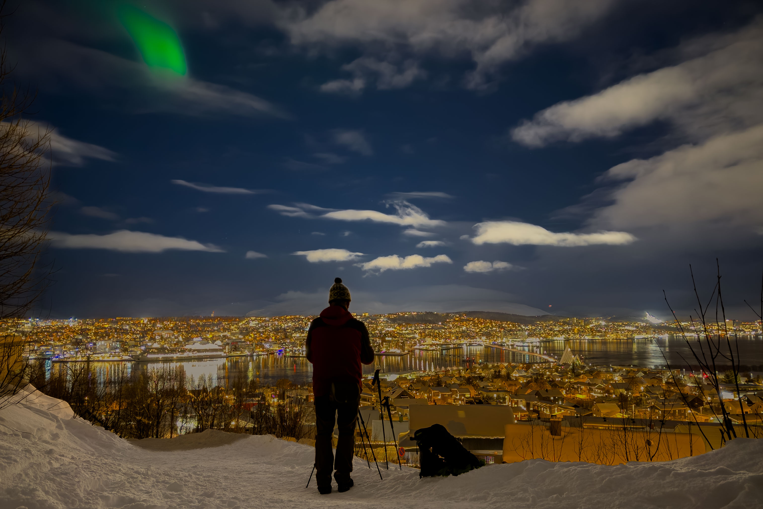 Die Chancen darauf waren zwar begrenzt, aber der nächtliche Blick vom Hang oberhalb von Tromsdalen auf Tromsø ist es auch wert, da hinaufzusteigen.
