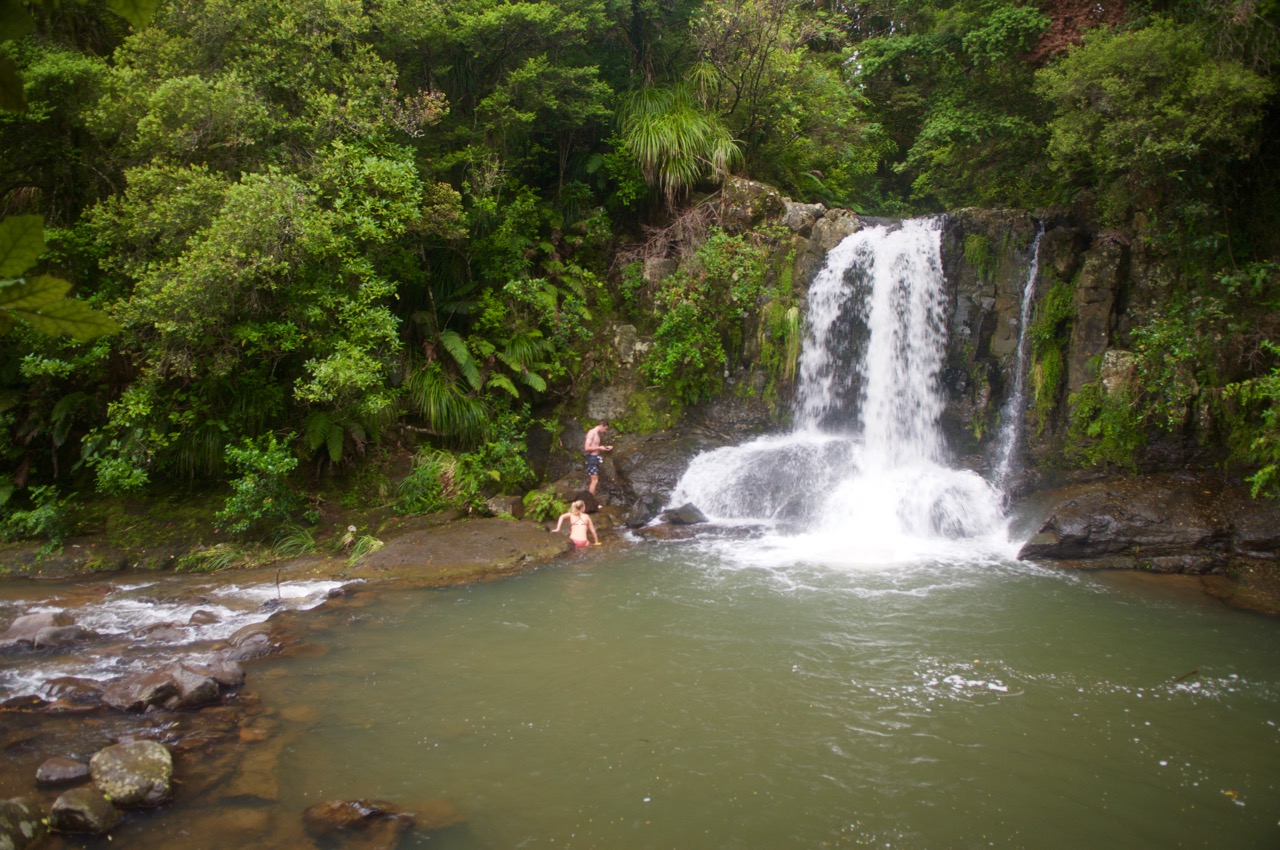 Übernachtet haben wir dann mitten im Busch in den Rapaura Watergardens. Aus unserer sehr großzügigen Lodge hatten wir perfekten Blick auf den Regenwald, einen malerischen Bach und in Hörweite gab es einen Wasserfall. Während der Tag bewölkt aber trocken war, regnete es am Abend und in der Nacht so stark, dass wir nicht einmal den Wasserfall mehr hören konnten. So war es der beste Abschluss unserer Tour, den wir uns wünschen konnten: Bei Sturm in einer komfortablen Lodge mitten im Regenwald mit bester Aussicht auf diesen.