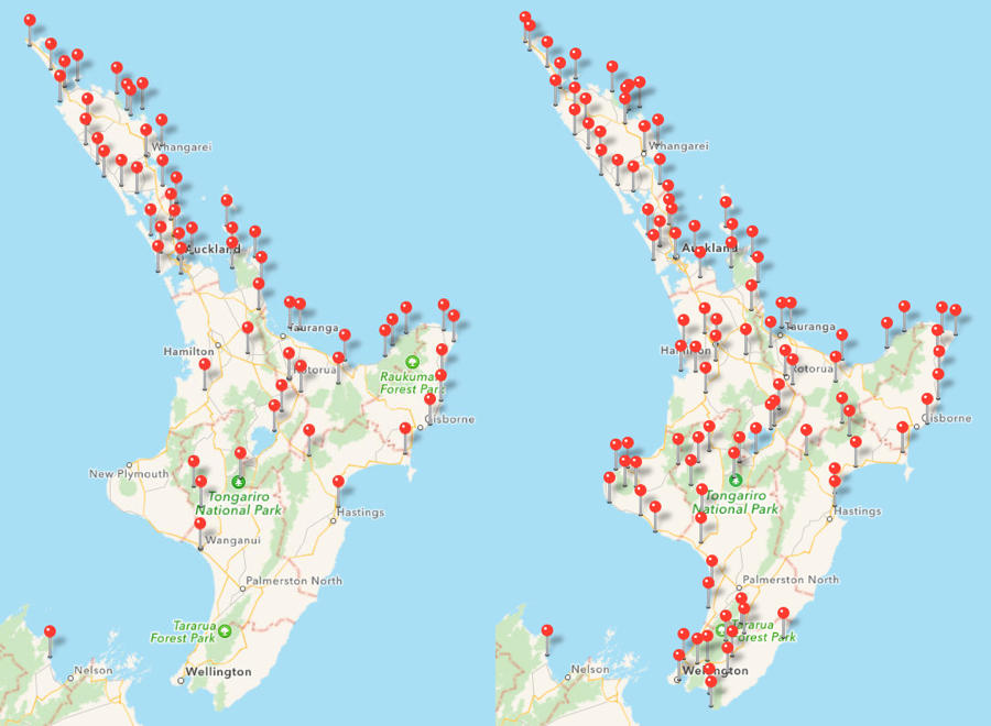 Ansonsten könnt Ihr auf dem folgenden Bild unsere Reiseroute im Überblick sehen und darunter gibt es den Vorher-Nachher-Vergleich, wo wir vor und nach diesem Urlaub auf der Nordinsel Neuseelands überall fotografiert haben. Wie Ihr daran sehen könnt, sind die "weißen Flecken" auf der Landkarte deutlich kleiner geworden, so dass wir überlegen, dass es das nächste Mal eher auf die Südinsel gehen wird.