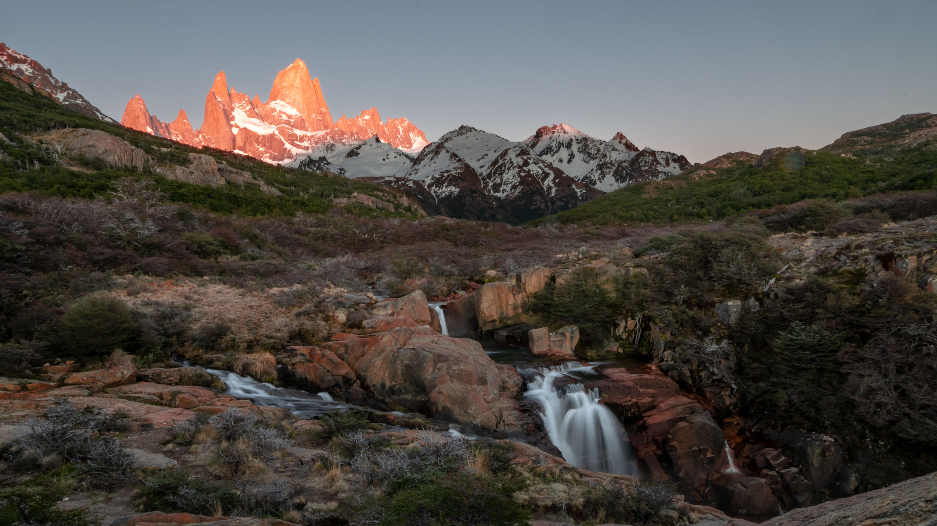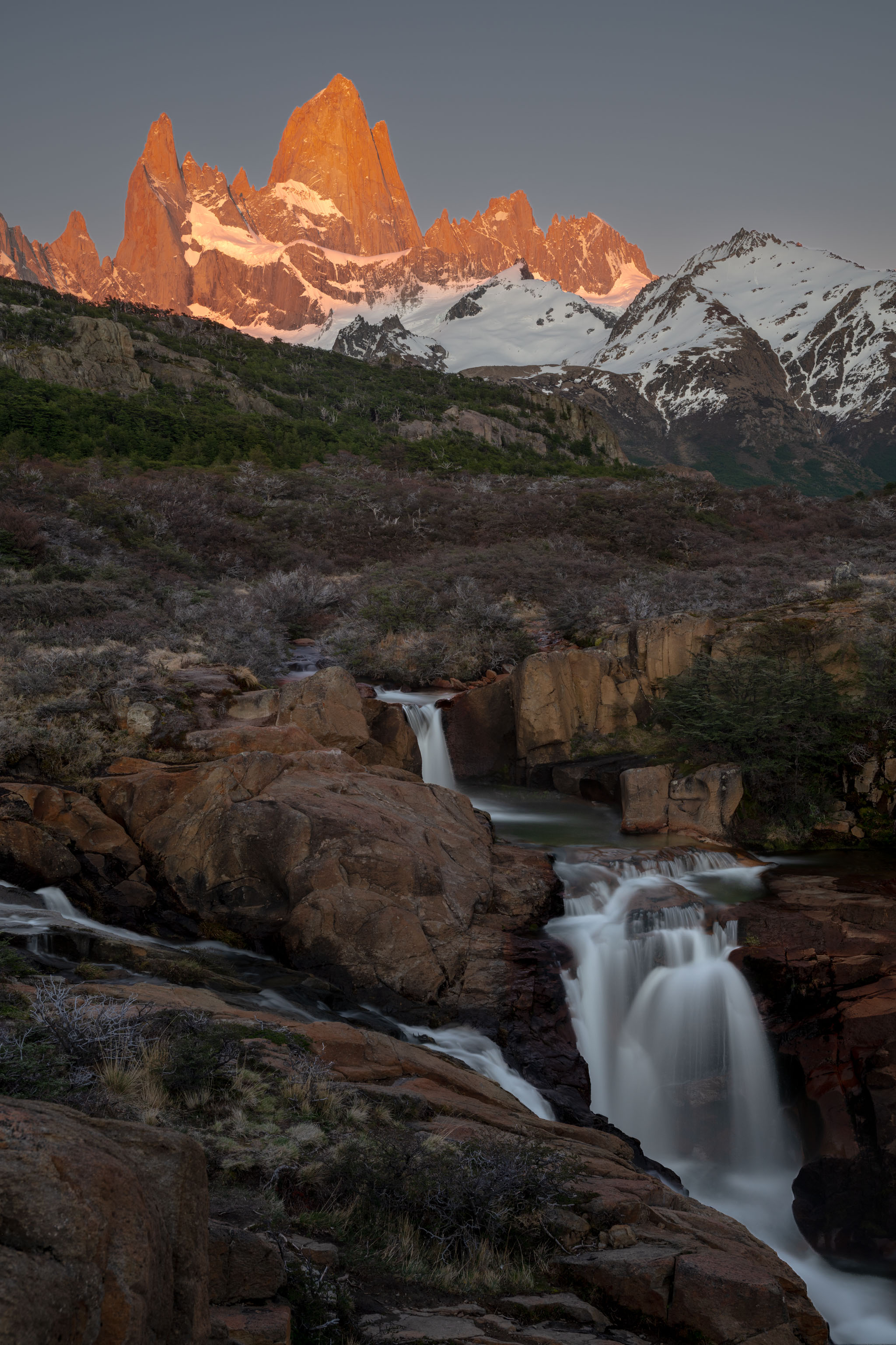 Um 2:30 Uhr klingelte heute der Wecker, damit wir rechtzeitig zum Sonnenaufgang um 6:12 Uhr an diesem versteckten Wasserfall mit Blick auf den Fitz Roy waren.