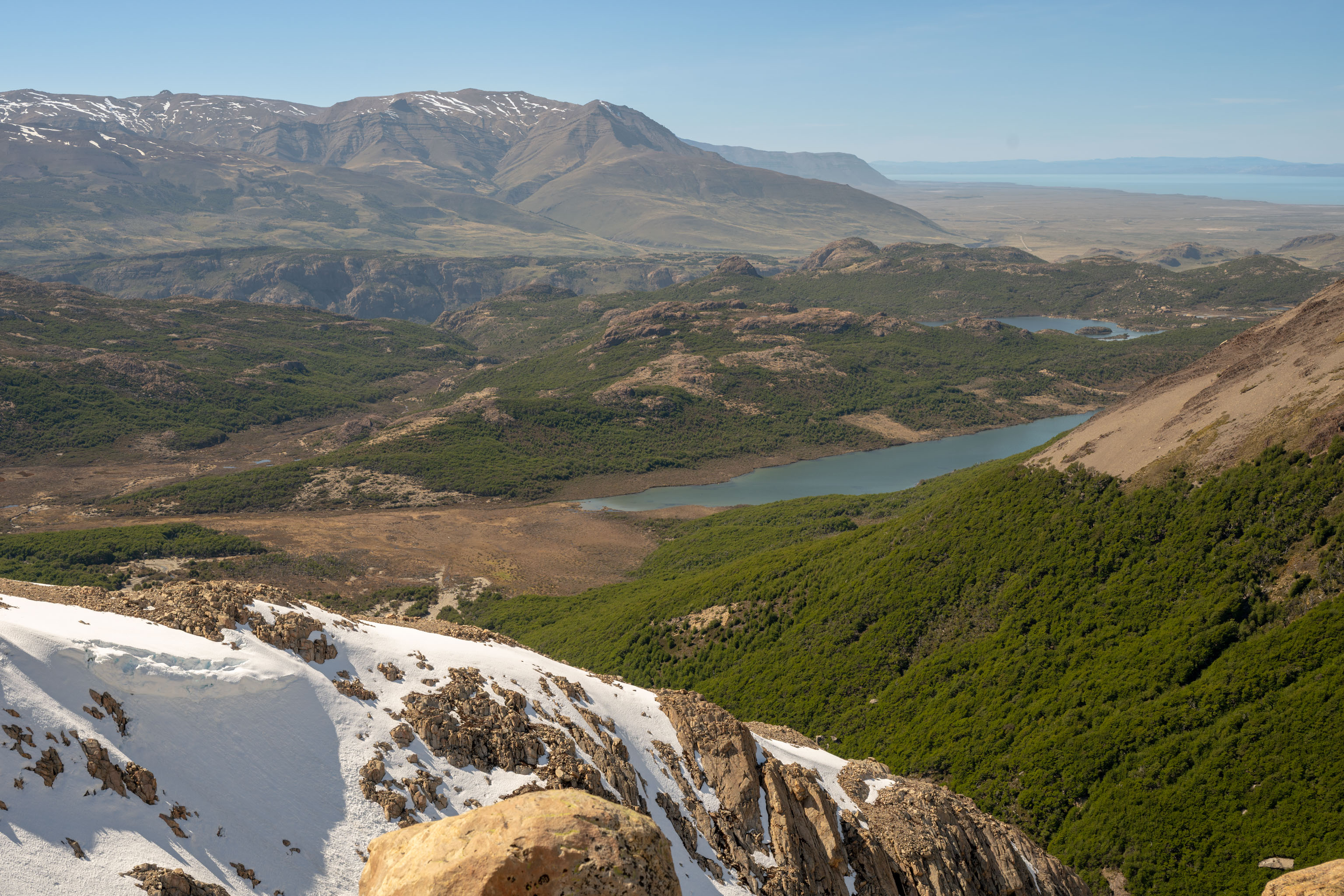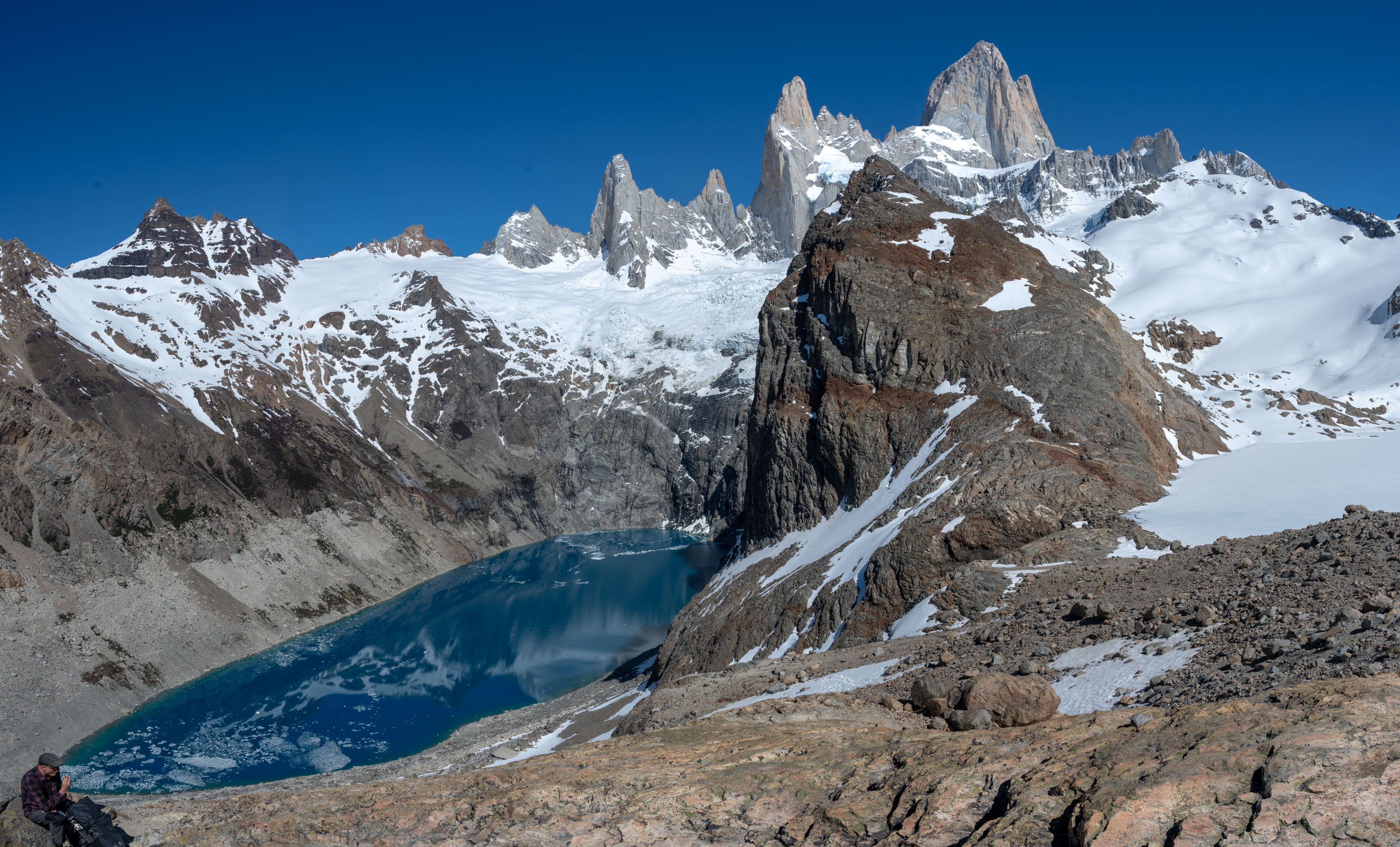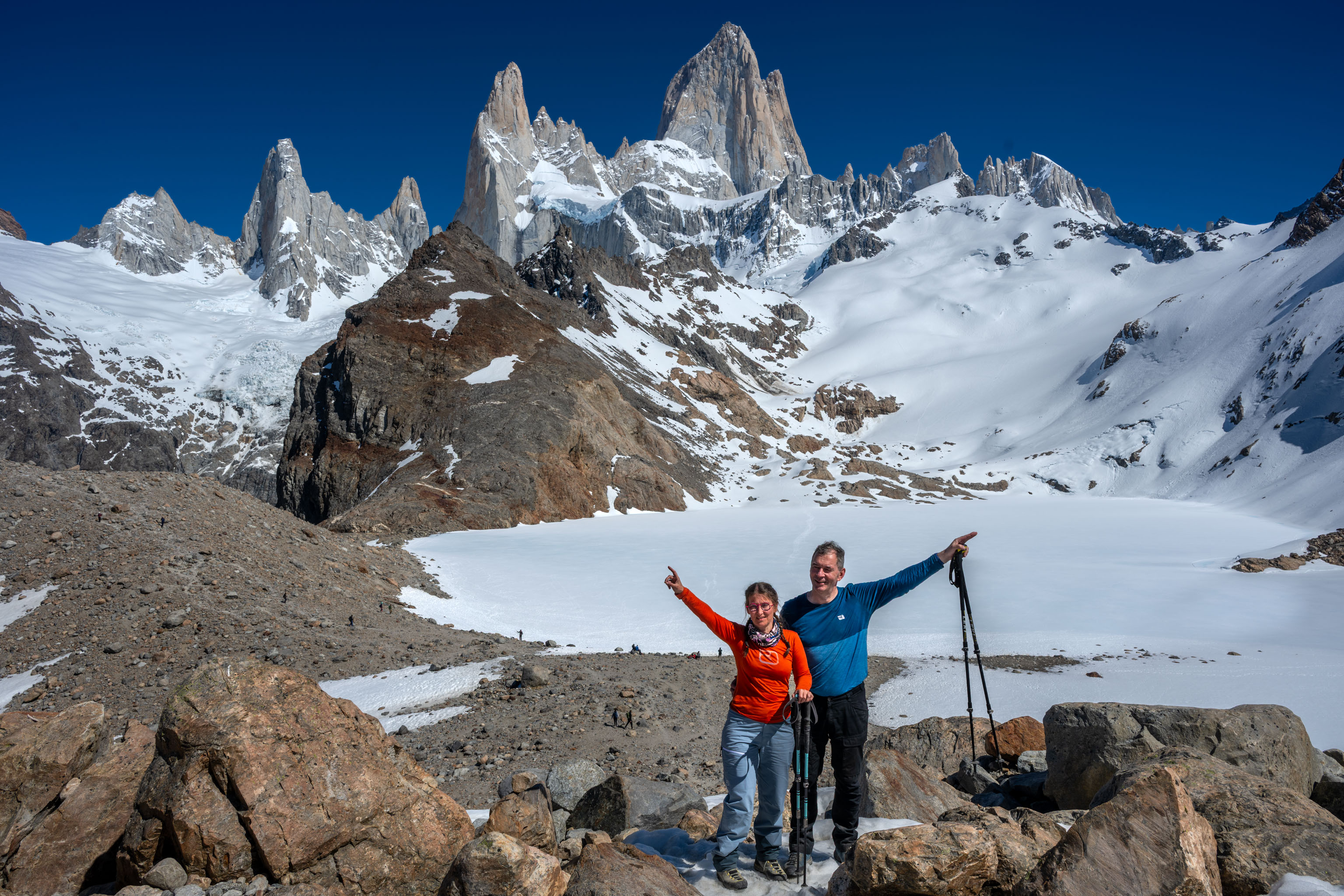 Das kostete uns ein paar Kilometer Umweg und einiges an Zeit, aber wir konnten doch noch zum zweiten Teil unserer Tour aufbrechen, zur (noch zugefrorenen) Laguna de los Tres am Fuße des Fitz Roys. Da ging es am Schluss noch einmal richtig steil hoch und über ein Schneefeld. Ich bin dann zusätzlich noch zur Lagune abgestiegen und weiter zum zweiten See gewandert.