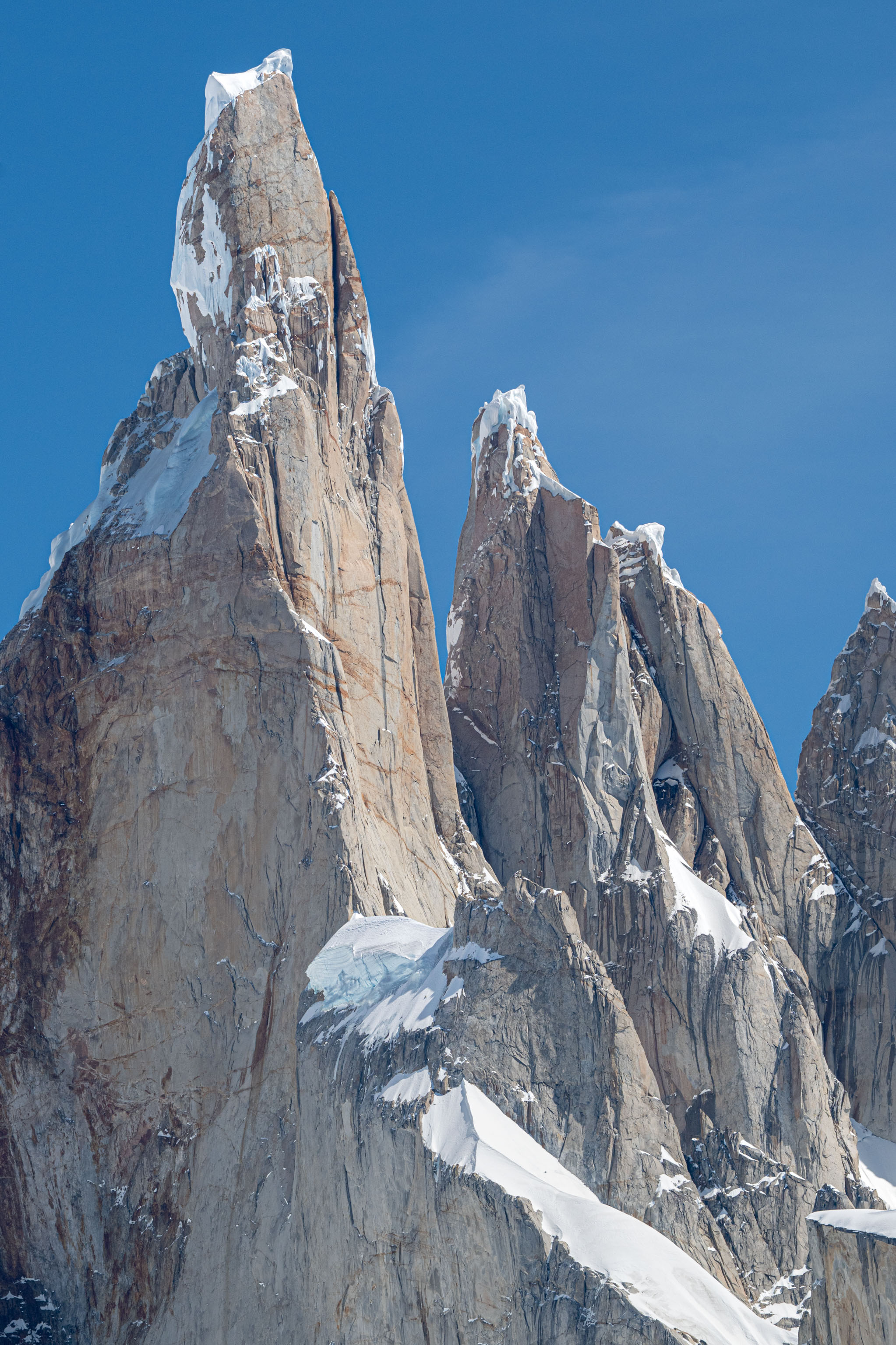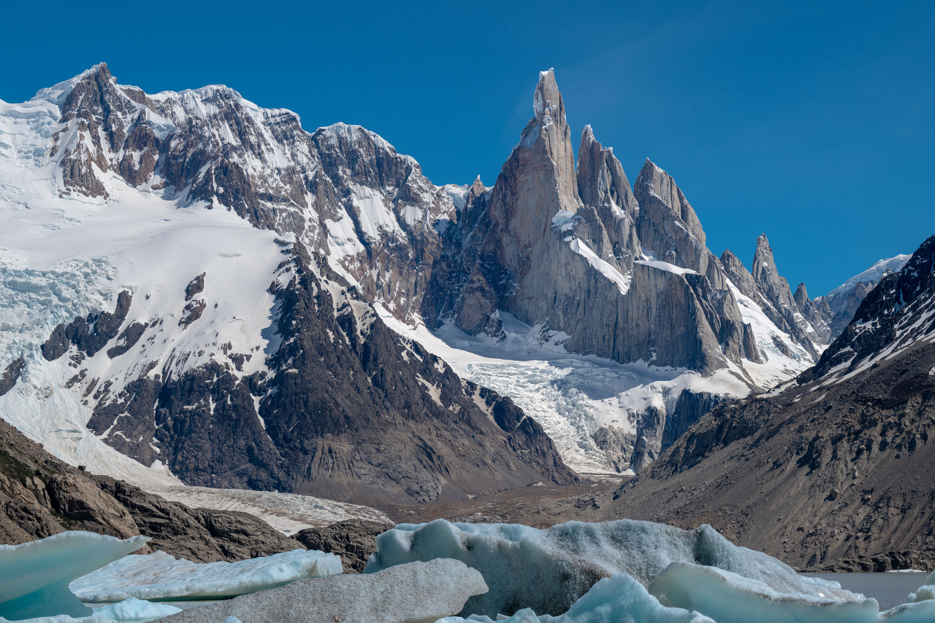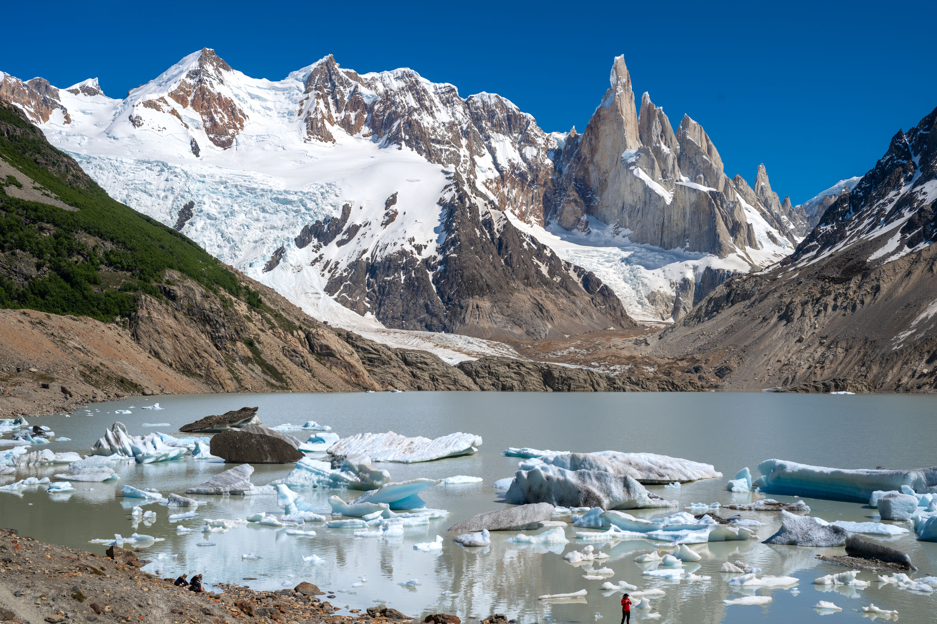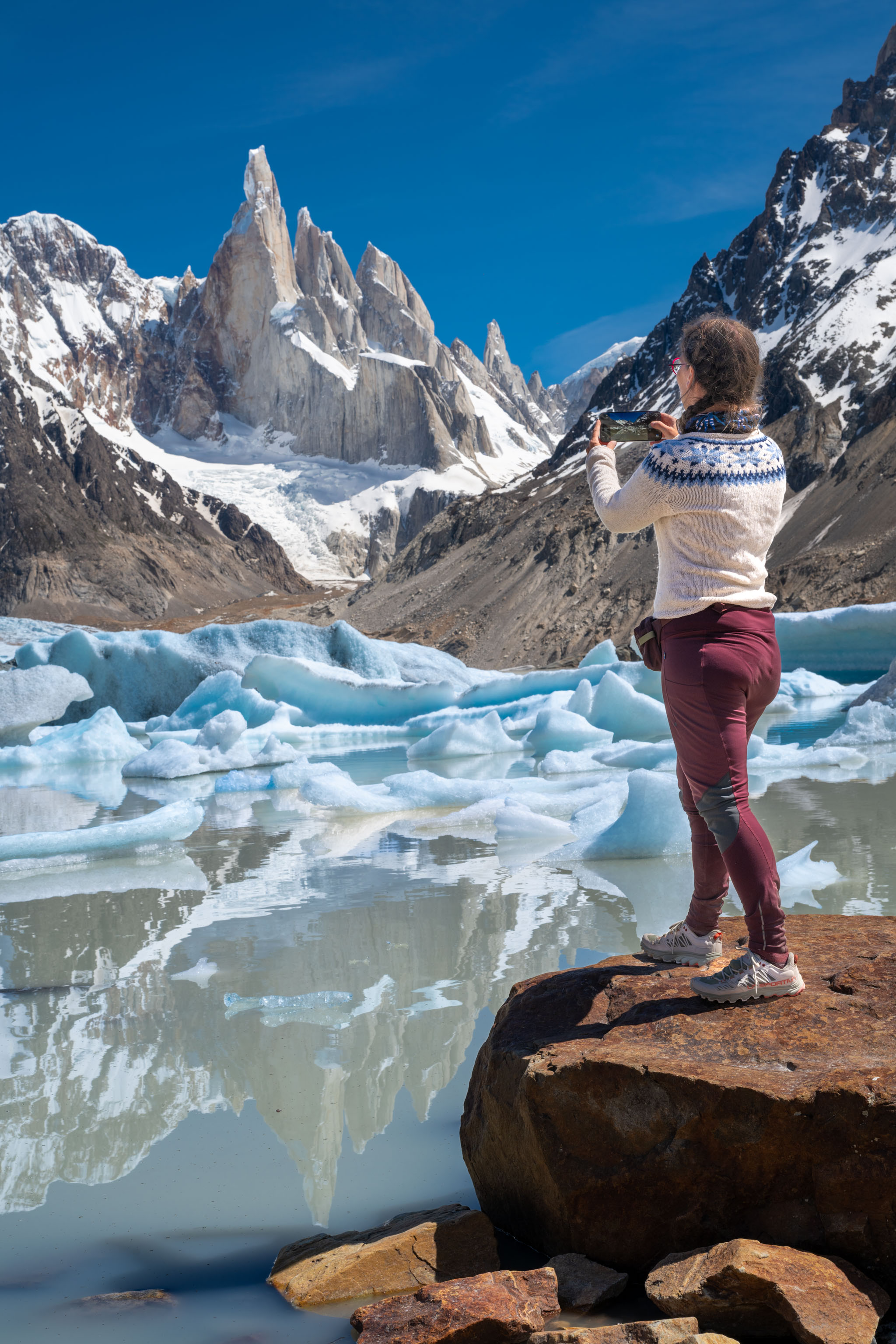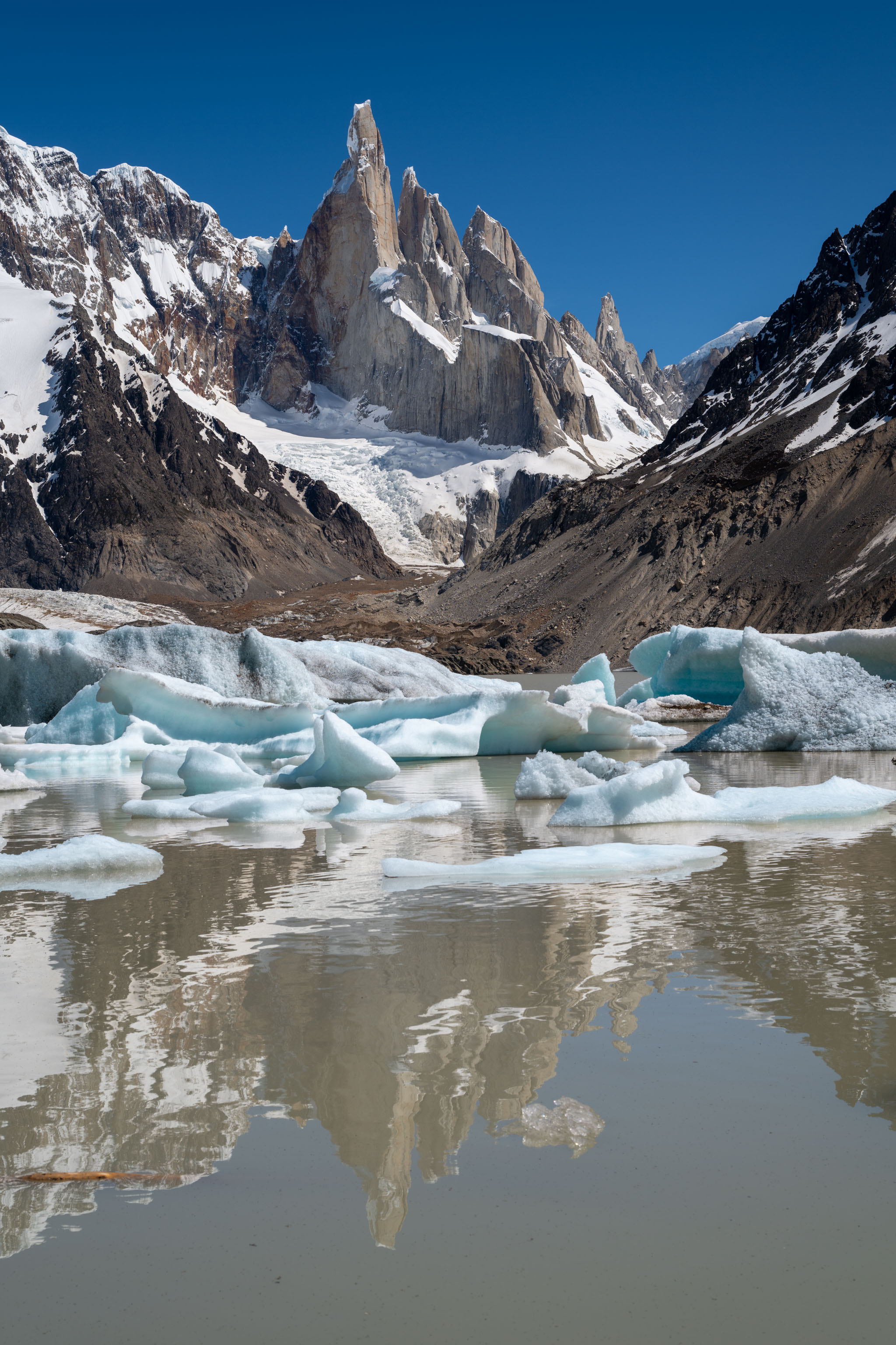 In der Lagune schwimmen eine ganze Menge an kleinen Eisbergen von den Gletschern, die rechts und links vom Cerro Torre herunterfließen und in die Laguna kalben.