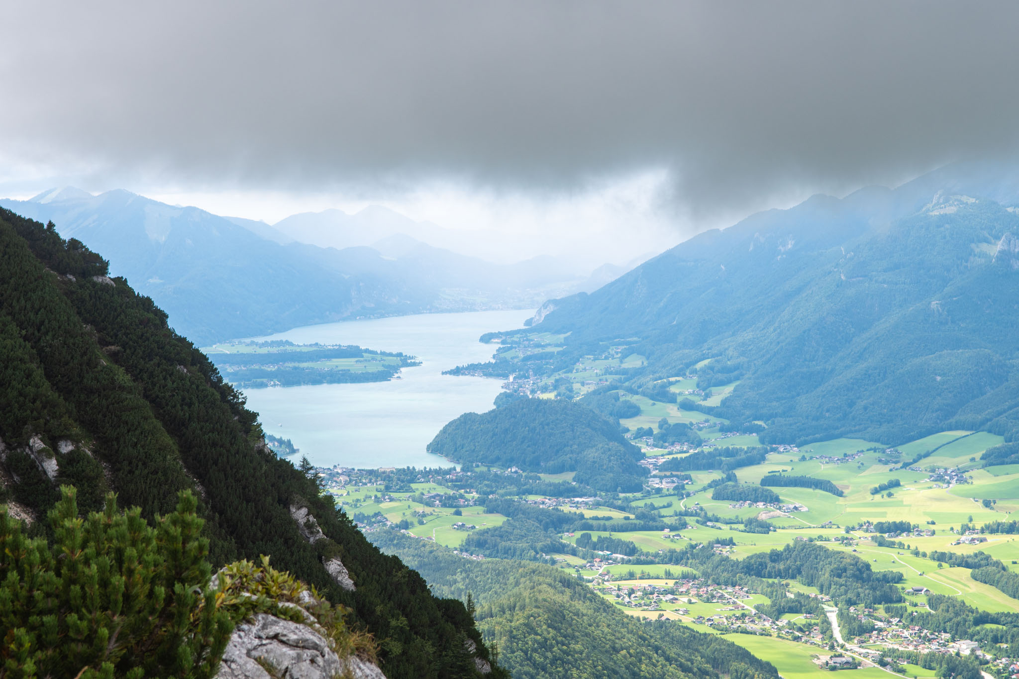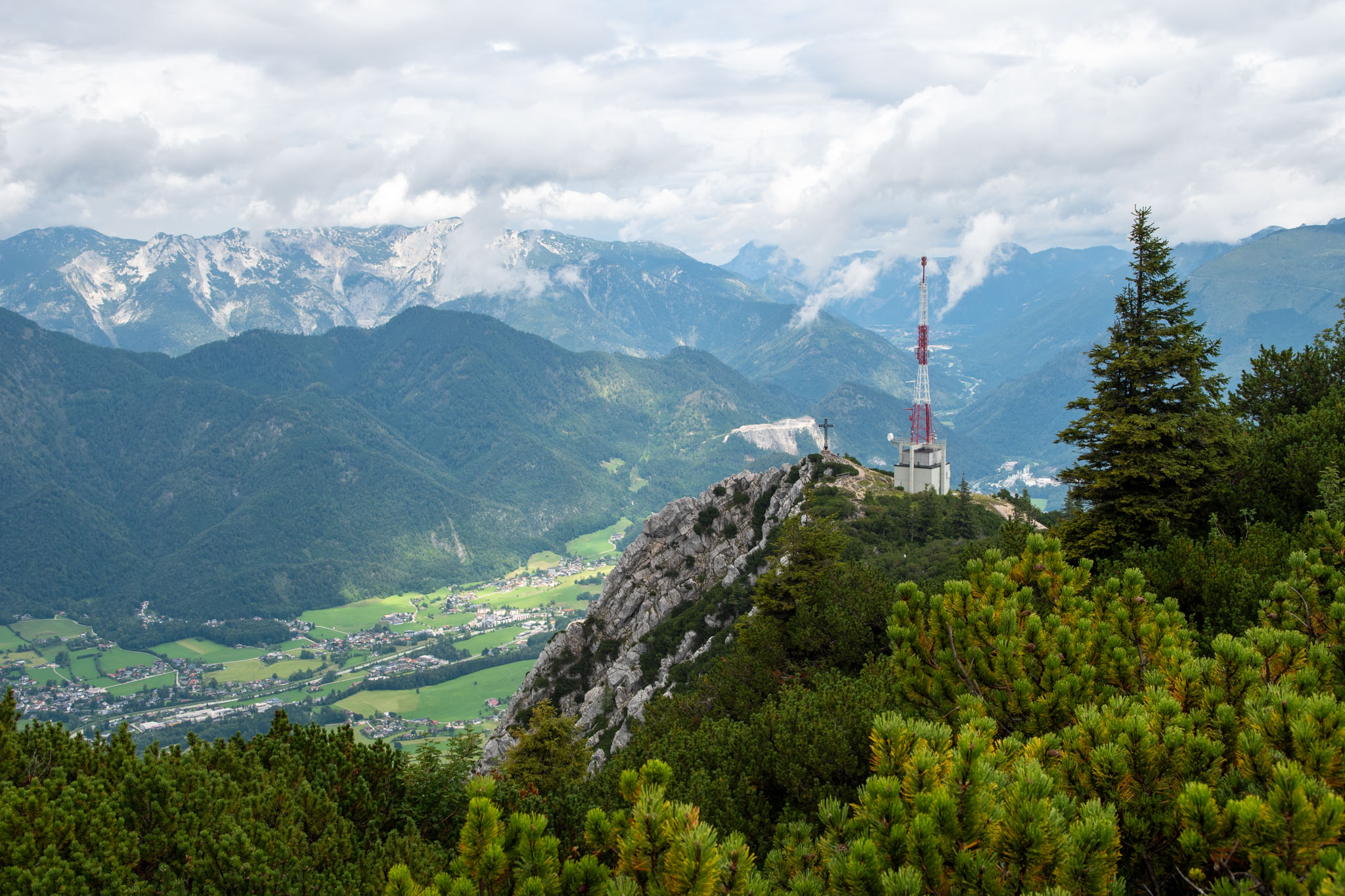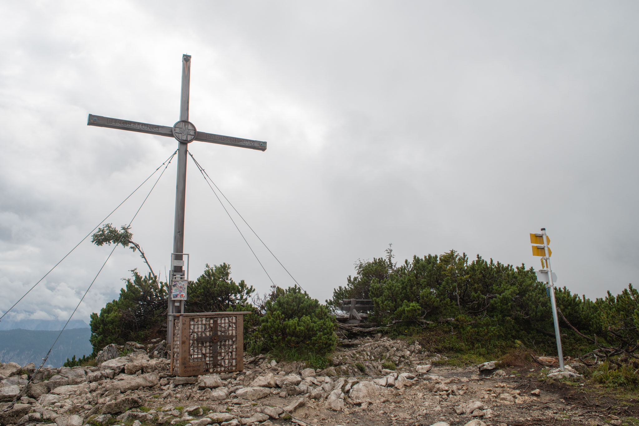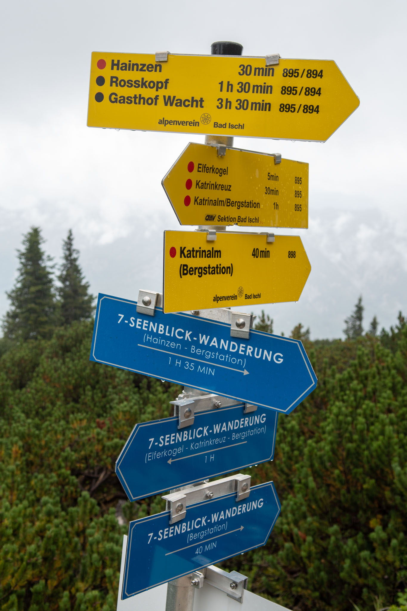 Während Mia und Julia den Katringipfel auf dem Klettersteig in Angriff genommen haben, wollte ich die 7-Seenblick-Wanderung dorthin machen und mich am Gipfel wieder mit den beiden treffen. Bereits wenige Minuten nach dem Start der Tour war klar, dass der Titel eine Mogelpackung werden wird, denn es fing kräftig zu regnen an und von den gegenüberliegenden Bergen und den Seen im Tal war nicht mehr viel zu sehen. Nachdem der erste Teil des Weges auch noch ausgesetzt war und mir nicht klar war, wie lange das noch so weitergehen wird, bin ich irgendwann umgekehrt und bin den Rundweg in umgekehrter Richtung gegangen. Da man wandernd natürlich schneller unterwegs ist als im Klettersteig, konnte ich trotzdem einen ordentlichen Teil des Weges gehen. Von den drei Gipfeln (Katrin, Elferkogel und Hainzen) musste ich nur auf den Hainzen verzichten, bevor ich zurück zum Katrin-Gipfel musste. Dort bin ich dann perfekt gleichzeitig mit Mia und Julia angekommen. Mit der Seilbahn ging es dann gemeinsam wieder zurück ins Tal nach Bad Ischl.