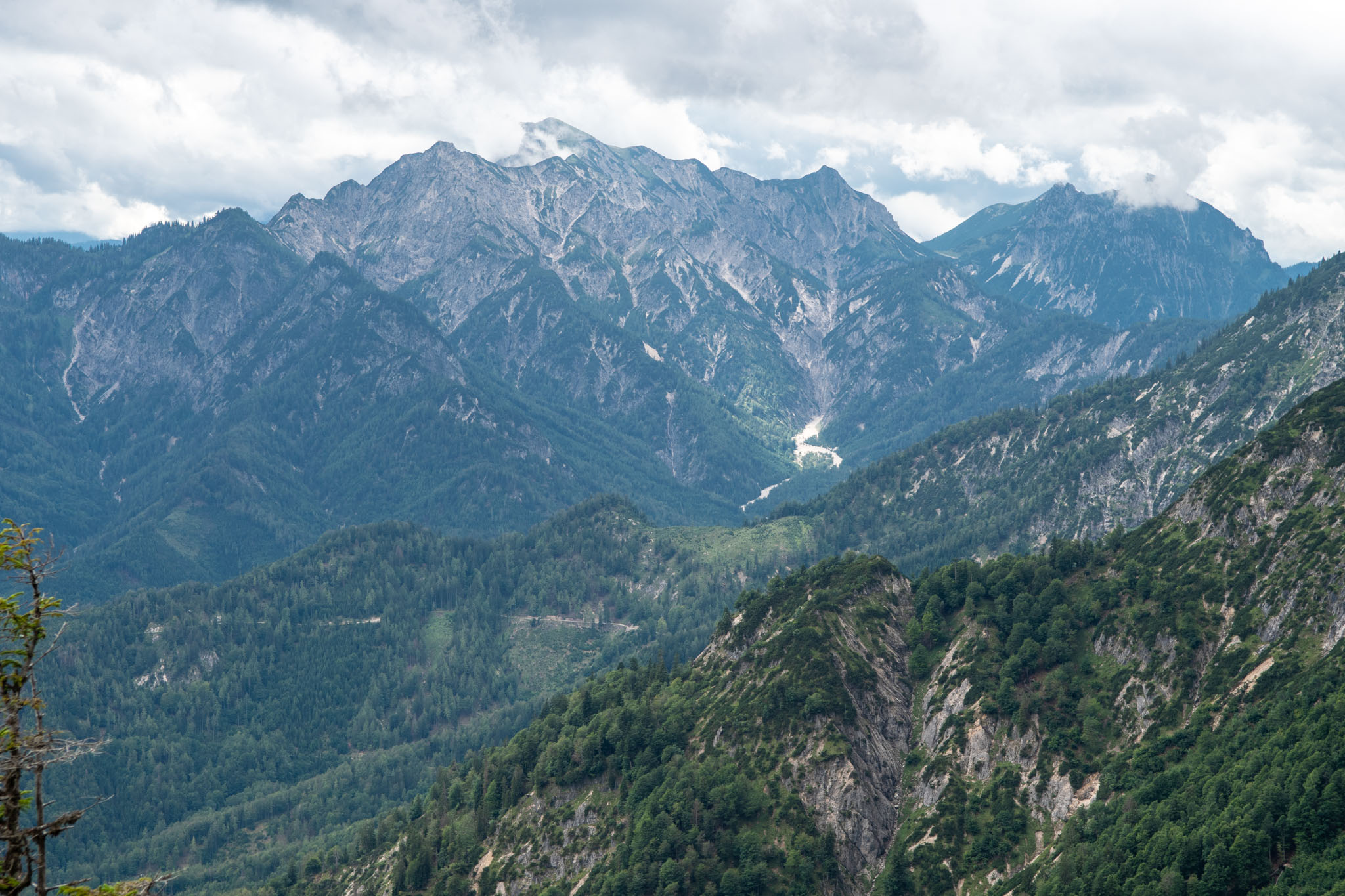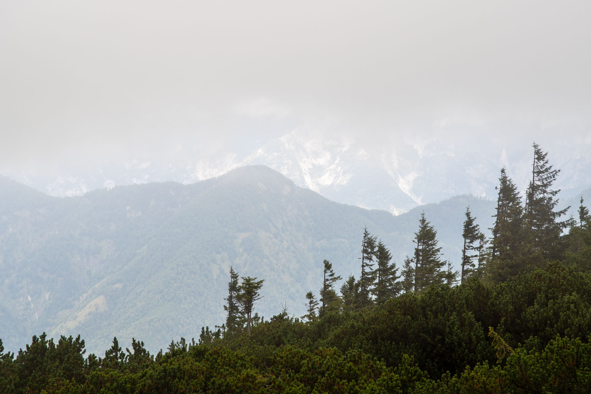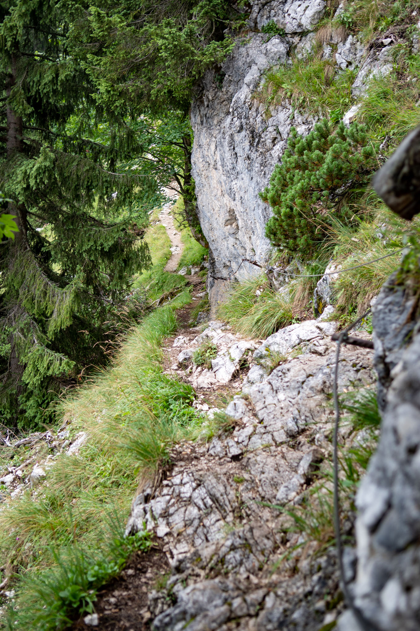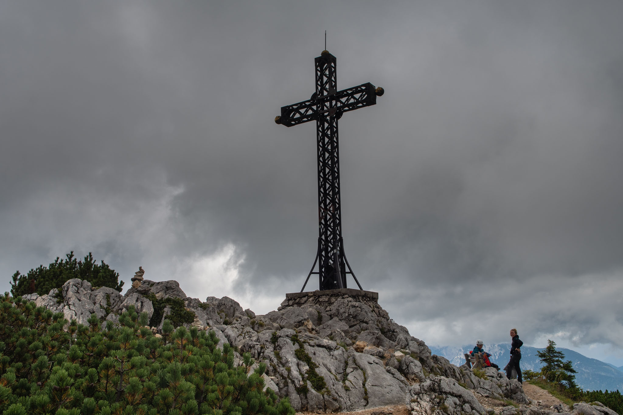 Während Mia und Julia den Katringipfel auf dem Klettersteig in Angriff genommen haben, wollte ich die 7-Seenblick-Wanderung dorthin machen und mich am Gipfel wieder mit den beiden treffen. Bereits wenige Minuten nach dem Start der Tour war klar, dass der Titel eine Mogelpackung werden wird, denn es fing kräftig zu regnen an und von den gegenüberliegenden Bergen und den Seen im Tal war nicht mehr viel zu sehen. Nachdem der erste Teil des Weges auch noch ausgesetzt war und mir nicht klar war, wie lange das noch so weitergehen wird, bin ich irgendwann umgekehrt und bin den Rundweg in umgekehrter Richtung gegangen. Da man wandernd natürlich schneller unterwegs ist als im Klettersteig, konnte ich trotzdem einen ordentlichen Teil des Weges gehen. Von den drei Gipfeln (Katrin, Elferkogel und Hainzen) musste ich nur auf den Hainzen verzichten, bevor ich zurück zum Katrin-Gipfel musste. Dort bin ich dann perfekt gleichzeitig mit Mia und Julia angekommen. Mit der Seilbahn ging es dann gemeinsam wieder zurück ins Tal nach Bad Ischl.