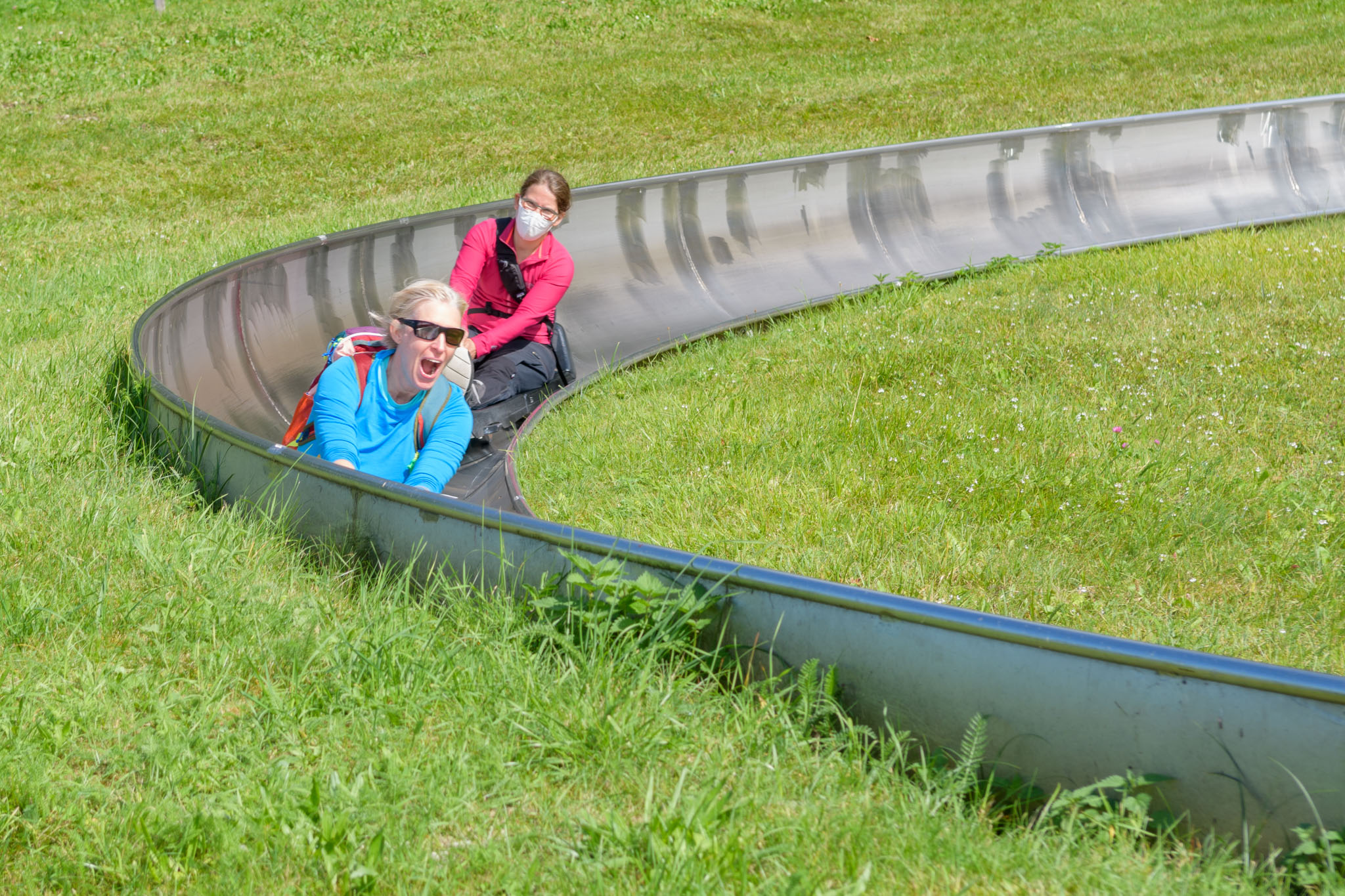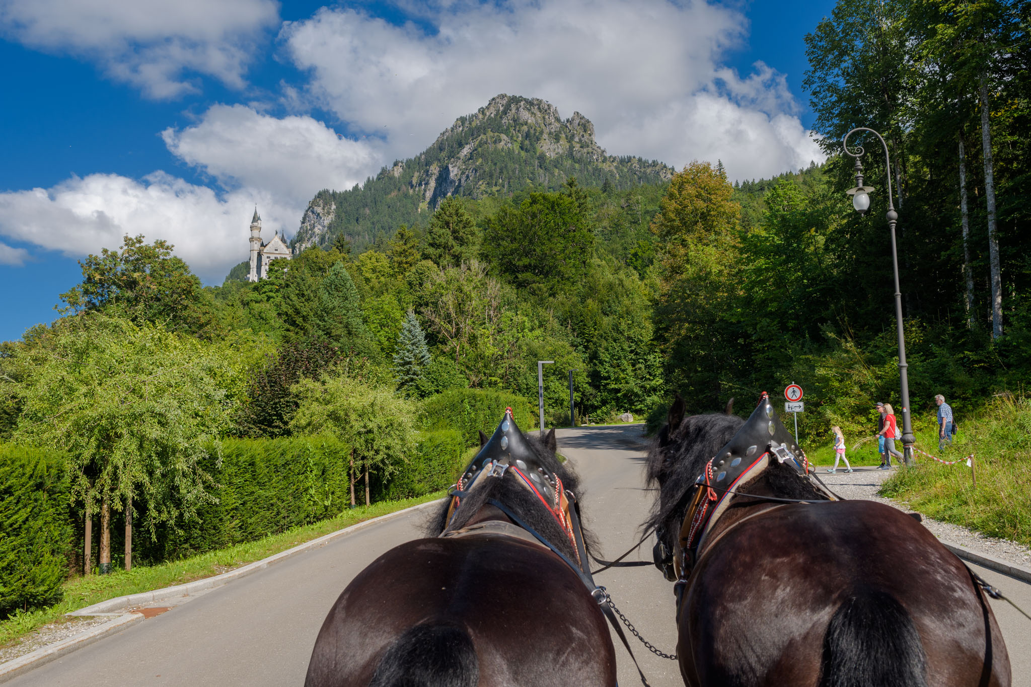 Am Mittwoch sind wir dann bei schönstem Sommerwetter zunächst um den Alpsee gewandert. Anschließend haben wir die Sommerrodelbahn an der Tegelbergbahn bei Schwangau ausprobiert und am späten Nachmittag stand noch der Besuch mit Führung im Schloss Neuschwanstein an. Im Online-Buchungsportal waren alle Führungen bis Mitte September komplett ausgebucht, aber über unser Hotel haben wir doch noch Eintrittskarten bekommen. Wegen Corona können derzeit an jeder Führung nur zehn Personen teilnehmen (sonst sind es wohl 50). Die breite Masse der internationalen Touristen fehlte pandemiebedingt, so dass zwar schon etliche Touristen vor Ort waren, jedoch bei Weitem nicht die Menschenmassen und riesigen Schlangen, die man von Bildern vor Corona kennt. Im Schloss selbst ist das Fotografieren verboten, so dass es nur Fotos von der Fahrt mit der Pferdekutsche hoch zum Schloss und dann oben von der Aussicht und dem Innenhof gibt.