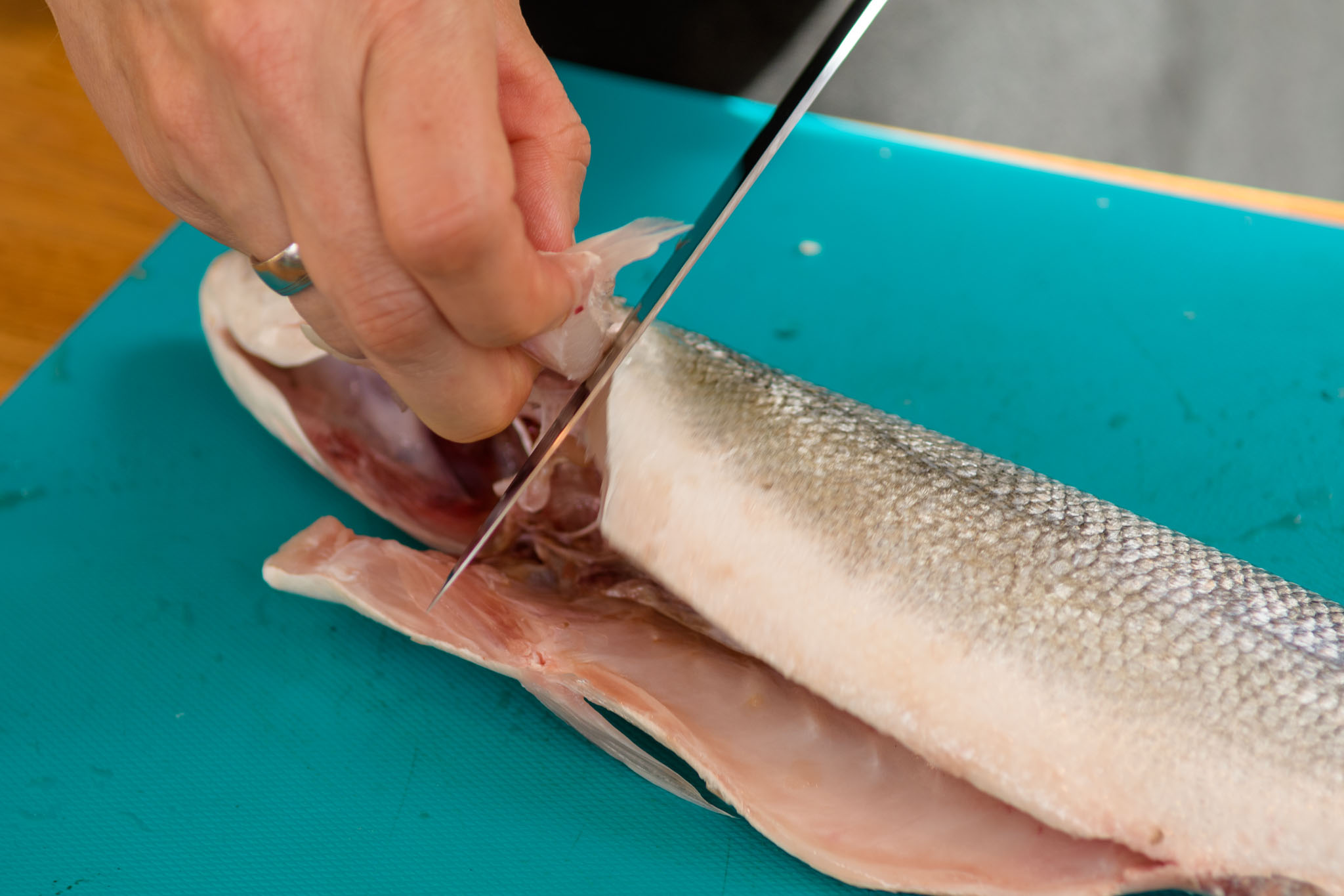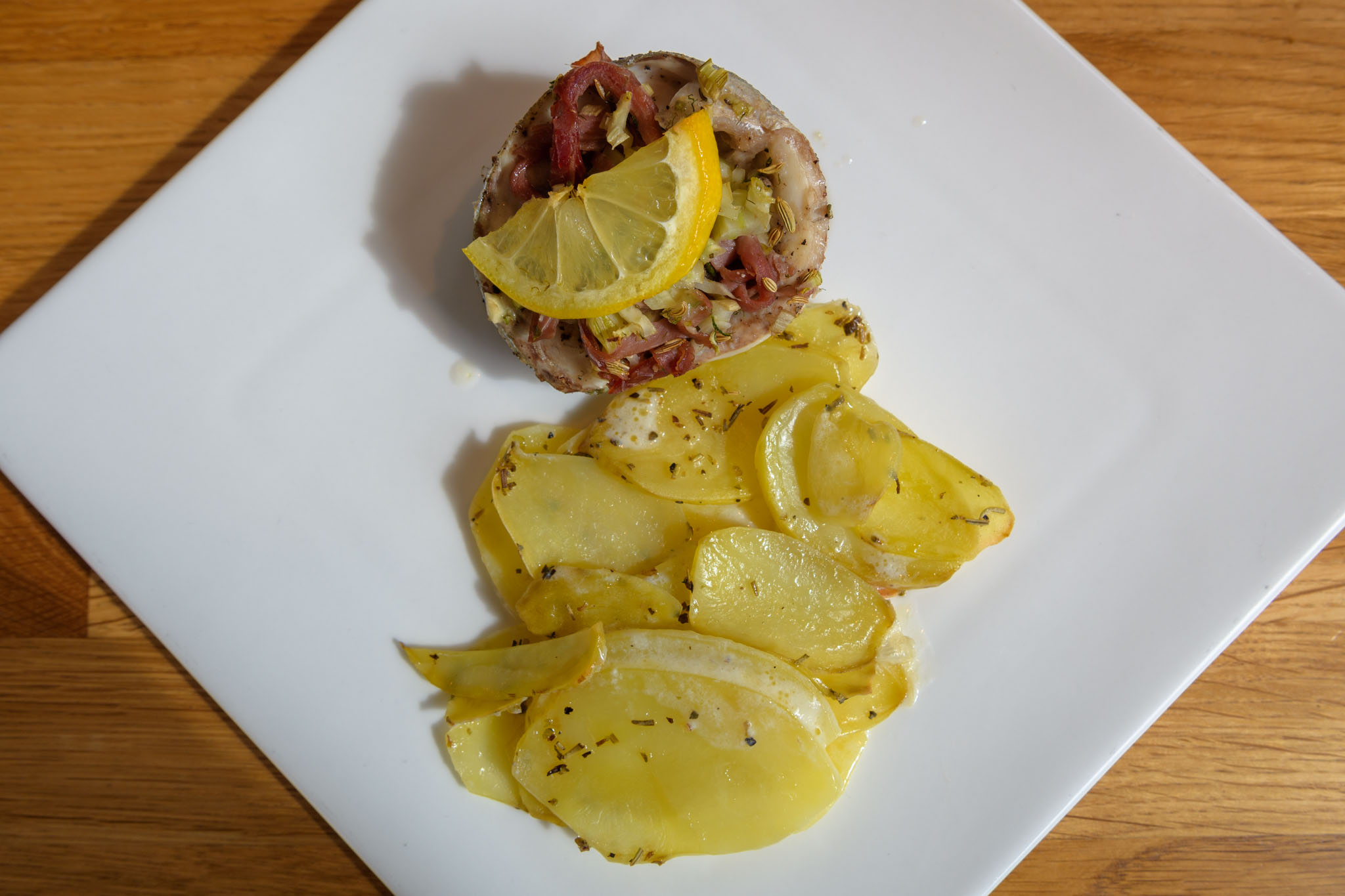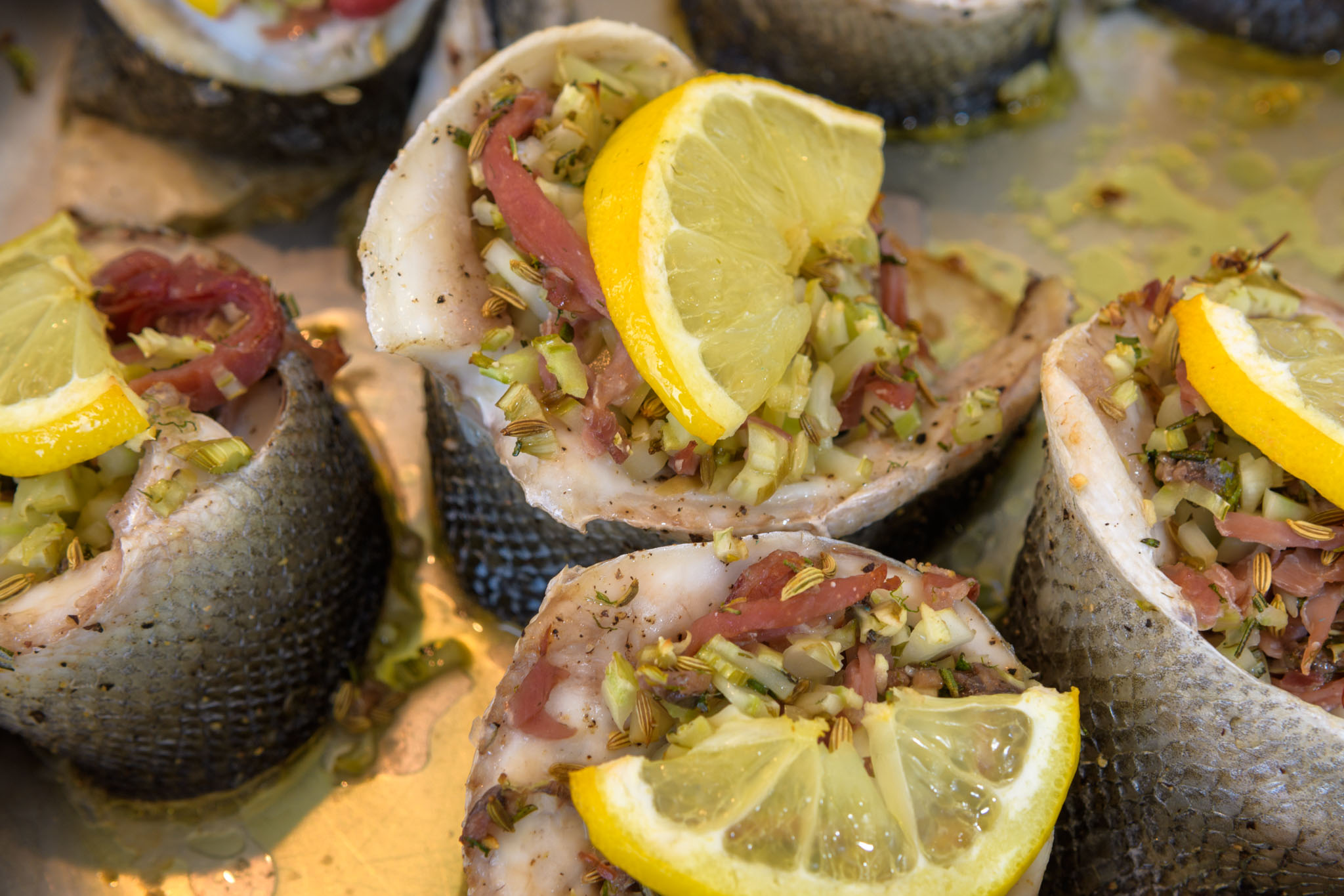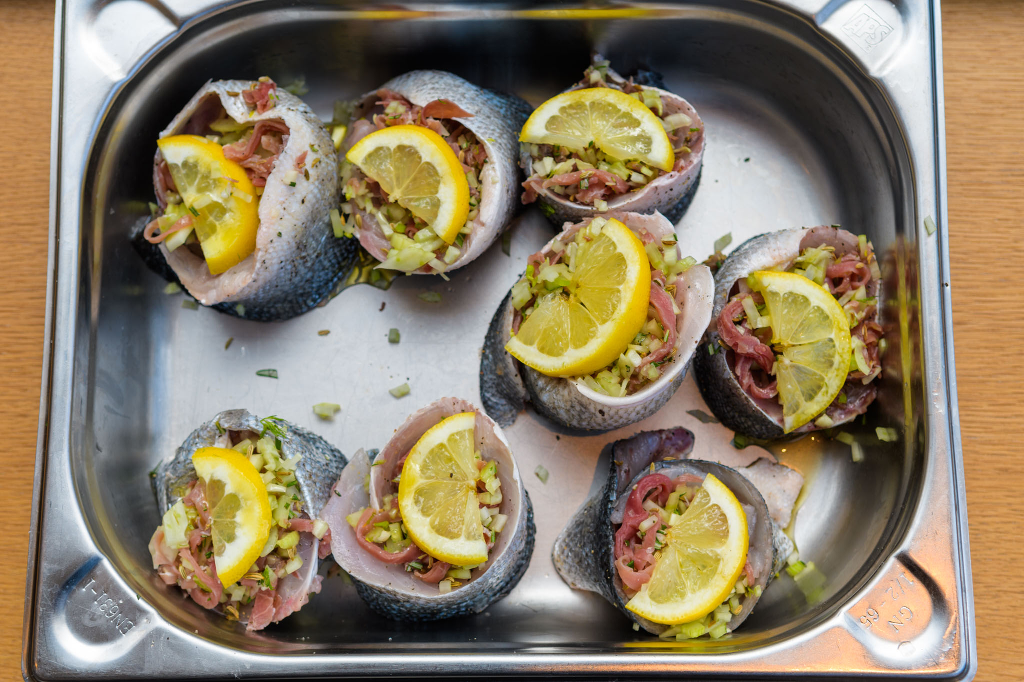 - Loup de Mer (Wolfsbarsch) gefüllt mit Fenchel und luftgetrocknetem Schinken