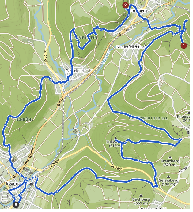 Das nun konsultierte Regenradar verhieß nichts Gutes. Im Gegenteil: Es sollte in Kürze noch viel stärker regnen und zwischenzeitlich meldeten alle unsere Warn-Apps Unwetterwarnungen. Wir haben also die nächste kleine Regenlücke genutzt, um zügig zur Bushaltestelle in Streitberg zu gehen und sind mit dem nächsten Bus zurück nach Ebermannstadt gefahren und von dort mit der Bahn weiter über Forchheim nach Fürth.