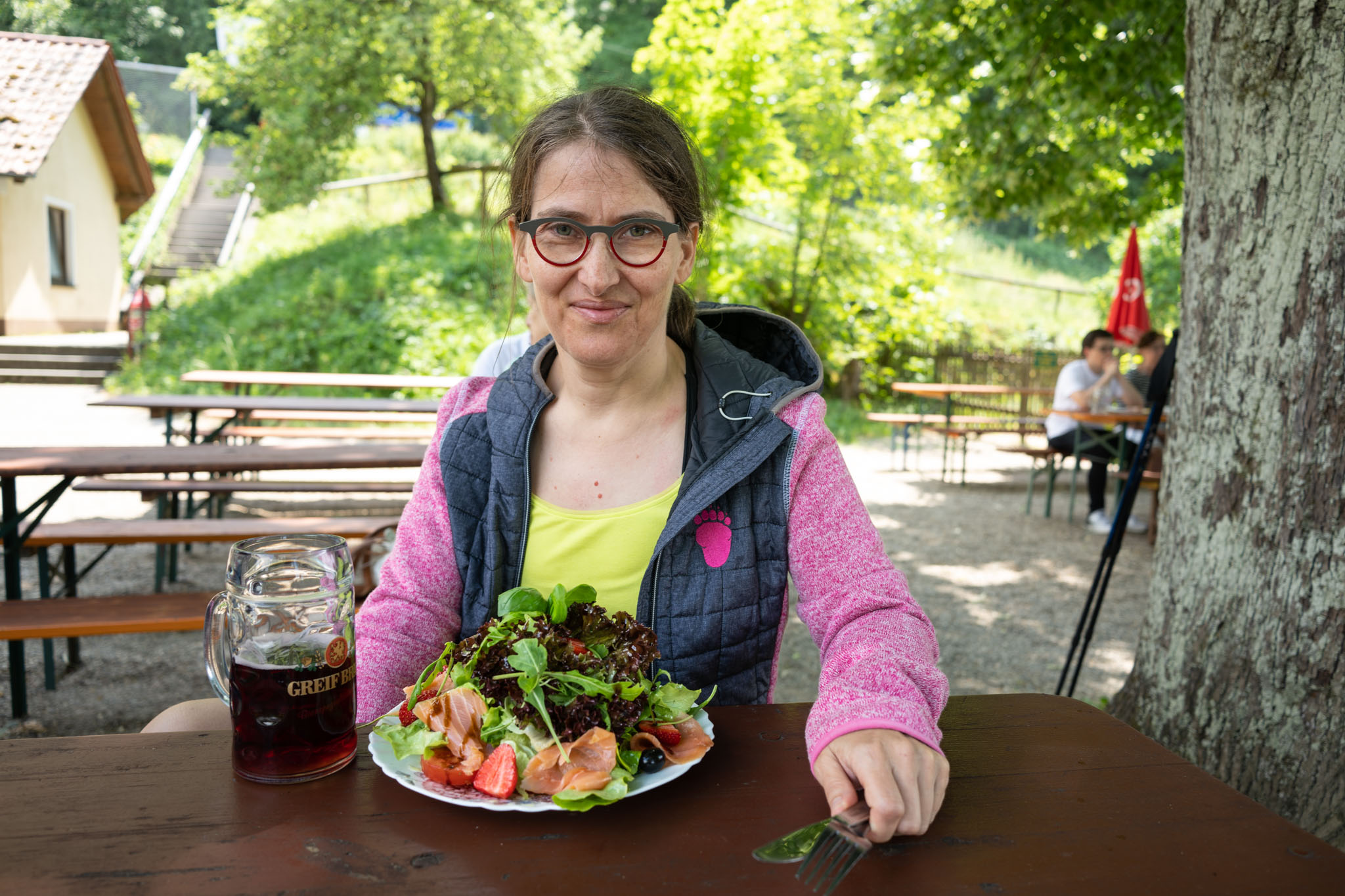 Nach den Grotten und der Ruine – ebenfalls mit schöner Aussicht über Streitberg und weiter hinter ins Tal Richtung Muggendorf – ging der Weg runter nach Streitberg. Kurz vor dem Ort liegt am ehemaligen Freibad ein schöner Biergarten, den Thomas am vergangenen Sonntag entdeckt hat und in den wir eingekehrt sind.