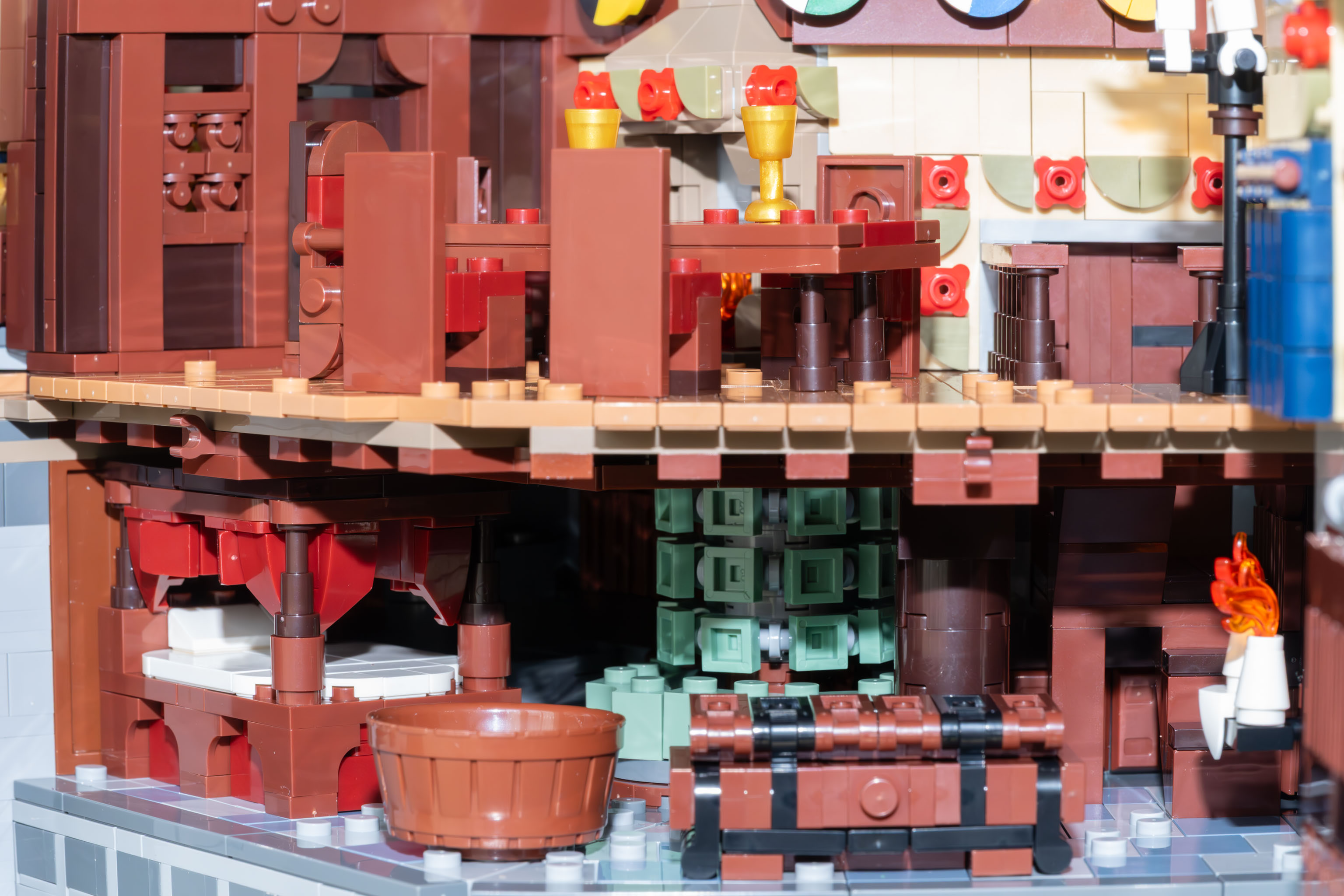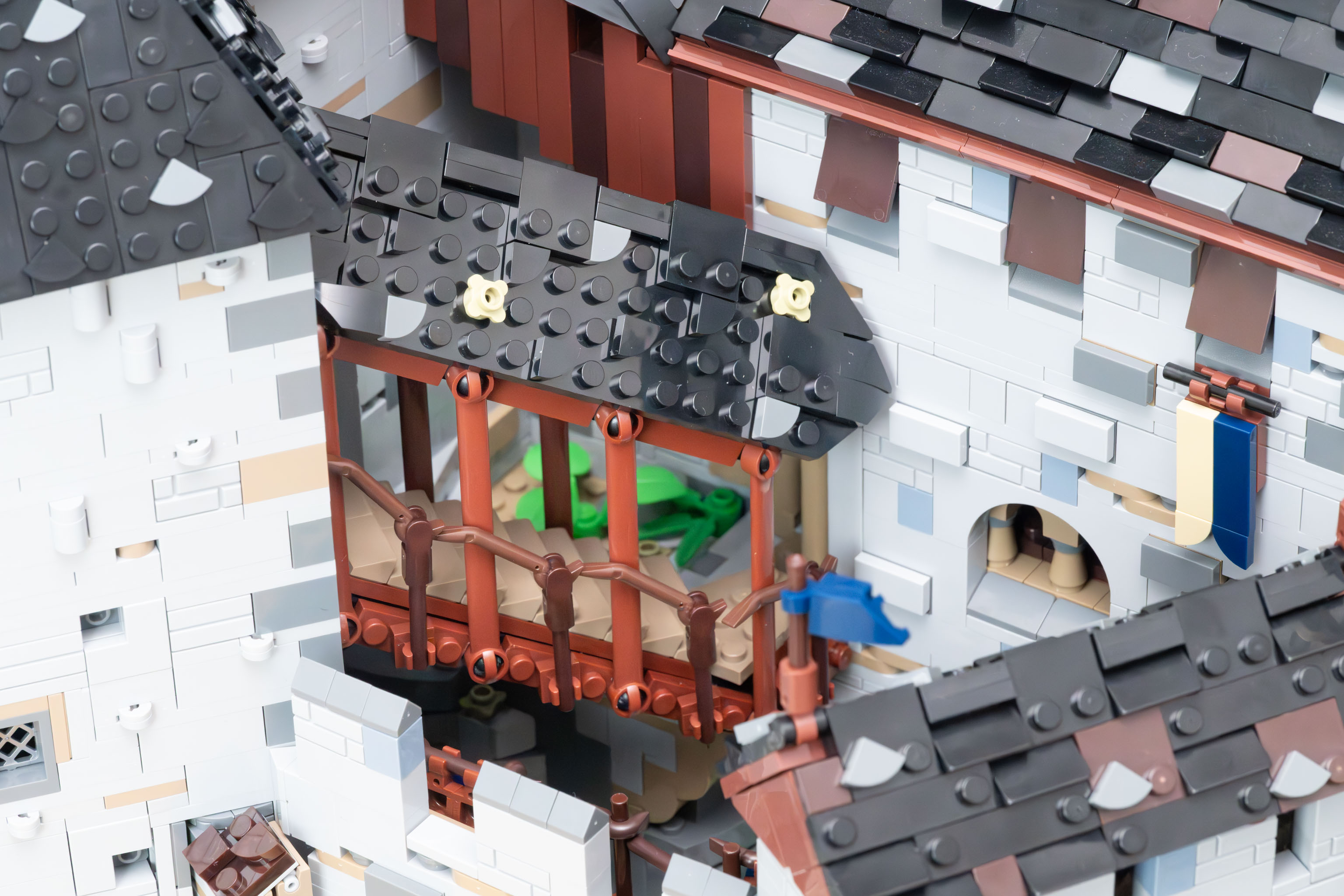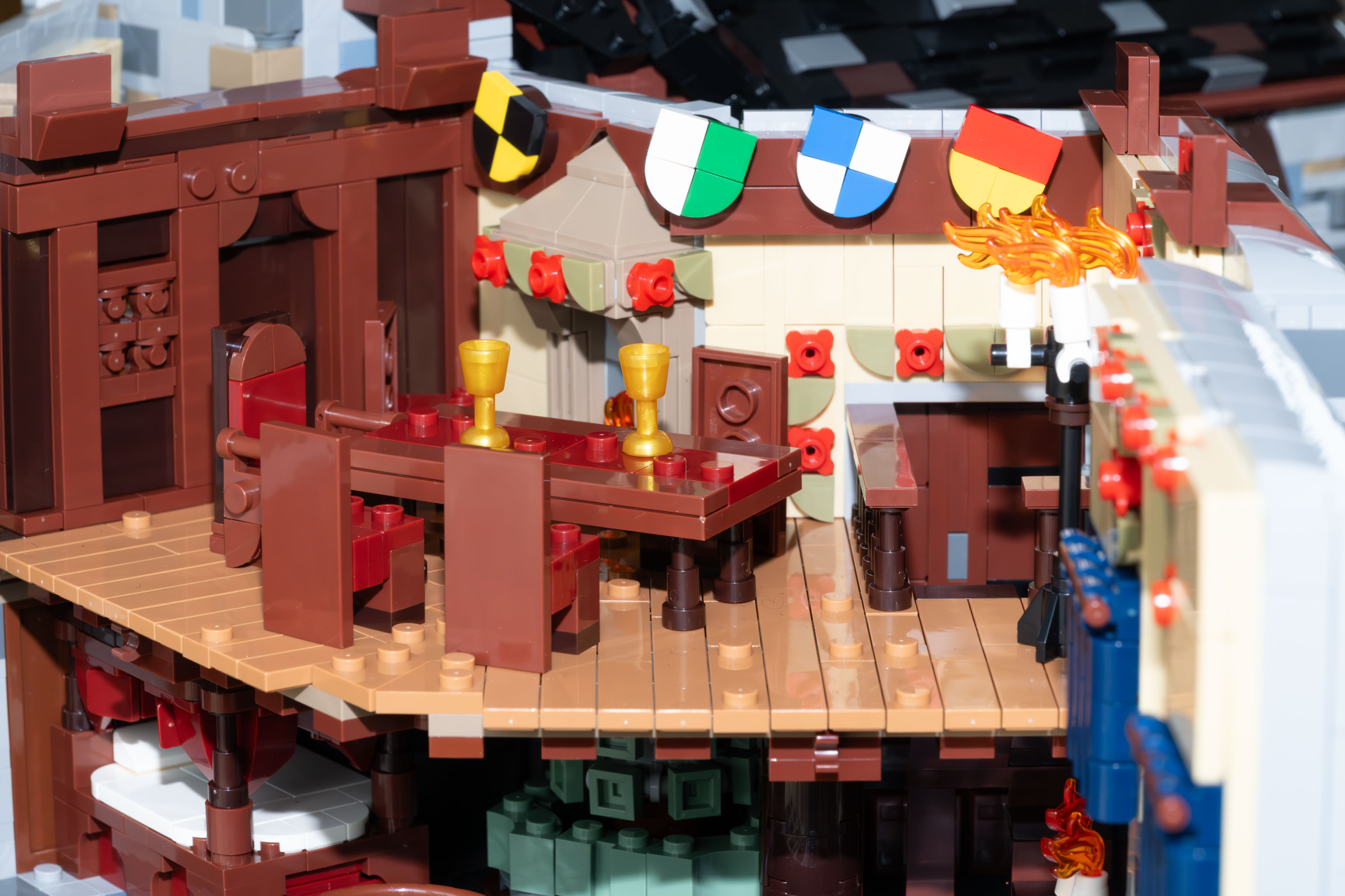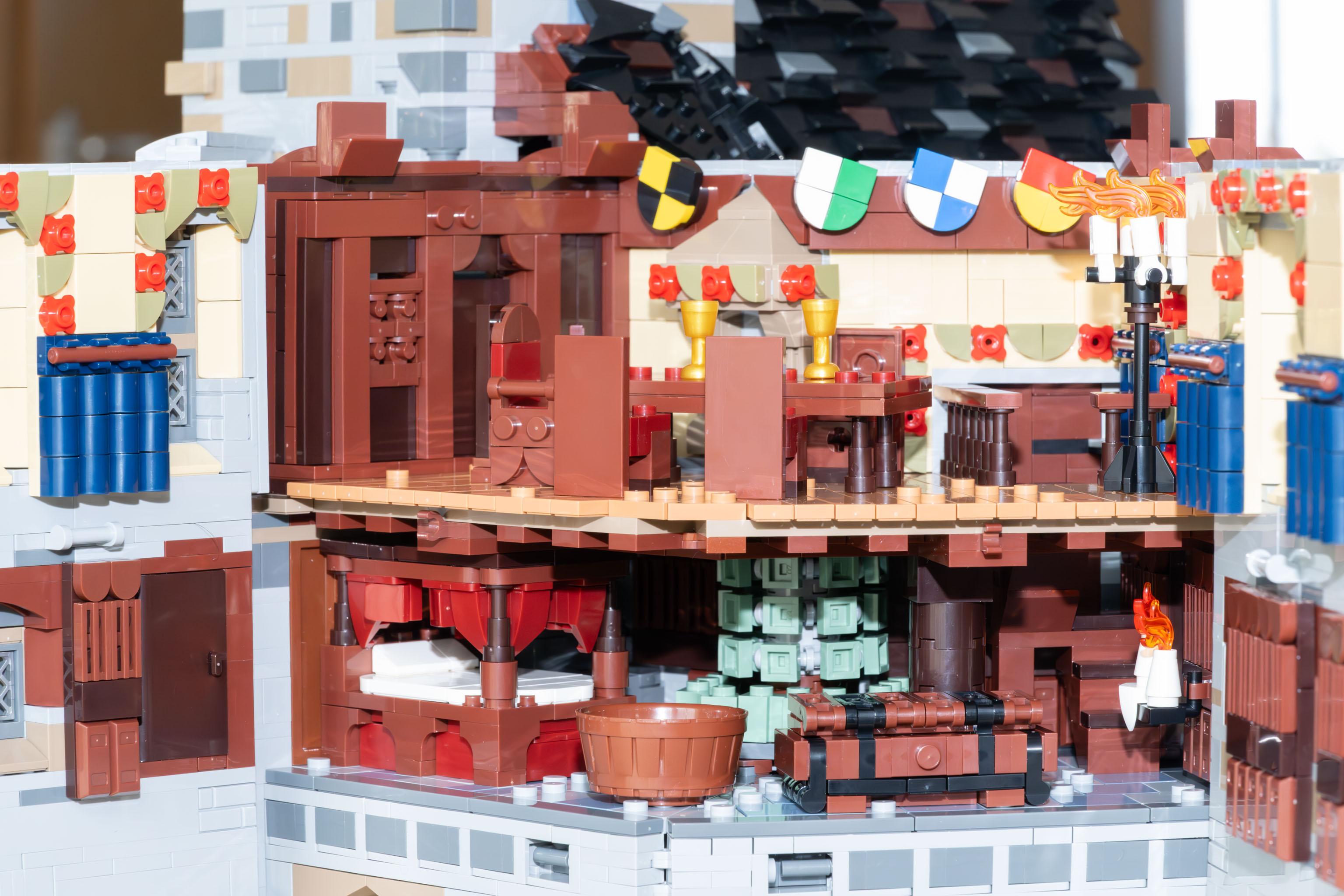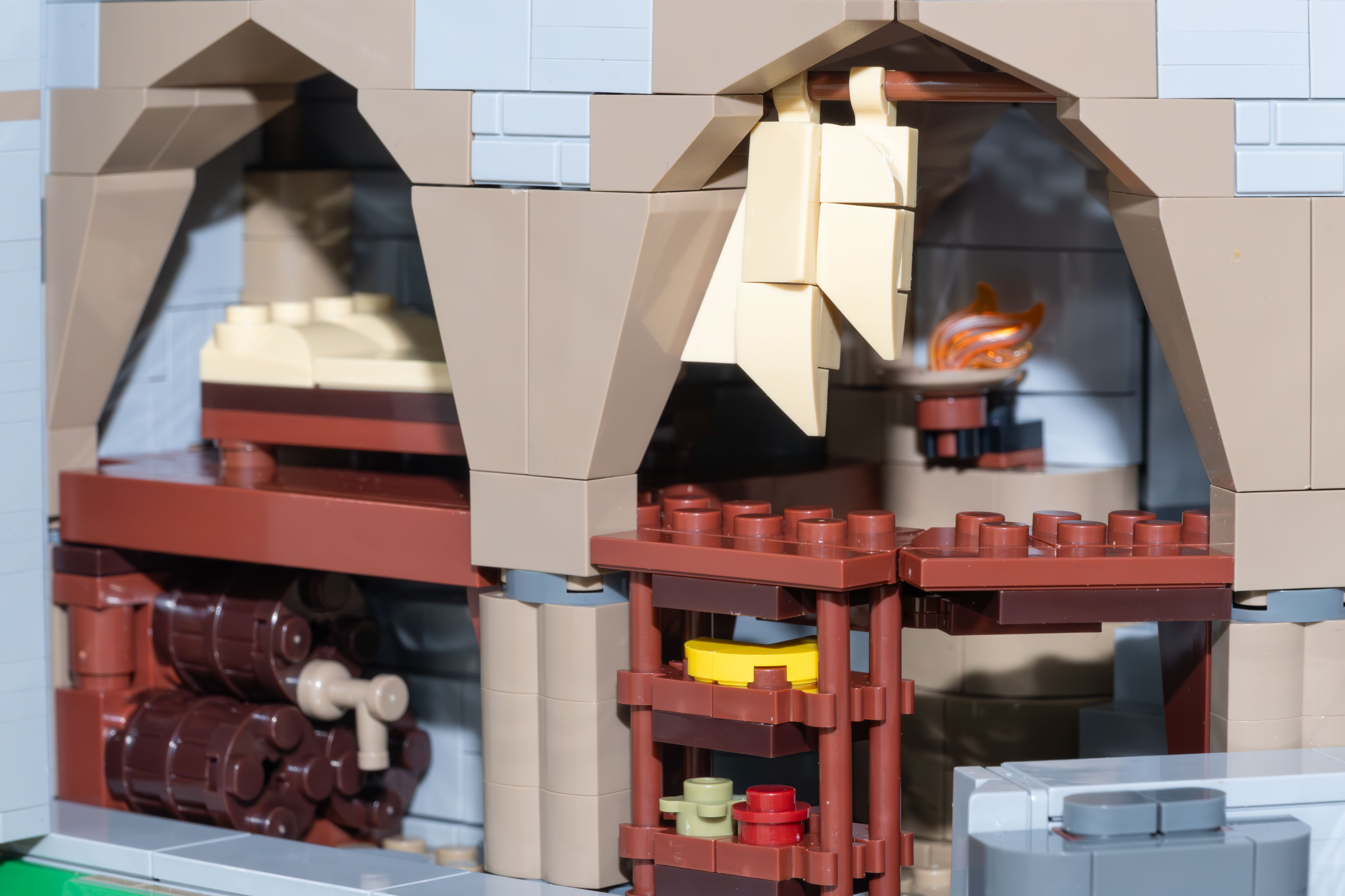 Generell gilt für die Burg Blaustein und alle ihre Erweiterungen, dass die gesamte Anlage nicht nur nett anzusehen ist, sondern dass sie – soweit das mit Klemmbausteinen nur irgendwie möglich ist – baulich und historisch korrekt ist. Die Mauern sind z. B. wirklich massiv dick, der Bergfried unten z. B. drei Steine, und oben verjüngen sich die Mauerstärken. Und man kommt innen tatsächlich von jedem Raum über Treppen, Gänge, Leitern etc. in jeden anderen Raum. Kamine sind über alle Stockwerke durchgehend architektonisch korrekt und bei den Plumpsklos ist tatsächlich unten ein Loch im Erker. – Es ist wirklich alles bis ins Detail durchdacht.