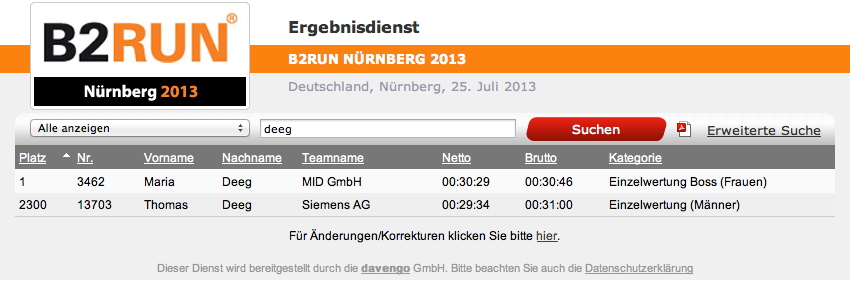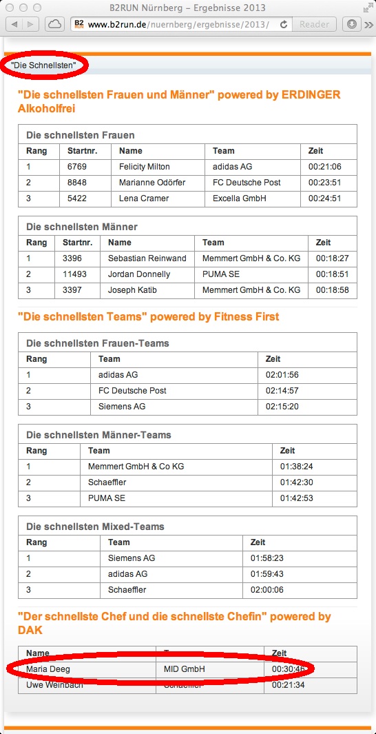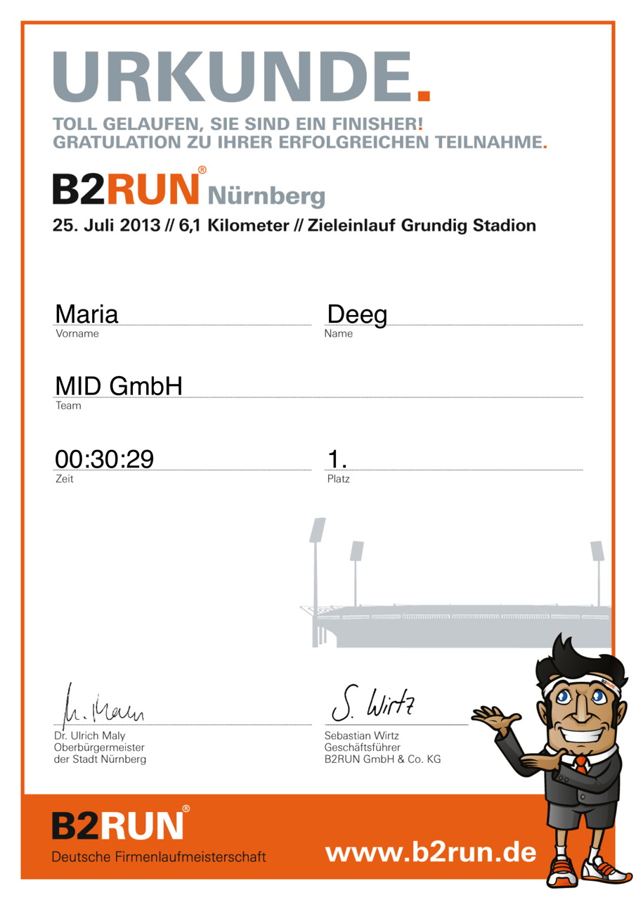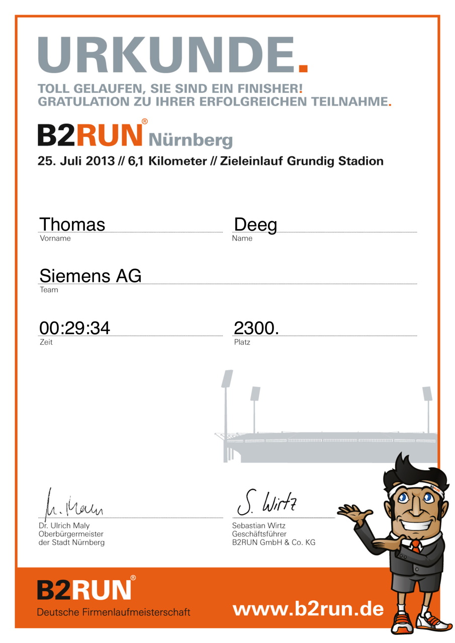 Gestern Abend fand der Nürnberger Lauf der Deutschen Firmenlaufmeisterschaft ("B2RUN") statt. Am späten Nachmittag sah es noch so aus, als würde nicht nur die hohe Temperatur des letzten Jahres (30 °C) wieder erreicht werden, sondern auch die Luftfeuchtigkeit einen neuen Rekord aufstellen. Glücklicherweise bewölkte es sich gegen Abend, so dass zumindest die Temperatur ein klein wenig erträglicher für die fast 16.500 Teilnehmer wurde.