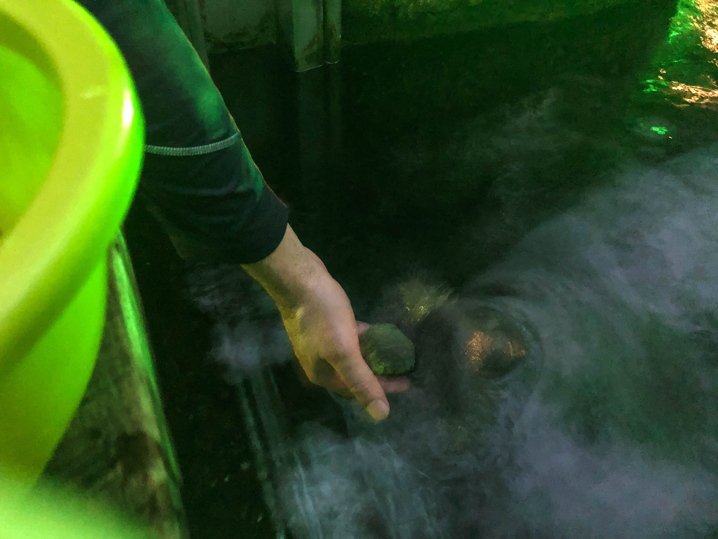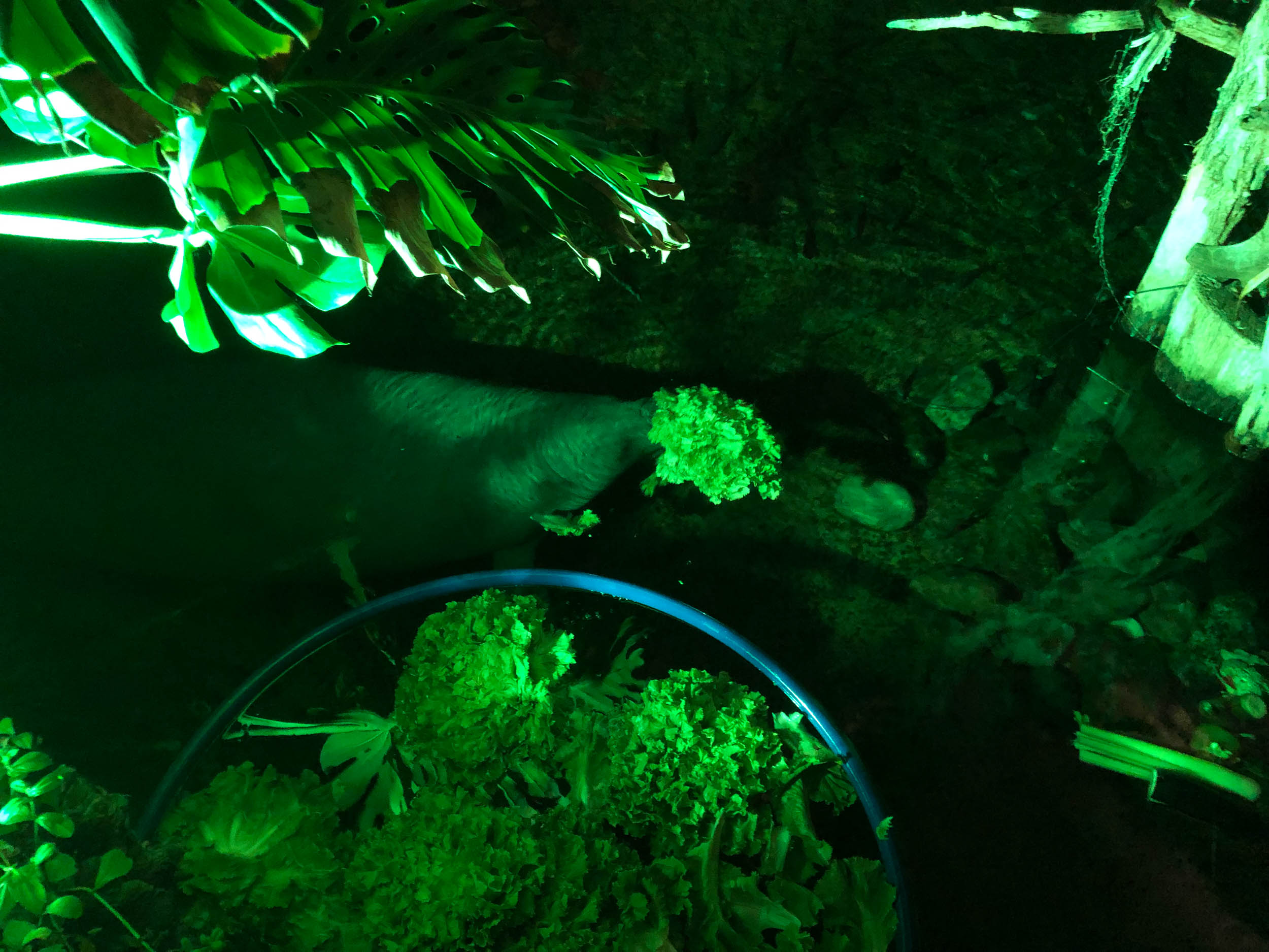 Anfangs war es ein ganz normaler Tiergartenbesuch. Abends sind wir dann aber geblieben, nachdem dieser eigentlich schon lange geschlossen hatte: Wir lösten unser Geburtstagsgeschenk vom letzten Jahr ein und durften hinter den Kulissen dabei sein, wenn nachts die Tierpfleger alleine mit den Tieren sind. Im Manatihaus haben wir dabei einige der Tiere gefüttert, die dort so leben. Angefangen mit den kleinsten, den Ameisen (diese bekommen Haferflocken, die immer noch größer sind als sie selbst), bis hin zu den Manatis. So eine Manati-Kuh wiegt etliche hundert Kilogramm und frisst 30 kg Salat und Gemüse pro Tag. Sie fressen völlig friedlich aus der Hand, wobei es sich ziemlich witzig anfühlt, wenn so ein Koloss mit seinen ziemlich kräftigen bürstenartigen Barthaaren sein rüsselförmiges Maul um unsere Hand stülpt, um einen Brokkoli daraus zu essen (auf dem vorletzten Foto zu erahnen). :-)