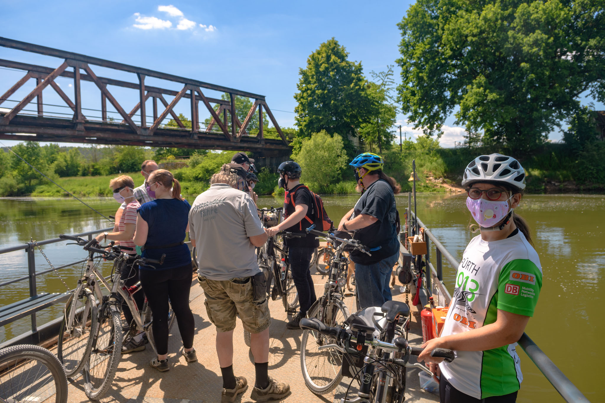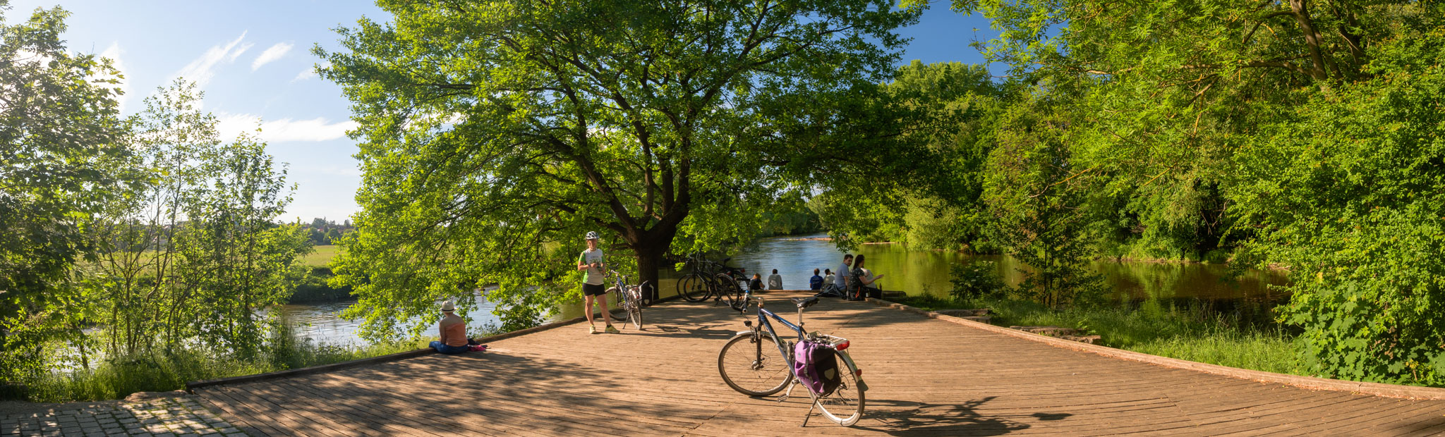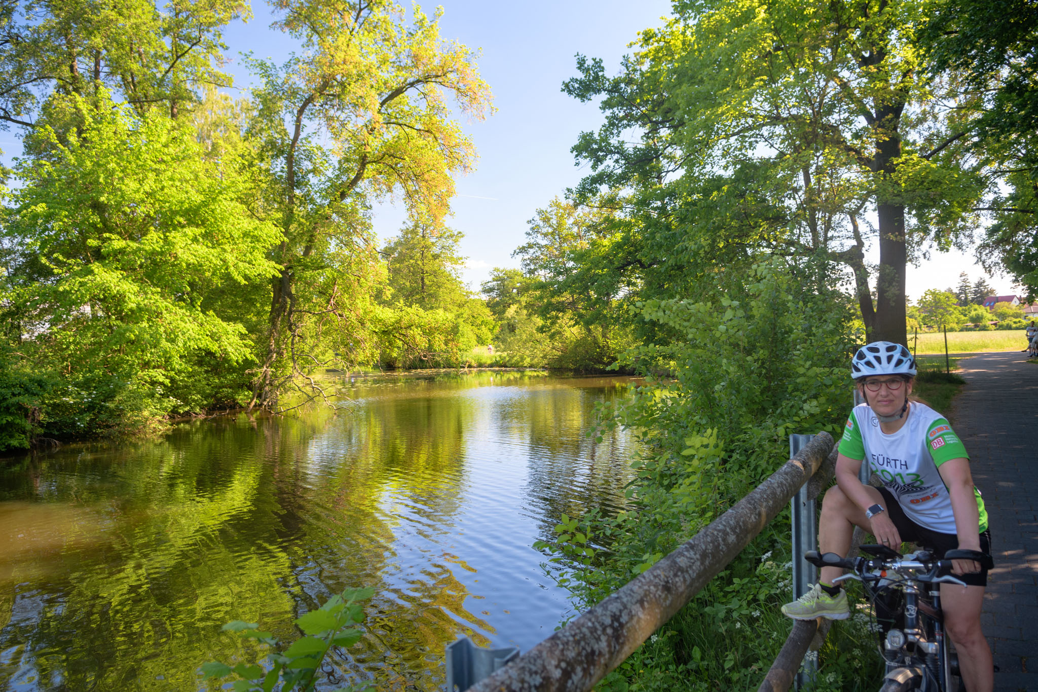 Los ging es in Bischberg, ein paar Kilometer nordwestlich von Bamberg, wo der Main in die Regnitz mündet. (So ist es wirklich, auch wenn der Fluss ab dort Main heißt.) Von dort ging es flussaufwärts durch das Regnitztal über Bamberg, die Pettstadter Fähre nach Pettstadt, Sassanfahrt und Forchheim bis zum Anfang der Pegnitz bei Fürth, die hier durch den Zusammenfluss von Pegnitz und Rednitz entsteht. Dort mussten wir die Regnitz verlassen und die letzten etwa 2,5 km an der Pegnitz entlang radeln, um gar bis zu uns nach Hause zu kommen.