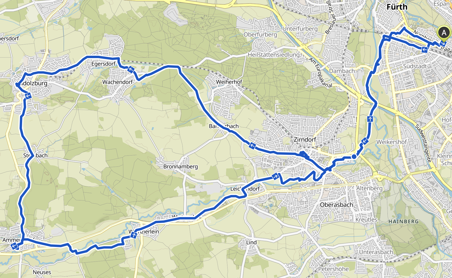 Nachdem auch heute wieder herrliches Sommerwetter mit bis zu 30°C angekündigt waren, haben wir uns erneut aufs Fahrrad geschwungen. Der Einfachheit halber wollten wir wieder vor unserer Haustür starten und so ging es von Fürth über Zirndorf und Cadolzburg bis nach Ammerndorf und von dort zurück nach Fürth.
