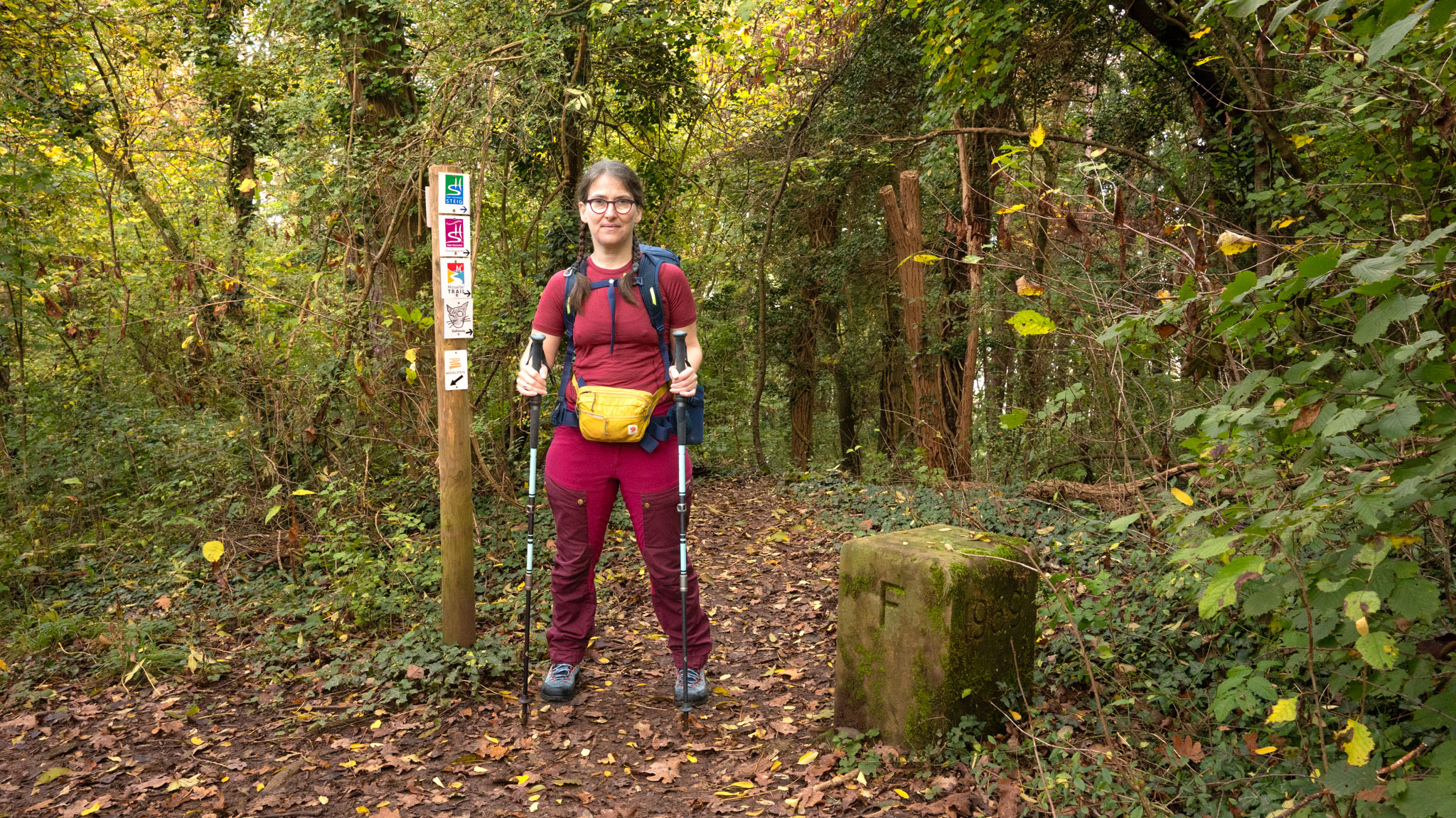 Anders als gestern und vorgestern war die heutige Schlussetappe recht moderat, so dass wir noch Zeit hatten, dem Steig drei Kilometer über unser eigentliches Ziel hinaus zu folgen bis zu den 99- und 100-km-Markierungen. Bei 100 km war die Landschaft nicht sehr fotogen, so dass es das Selfie bei 99 km gab.
