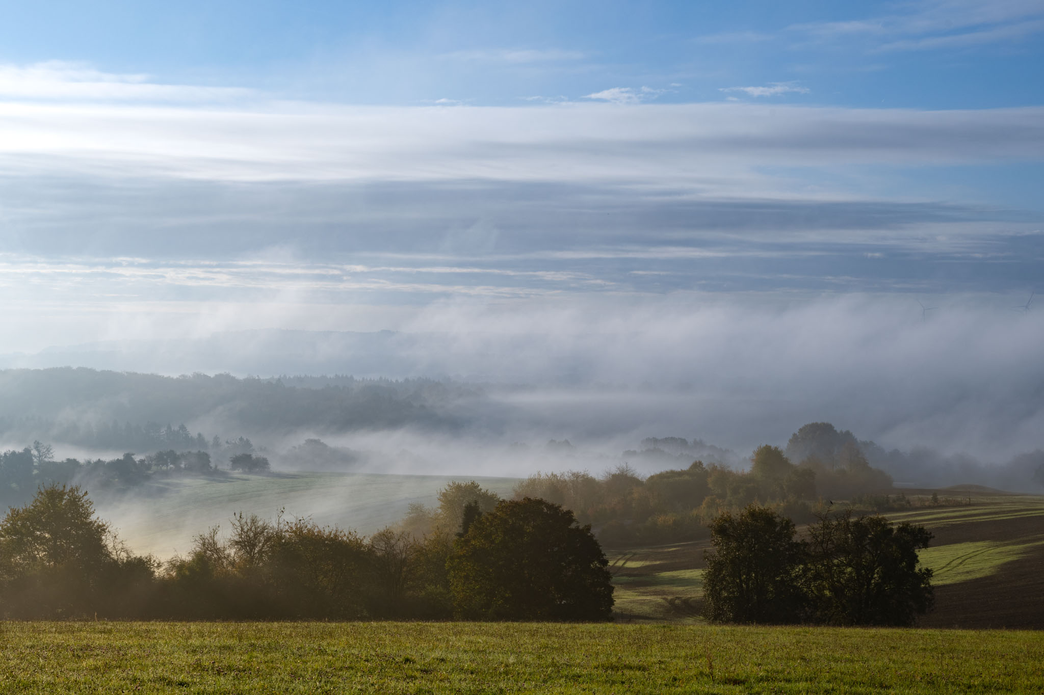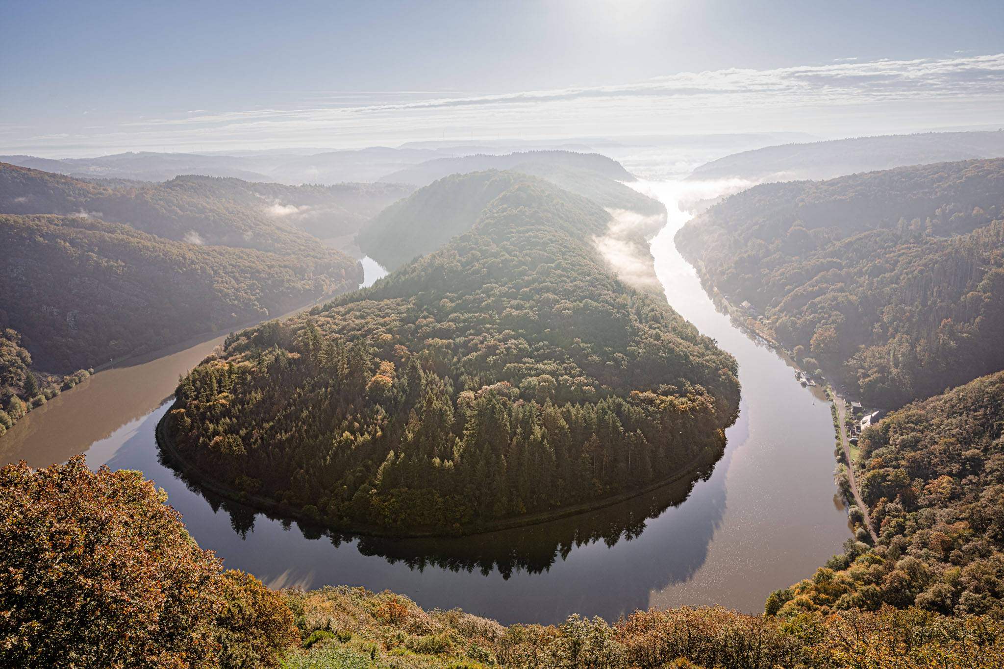 Und da es gestern am Vormittag richtig schöne Nebelschwaden gab, die sich in der Morgensonne langsam auflösten, sind wir heute besonders früh aufgestanden und waren um 7 Uhr die ersten beim Frühstück. Die Stimmung unterwegs war dann auch genau so schön wie erhofft. Bis wir an der Saarschleife angekommen sind, hatte sich der Morgendunst aber dann doch schon fast vollständig aufgelöst.