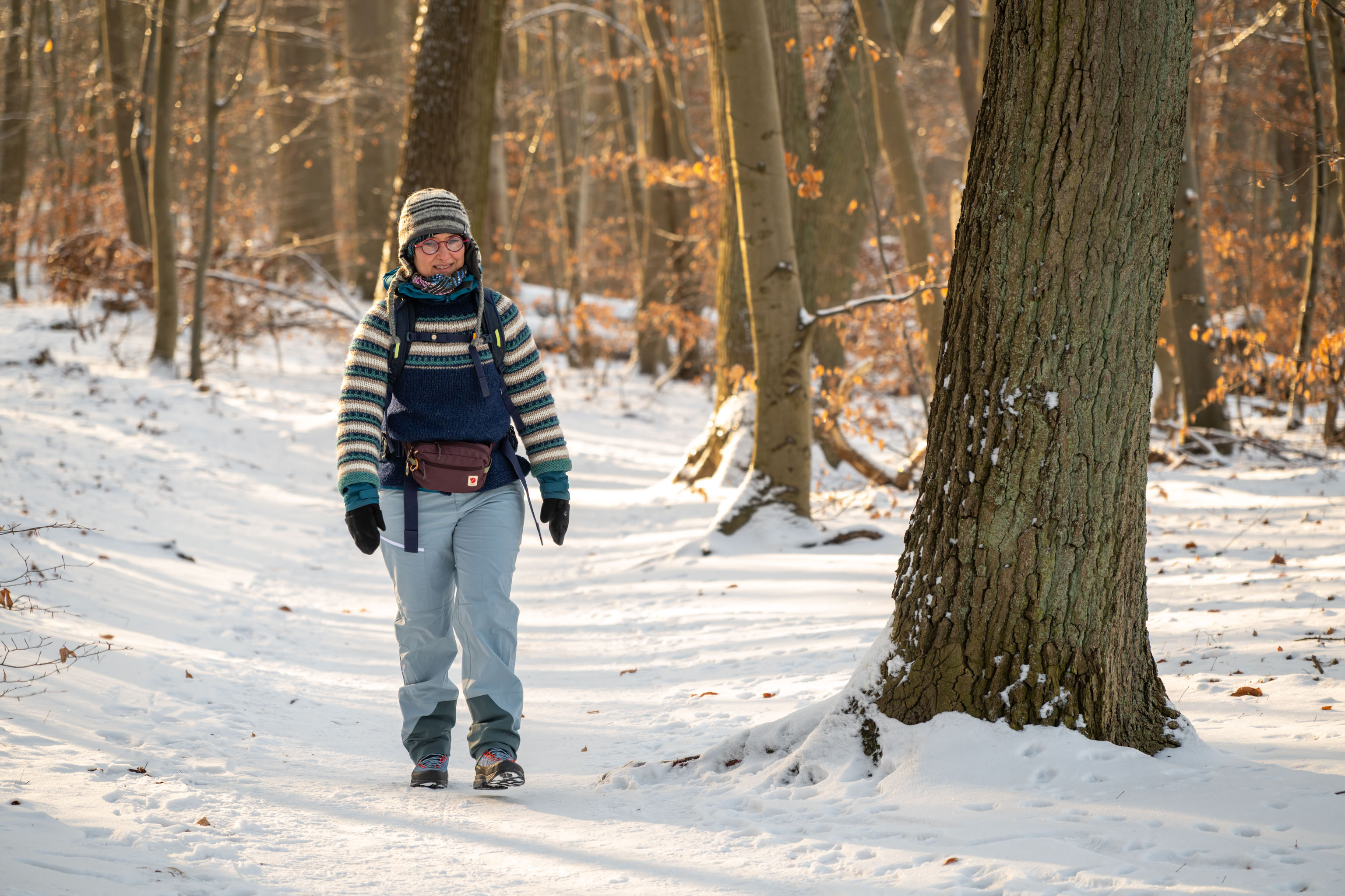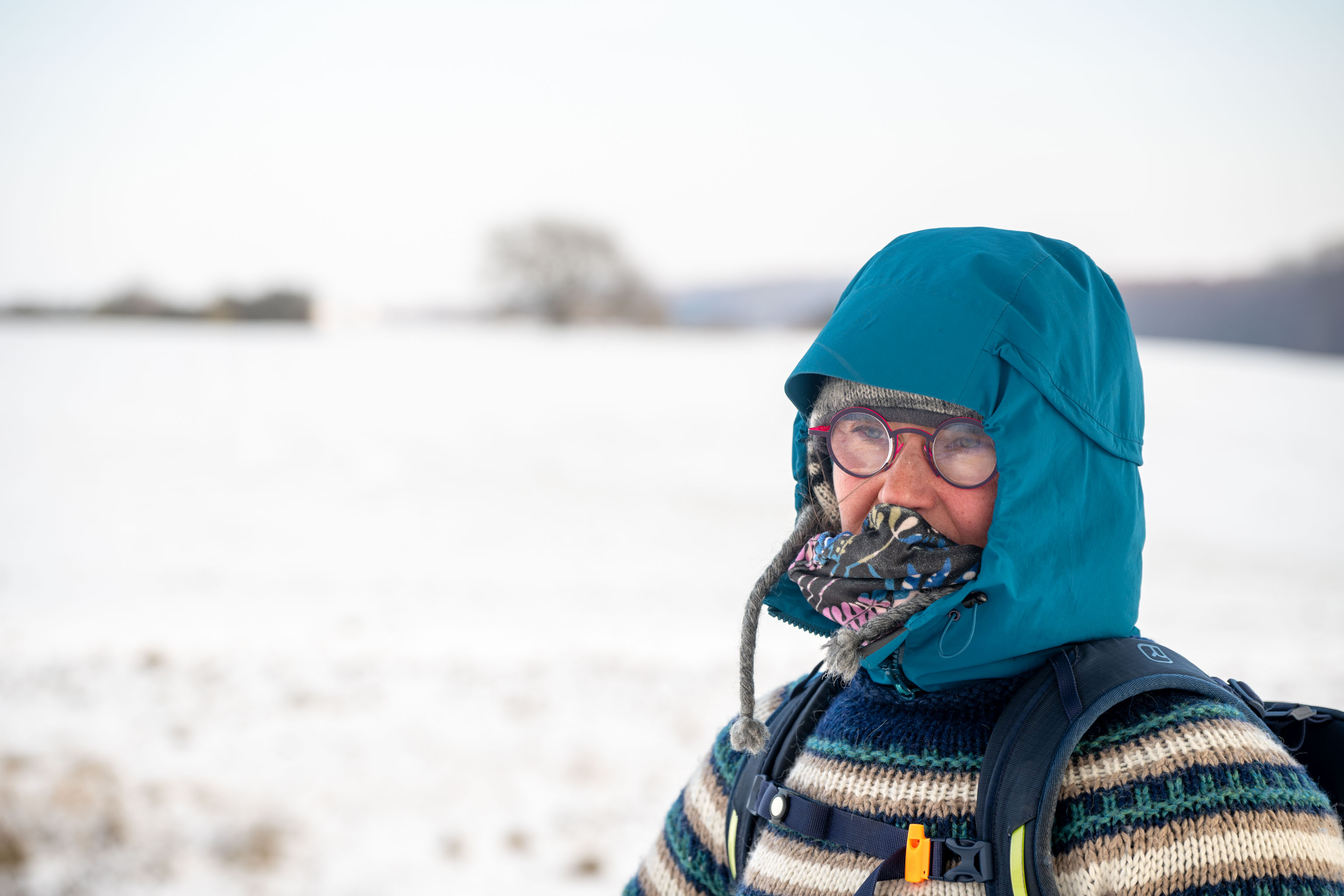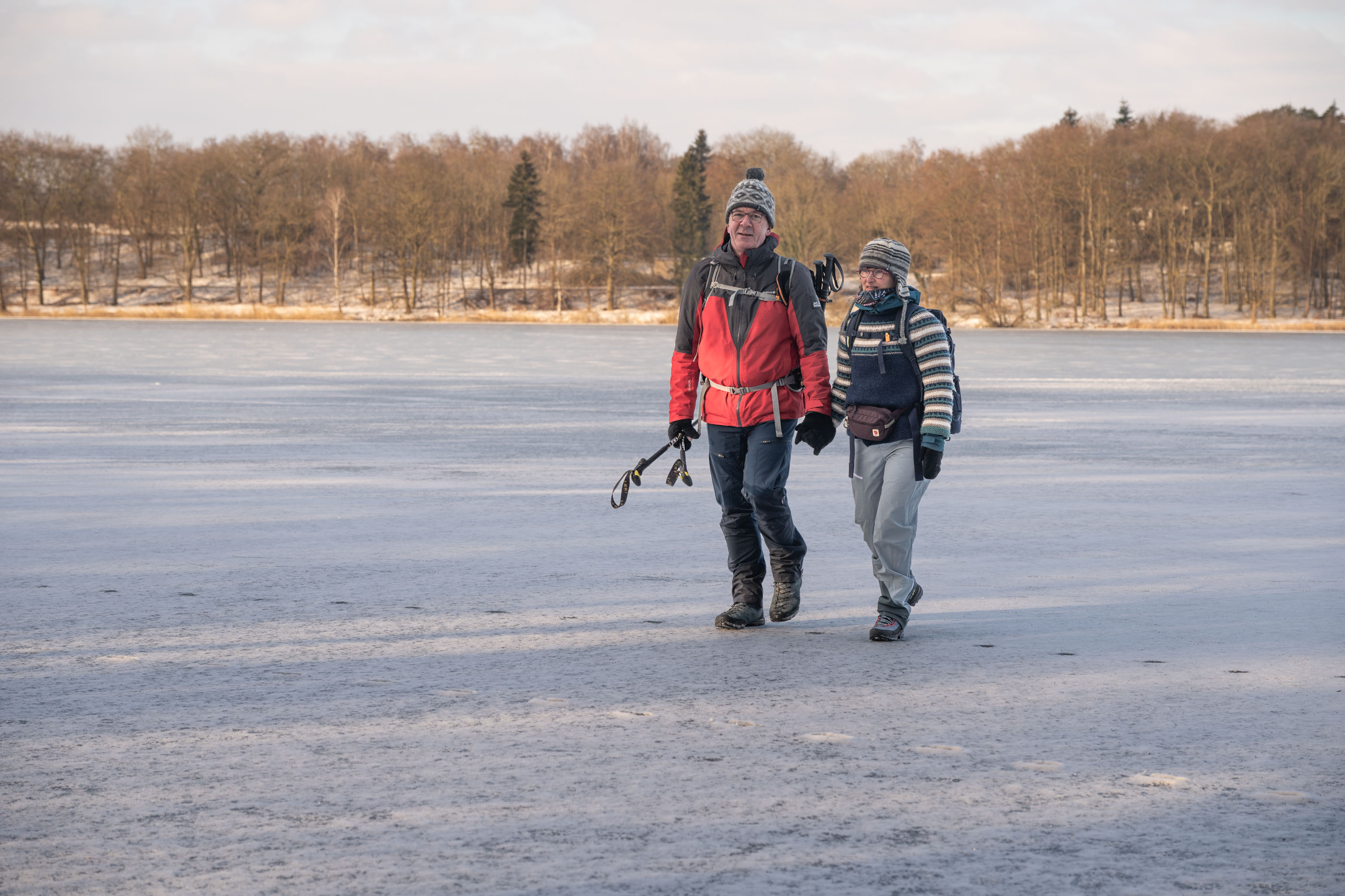 Lange Zeit dachten wir nicht, dass es heute ein gemeinsames Selfie geben wird – zu sehr schreckte uns der Gedanke ab, das eiskalte Stativ aufbauen zu müssen. Als dann aber die Sonne immer stärker durch kam und wir gleichzeitig windgeschützt durch ein kleines Wäldchen wanderten, war es dann doch erträglich.