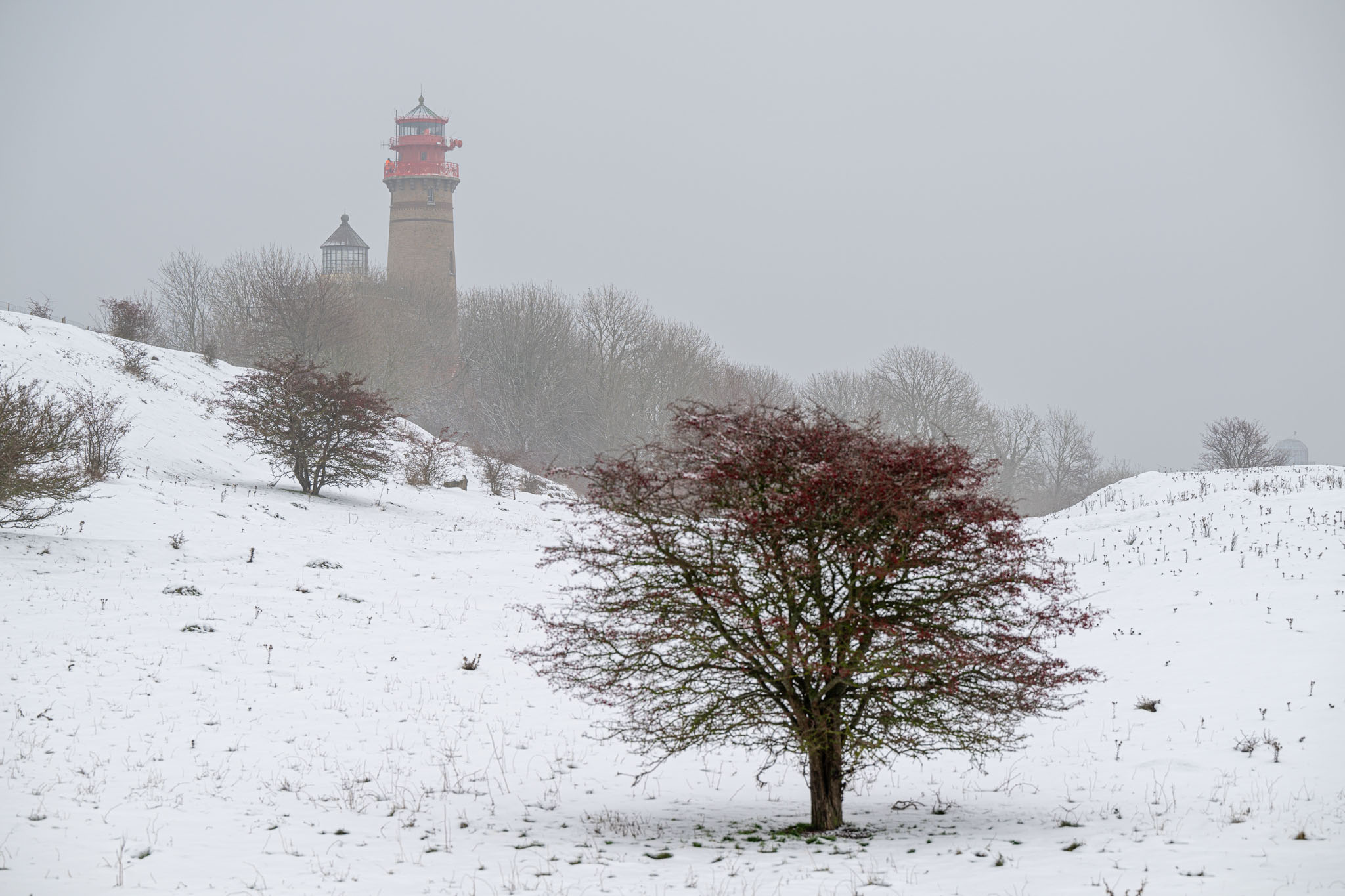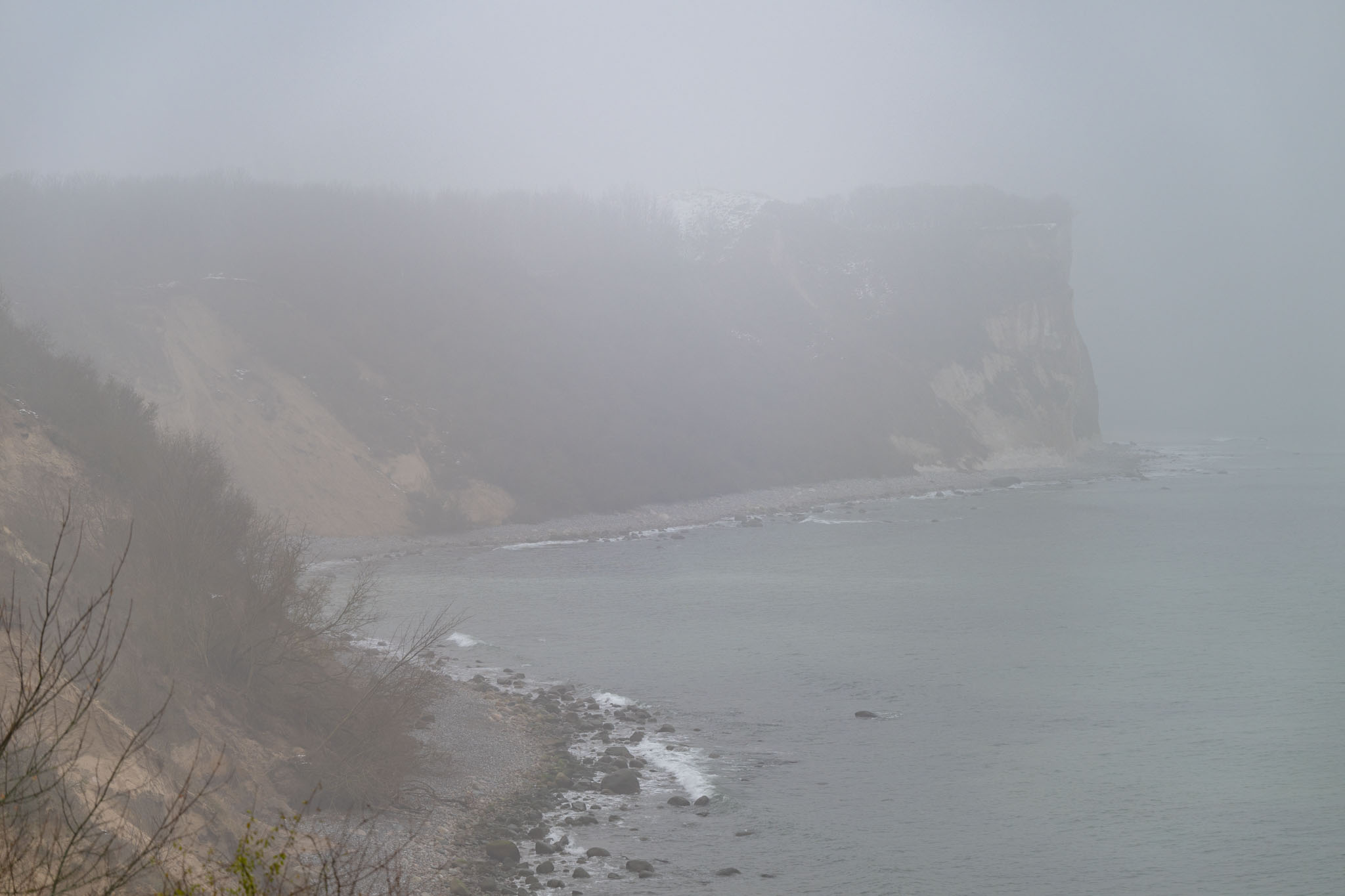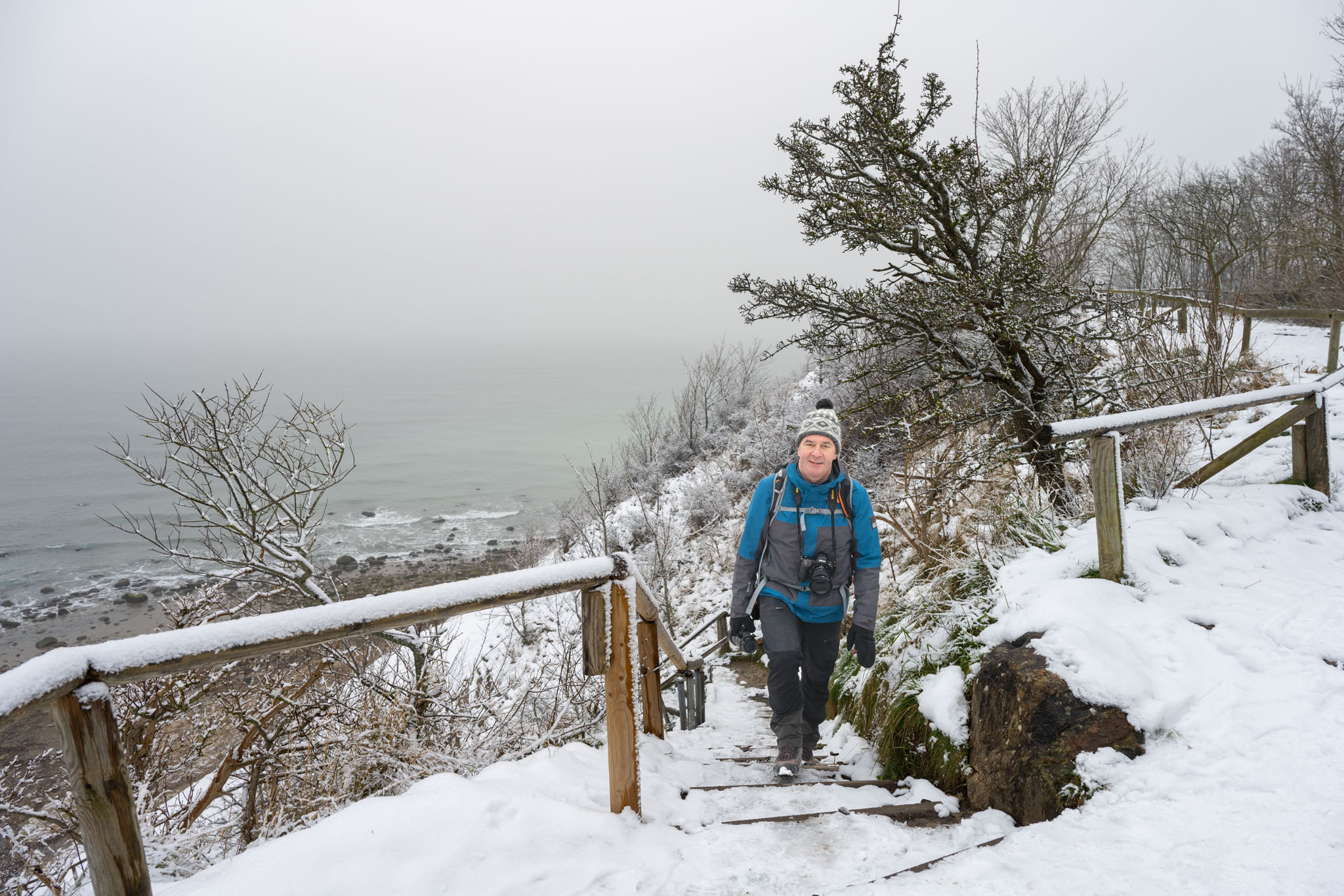 Als wir am Kap angekommen sind, war es zwar etwas neblig, aber man konnte halbwegs weit sehen, so dass die Stimmung gut zur winterlich verschneiten Landschaft passte. Nach einem Spaziergang auf abseits der Touristenpfade noch unberührten Wegen und ein paar Fotos von den Leuchttürmen, sind wir runter ans Meer, um die Kreidefelsen von unten zu sehen. Die Kreideabbrüche am Fuße des Kliffs sind übrigens ein ziemlich weicher, schmieriger und an den Schuhen klebender Untergrund.