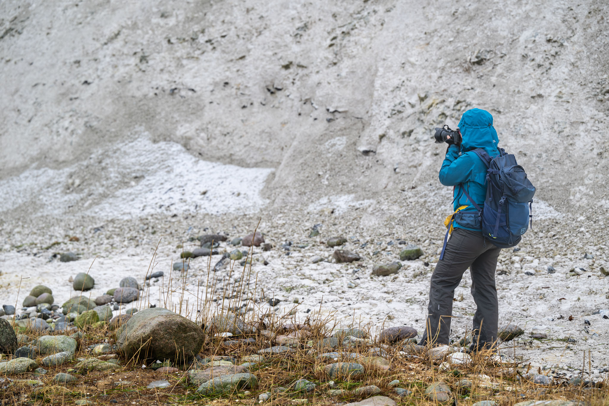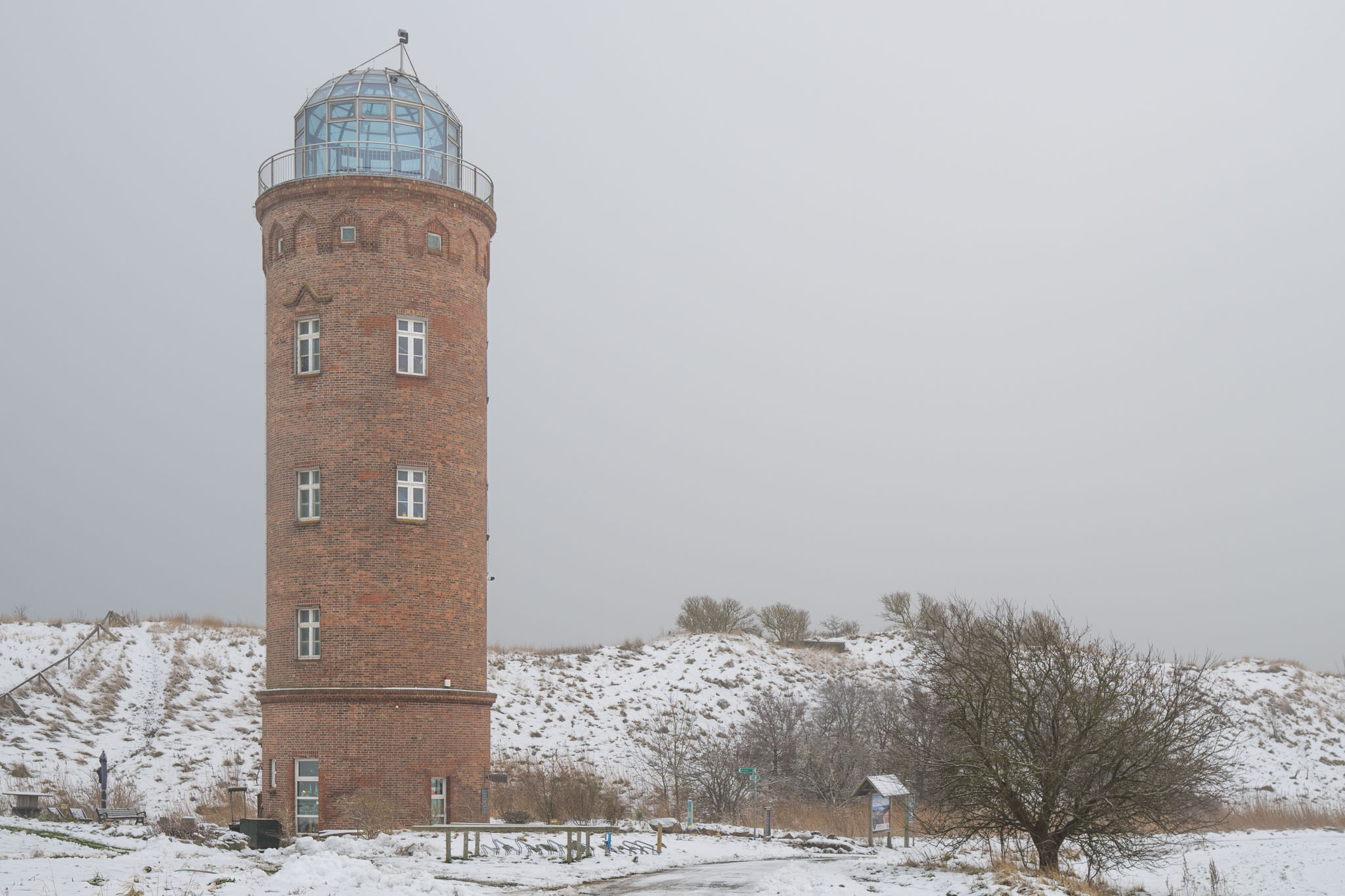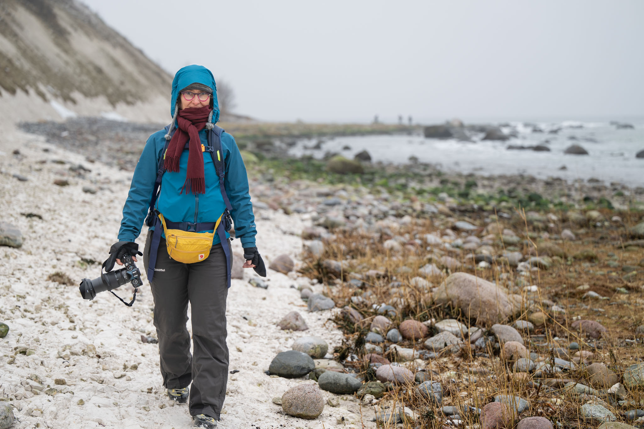 Als wir am Kap angekommen sind, war es zwar etwas neblig, aber man konnte halbwegs weit sehen, so dass die Stimmung gut zur winterlich verschneiten Landschaft passte. Nach einem Spaziergang auf abseits der Touristenpfade noch unberührten Wegen und ein paar Fotos von den Leuchttürmen, sind wir runter ans Meer, um die Kreidefelsen von unten zu sehen. Die Kreideabbrüche am Fuße des Kliffs sind übrigens ein ziemlich weicher, schmieriger und an den Schuhen klebender Untergrund.