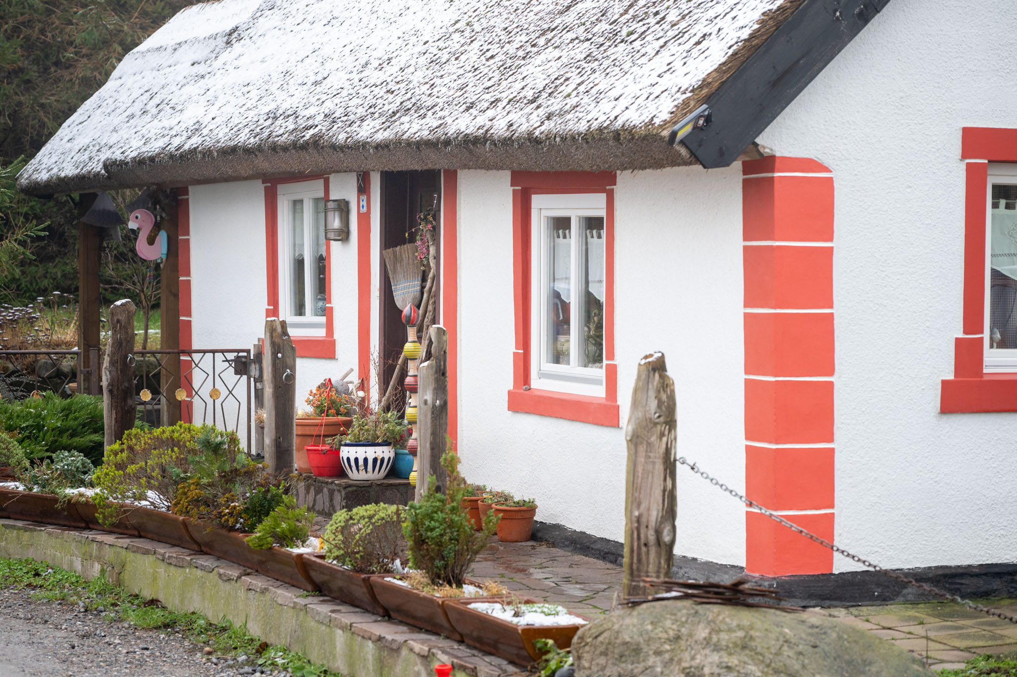 Anschließend haben wir Maria oben im Peilturm bei einem Kaffee und Eis(!?) wieder aufgewärmt. Dummerweise ist in dieser Zeit der Nebel immer dichter geworden, so dass wir von den Aussichtspunkten auf dem Weg zum nahen Fischerdorf Vitt das Kliff kaum noch sehen konnten. Schön war es trotzdem und Vitt hat eine ganze Reihe schöner reetgedeckter Häuser.