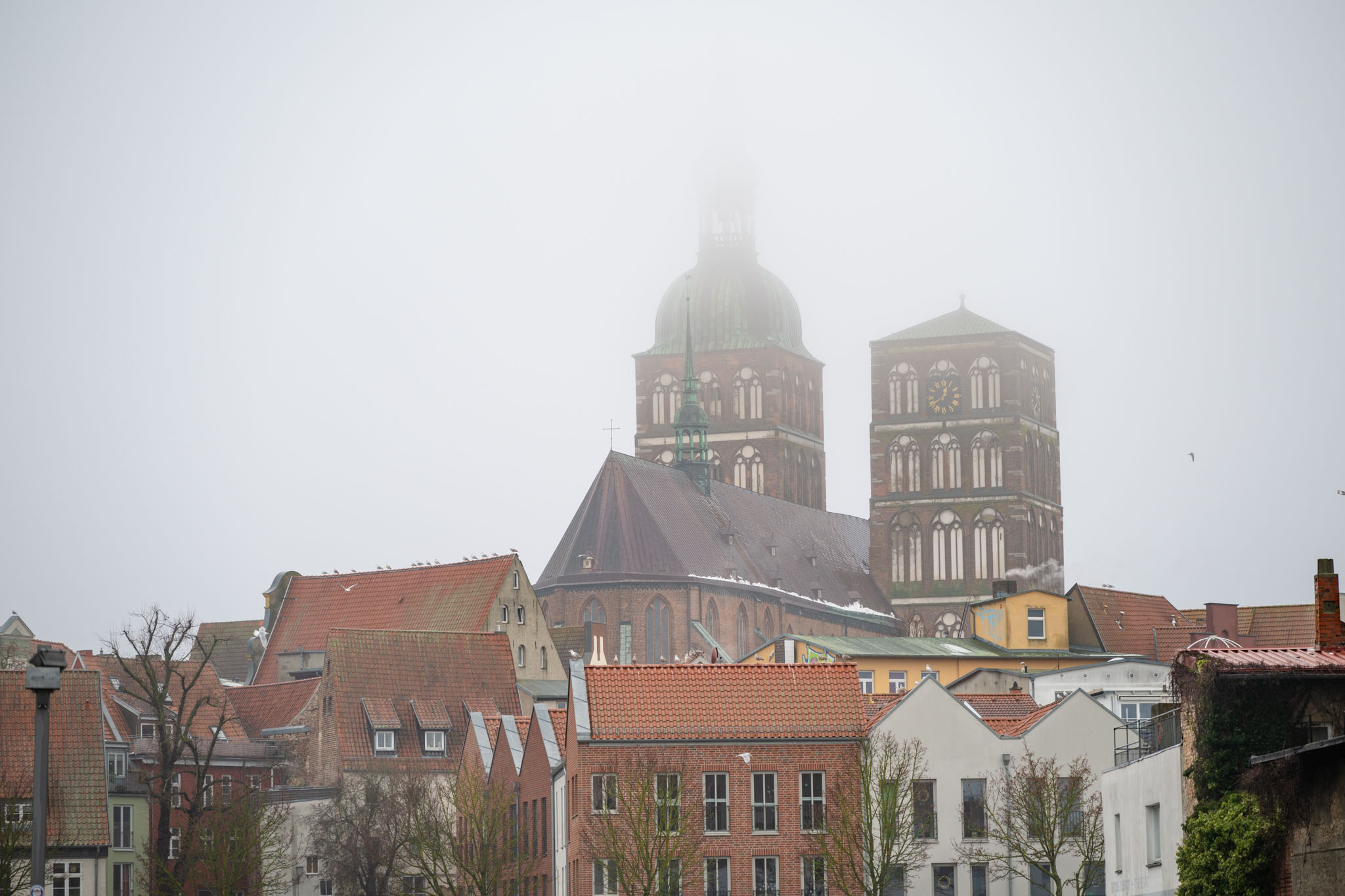 In Binz hat es heute früh zwar nicht geregnet, aber die Luftfeuchtigkeit lag wohl nur knapp unter 100 %. In Stralsund war es dann so nebelig, dass man teilweise die Kirchturmspitzen nicht mehr sehen konnte, aber – entgegen der Wettervorhersage – durchgehend trocken.