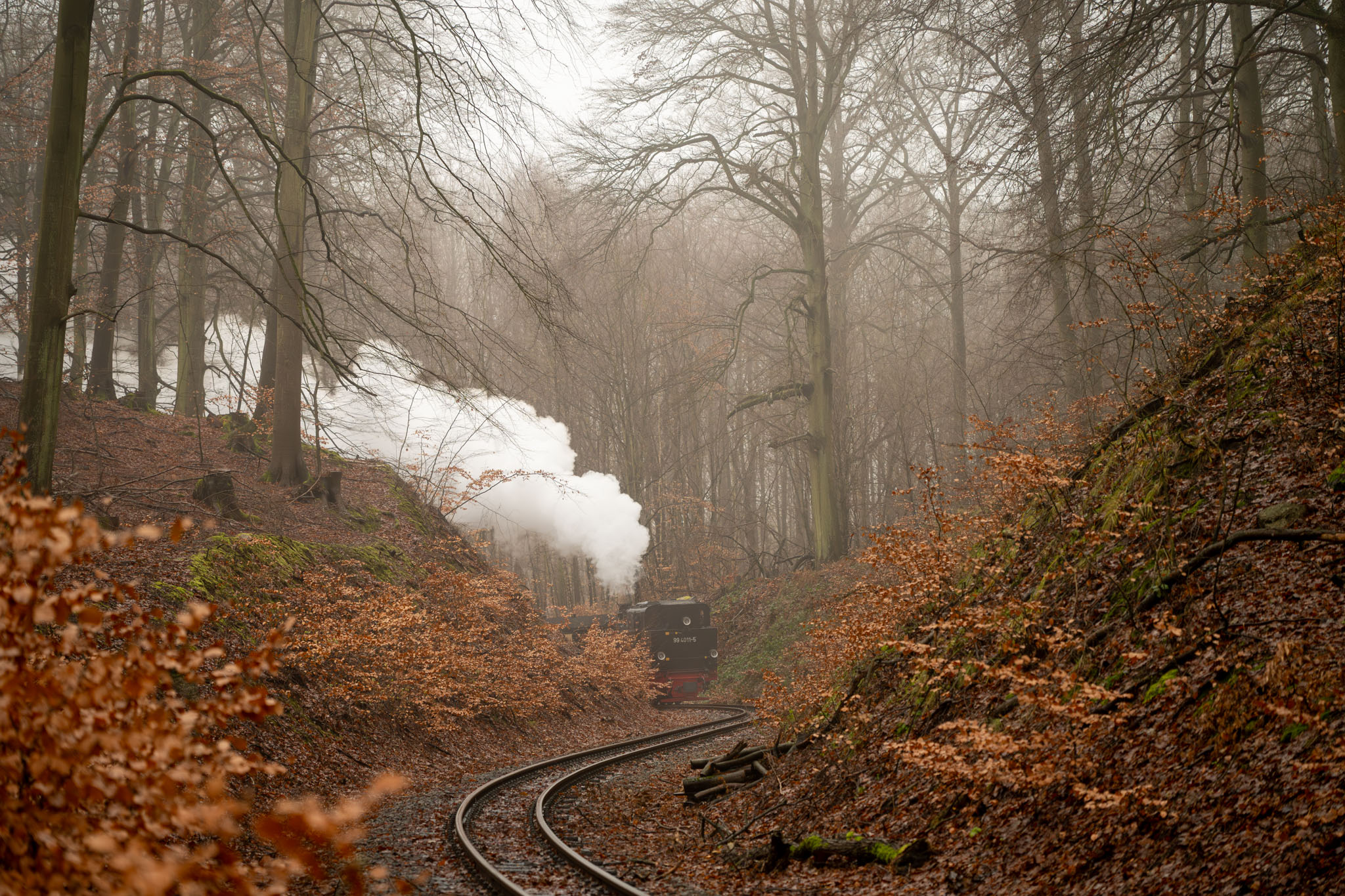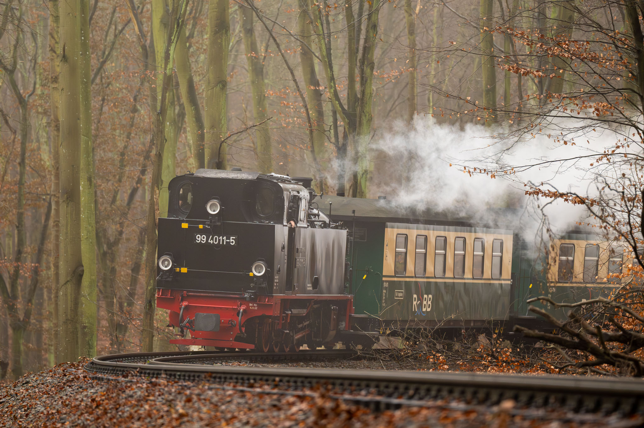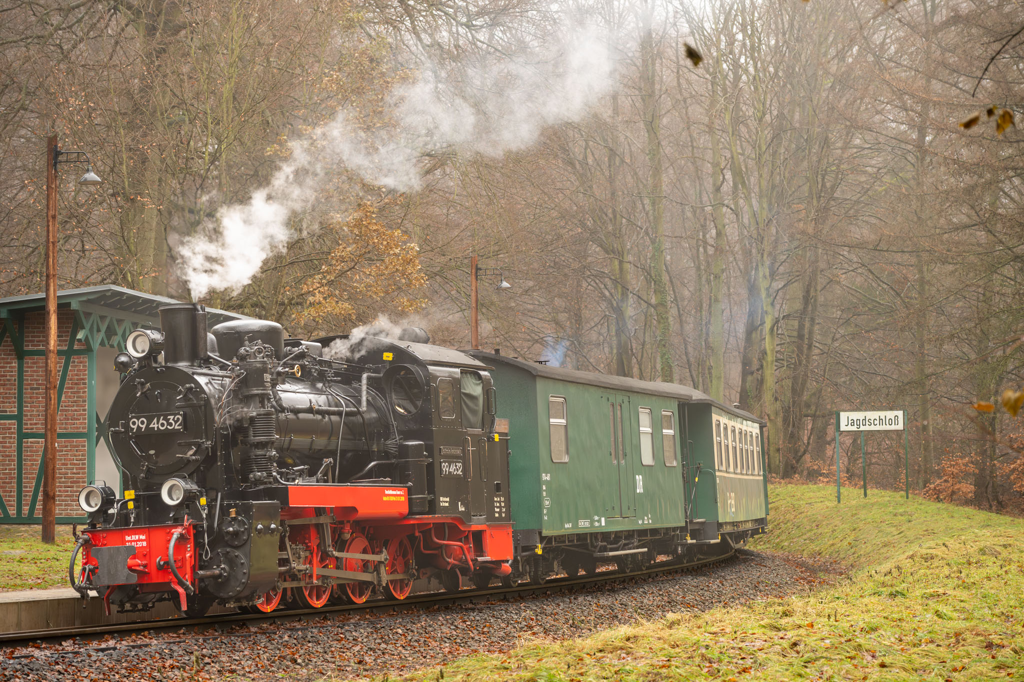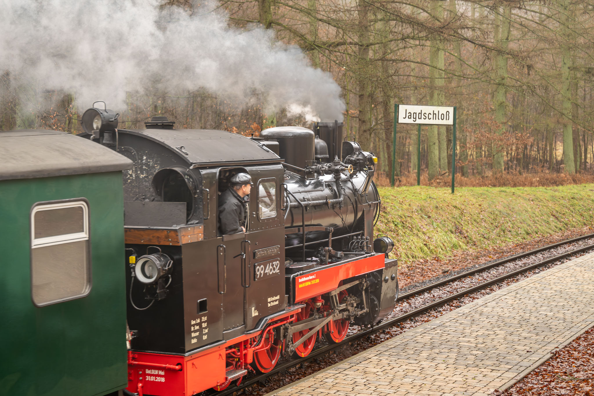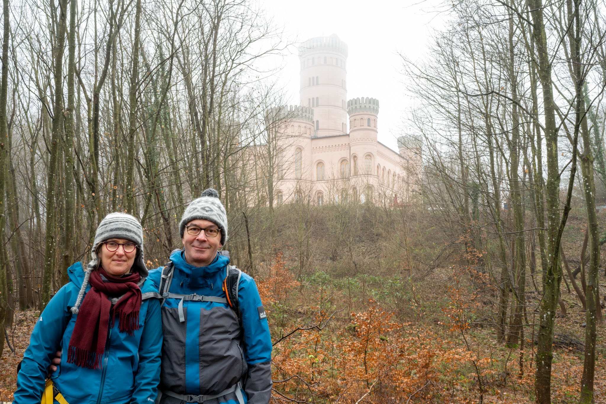 Nachdem sich viele Blog-Leser immer wieder Fotos von uns wünschen, haben wir am Granitzer Jagdschloss erst einmal das Stativ ausgepackt und ein paar Selfies geschossen. Zwischenzeitlich war es so spät, dass wir nur noch ein paar Minuten Zeit hatten, um den nächsten Rasenden Roland am Bahnhof Jagdschloss zu erwischen.