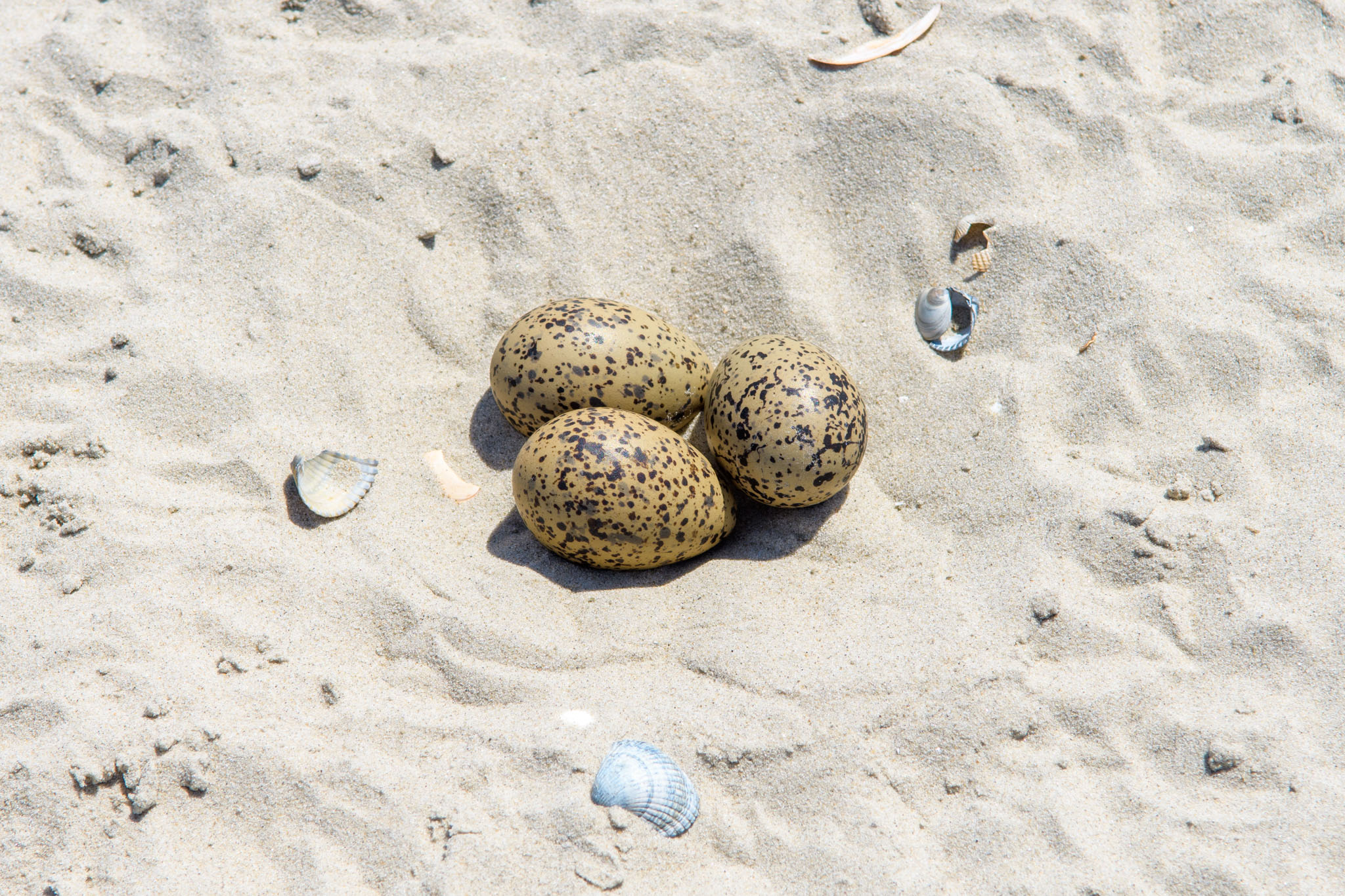 So übermäßig groß ist Spiekeroog ja nicht, doch trotzdem haben wir es erst heute das erste Mal geschafft, zum Baden an den Strand zu gehen. Beim anschließenden Standspaziergang sind wir dann auch noch auf ein Nest mit Vogeleiern gestoßen. Obwohl etliche Vogelarten ihre Eier einfach so am Strand ablegen, sind sie schon aus ganz kurzer Entfernung fast nicht sichtbar und damit sehr gut geschützt.