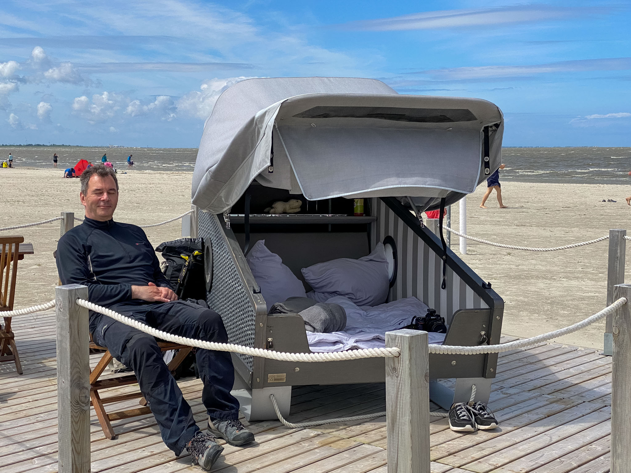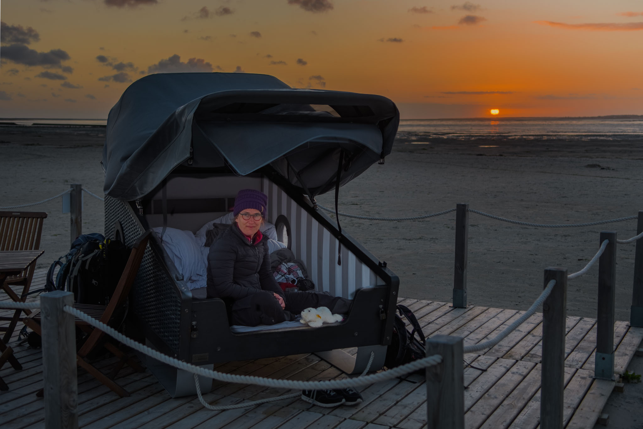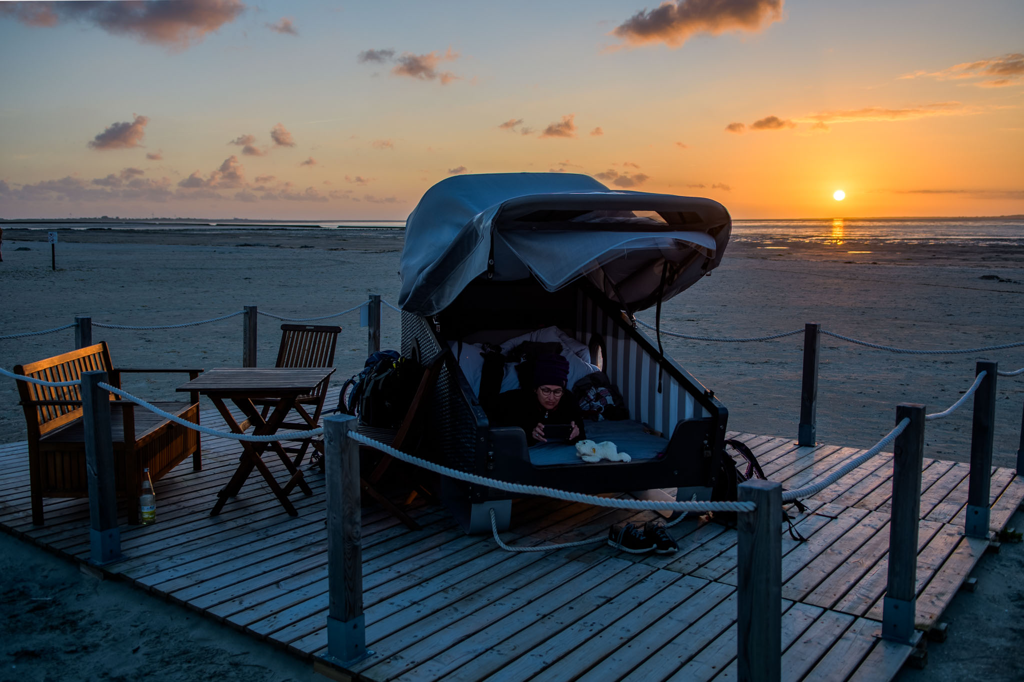 Vergangene Nacht haben wir zum Abschluss in Bensersiel im Schlafstrandkorb übernachtet – weswegen wir überhaupt an die Nordsee gefahren sind. Auf den Fotos seht Ihr, was wir dort in und um den Schlafstrandkorb von gestern Nachmittag bis heute früh so gemacht haben. Das Wetter hat auch an unserem letzten Urlaubstag (fast) perfekt gepasst. Lediglich etwas weniger Wind hätten wir uns gewünscht. Auf der anderen Seite war es sehr interessant, in der Nacht das Pfeifen des Windes zu hören, während man schön angenehm und warm im Strandkorb lag.