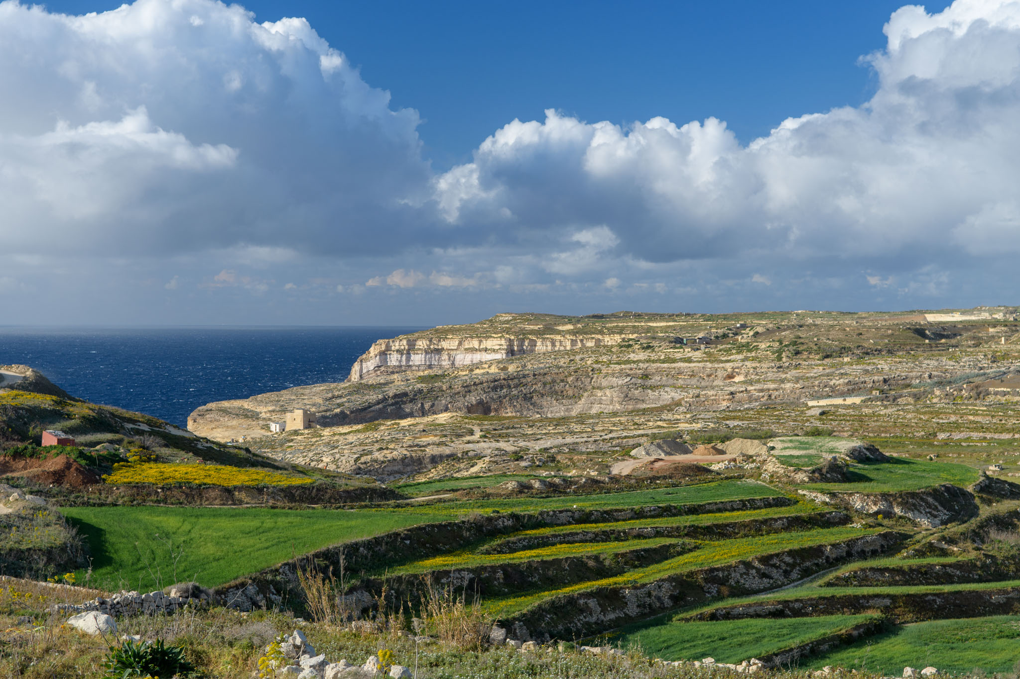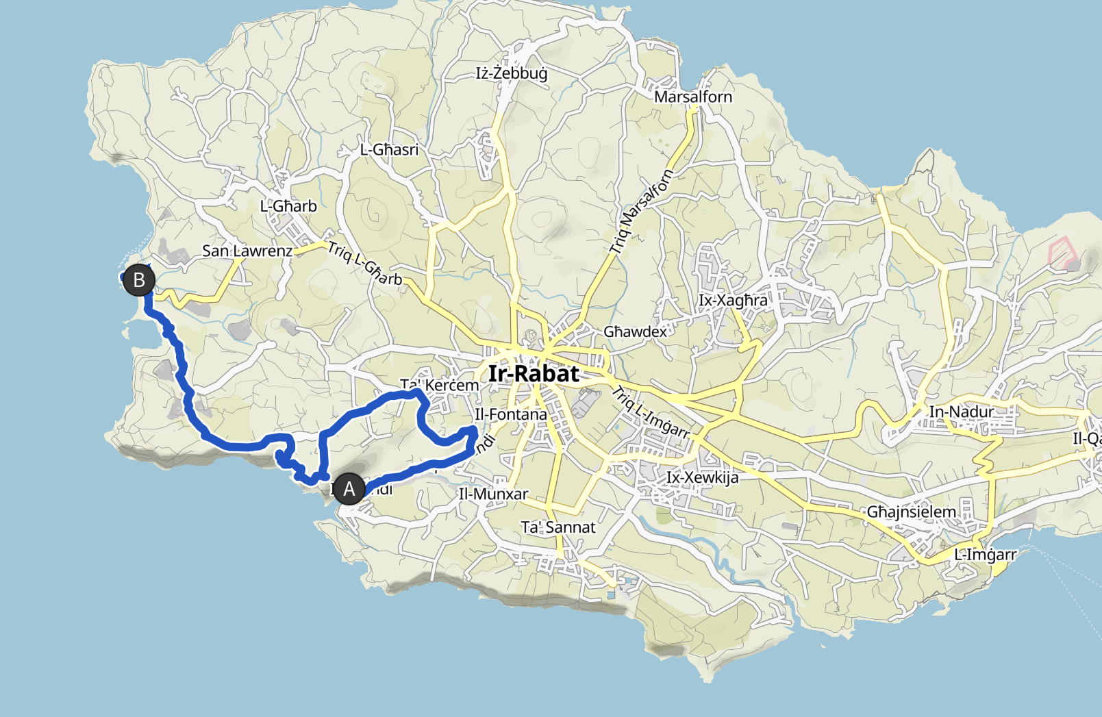 Heute ging es dann wieder einmal nach Gozo. Nach dem Besuch eines sehr gutem Fischrestaurants in Xlendi stand eine längere Wanderung zum Blauen Fenster auf dem Programm (s. Landkarte). Unser Mut bei der Planung des Tages hat uns dann belohnt. Am Morgen war es nämlich noch ziemlich bewölkt, doch als wir gerade los gingen, riss – wie vom Regenradar prophezeit – der Himmel auf und am Nachmittag hatten wir dann wieder bestes Wetter.