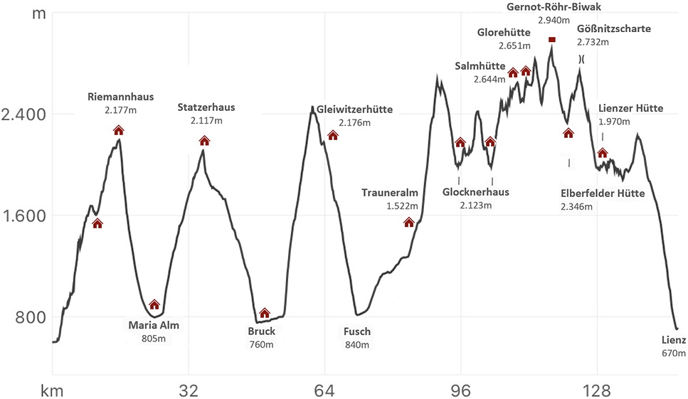 Route: Glorer Hütte (2651 m) – Kasteneck (2836 m) – Unterstandshütte (2490 m) – Kesselkeessattel mit Gernot-Röhr-Biwak (2926 m) – Elberfelder Hütte (2346 m) – Gößnitzscharte (2737 m) – Salzplattensee (2372 m) – Lienzer Hütte (1977 m)