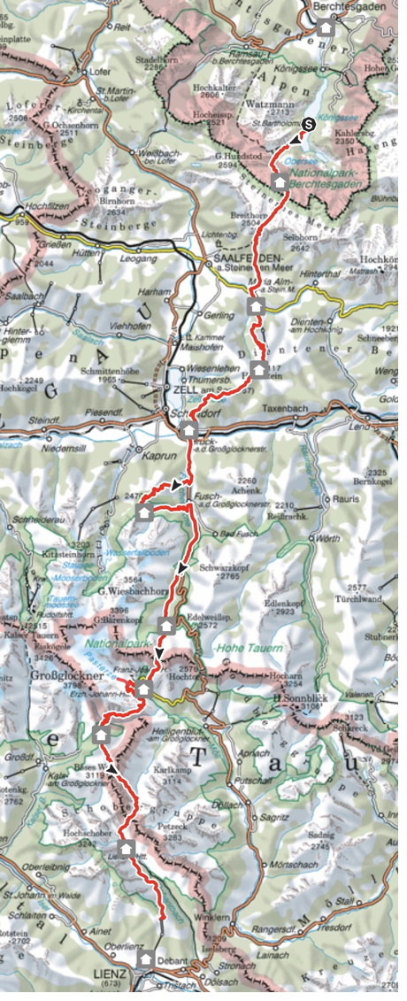 Route: Statzerhaus am Hundstein (2117 m) – Ebnerscharte (1612 m) – Eisbrunnen – Erlhofplatte (1368 m) – Bachseiten – Bruck an der Großglocknerstraße (756 m)