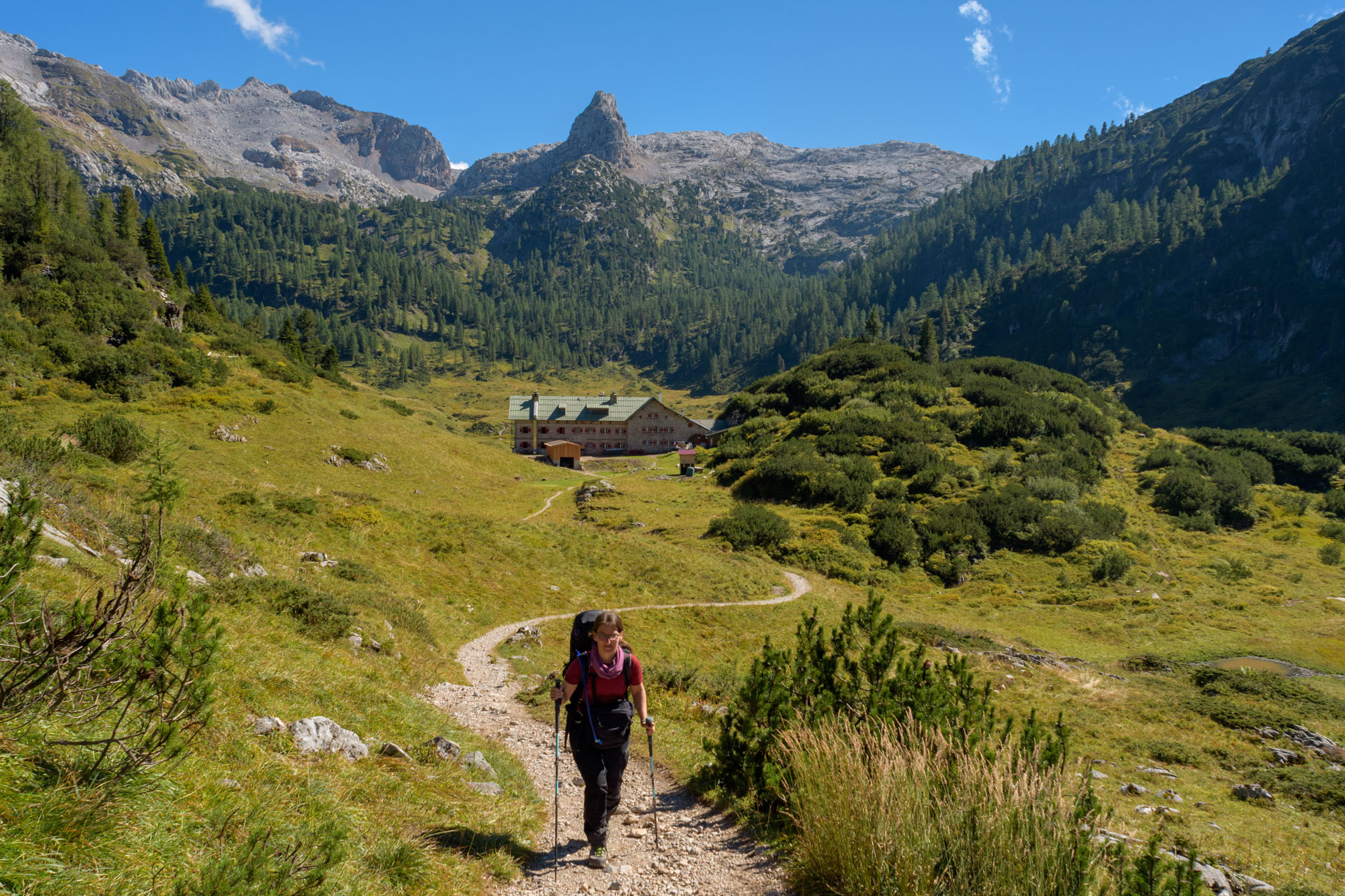 Von St. Bartholomä sind 5 Stunden zum Kärlingerhaus angeschrieben. Der Weg hat zwei wirklich steile Serpentinenteile, das zweite bekannt als Saugasse. Es sind aber alles richtige Wege, wenn auch alpin. Wir sind sogar an Schneeresten vorbeigekommen. Wir waren dann etwas überrascht, als wir nach genau 3¾ Stunden am Kärlingerhaus waren, da wir mit dem ganzen Gepäck ja doch etwas langsamer unterwegs waren als sonst.