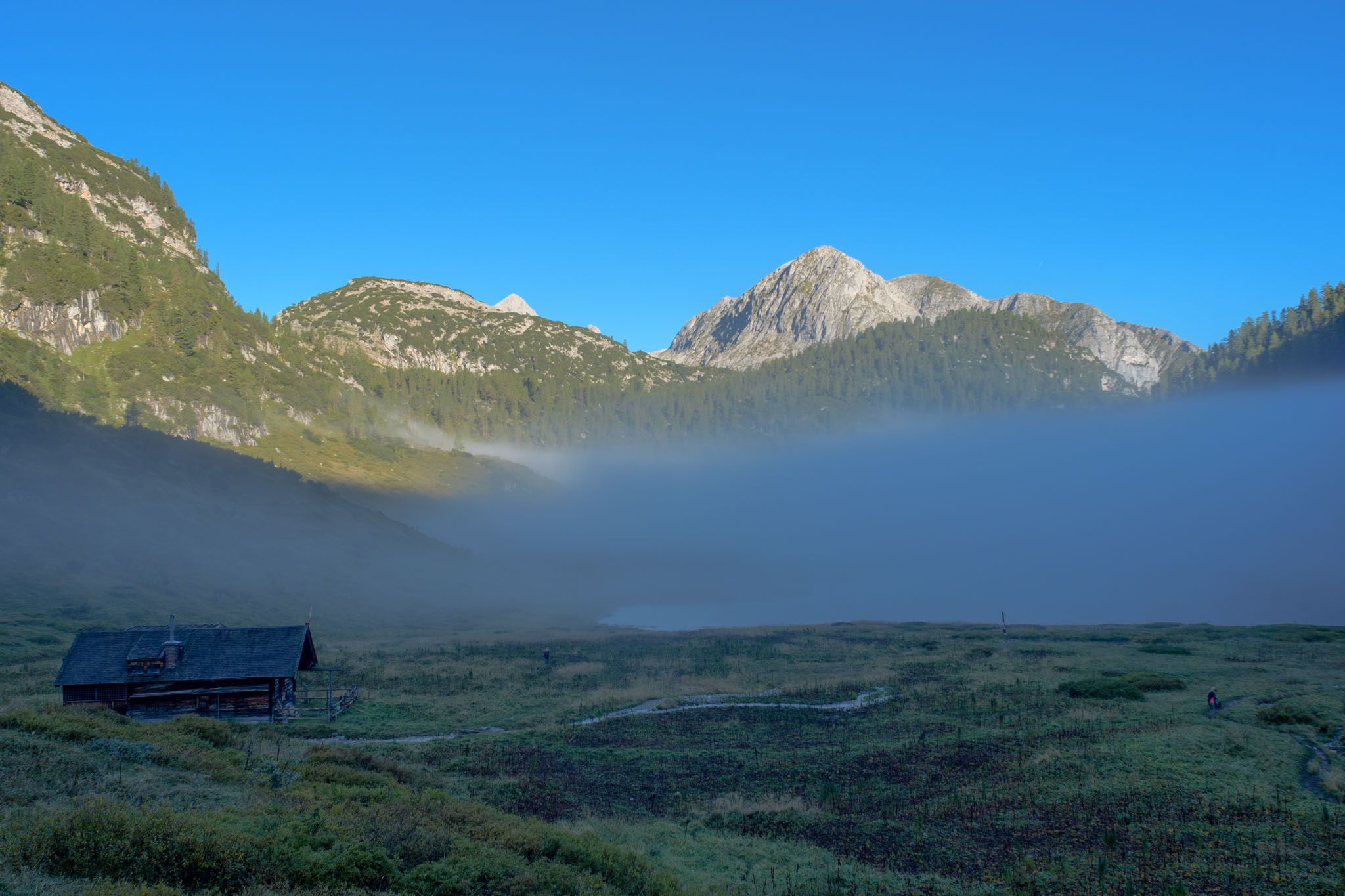 Beim Losgehen lag früh über dem Funtensee ein richtig schöner Nebel. Weiter oben ist es dann gleich aufgezogen und wir hatten wieder herrliches Wetter. Wie wir dann auf dem Weg festgestellt haben, geht es nur die erste Stunde durchs Baumgärtl, danach geht auch diese Route fast zwei Stunden durchs Steinerne Meer – ein Felsblock reiht sich an den nächsten. Das Riemannhaus taucht dann recht plötzlich auf und steht an der Kante mit freiem Blick auf den Großvenediger und das Kitzsteinhorn.