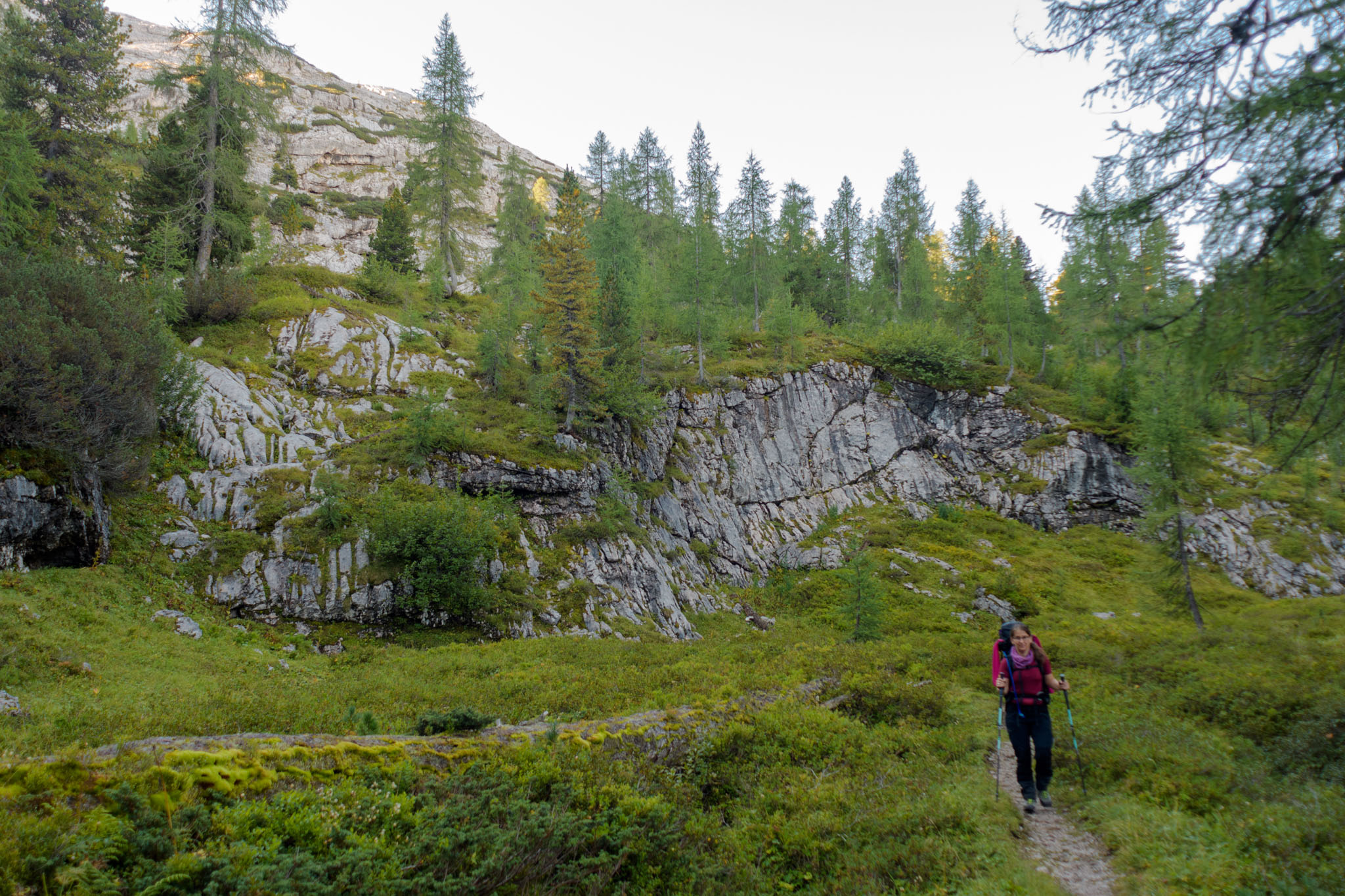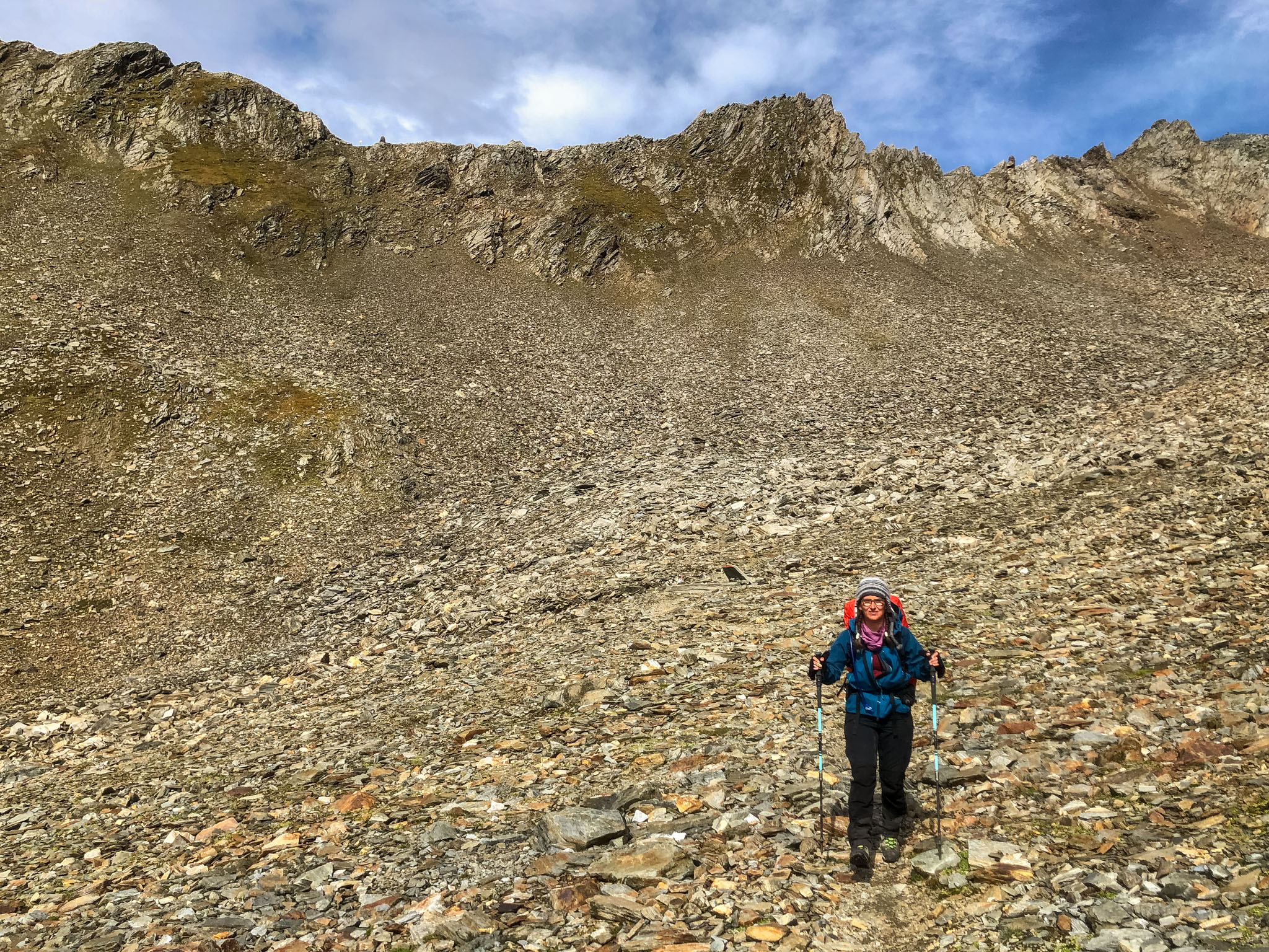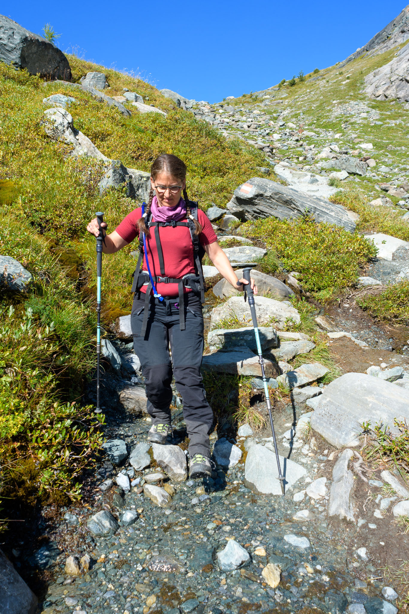 Wir hatten erwartet, dass der Weg häufig begangen ist, das scheint aber nicht der Fall zu sein, denn häufig kann man gar nicht erkennen, wo der Weg sein soll, so weit ist er zugewachsen und gleichzeitig felsig. Nachdem es auch noch feucht ist und es oft über Blockwerk geht, kommen wir nicht so recht vom Fleck und es ist viel anstrengender als erwartet. Für Maria ist es etwas frustrierend, hier bei einem an sich einfachen Weg auf der Stelle zu treten, nachdem wir die letzten Tage erfolgreich echt herausfordernde Touren geschafft hatten. Wir fragen uns, wie lange wir so brauchen werden.
