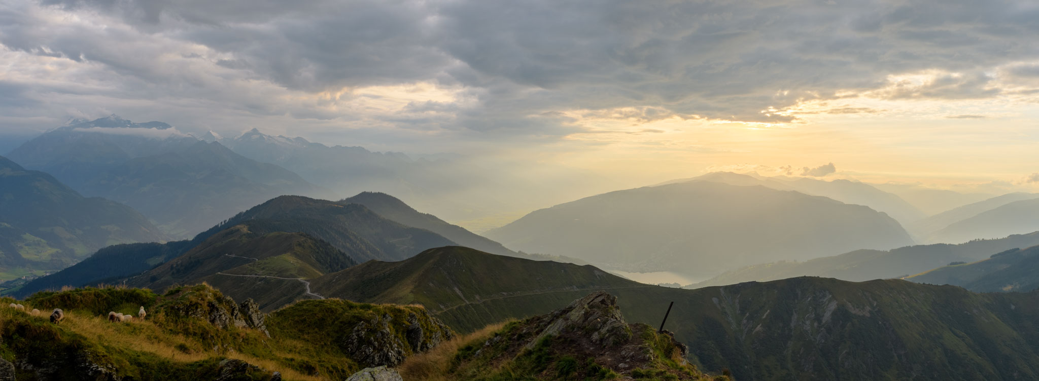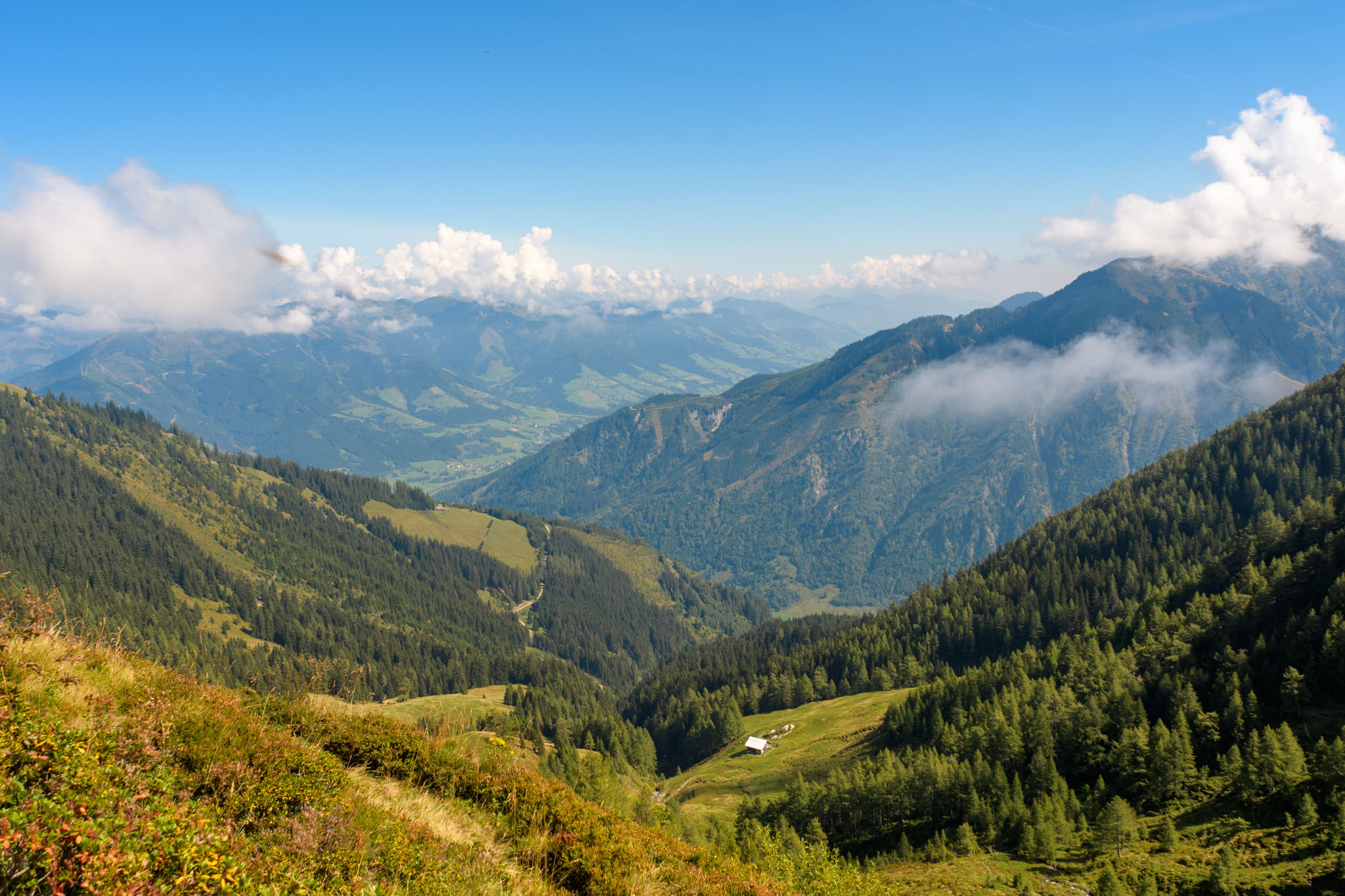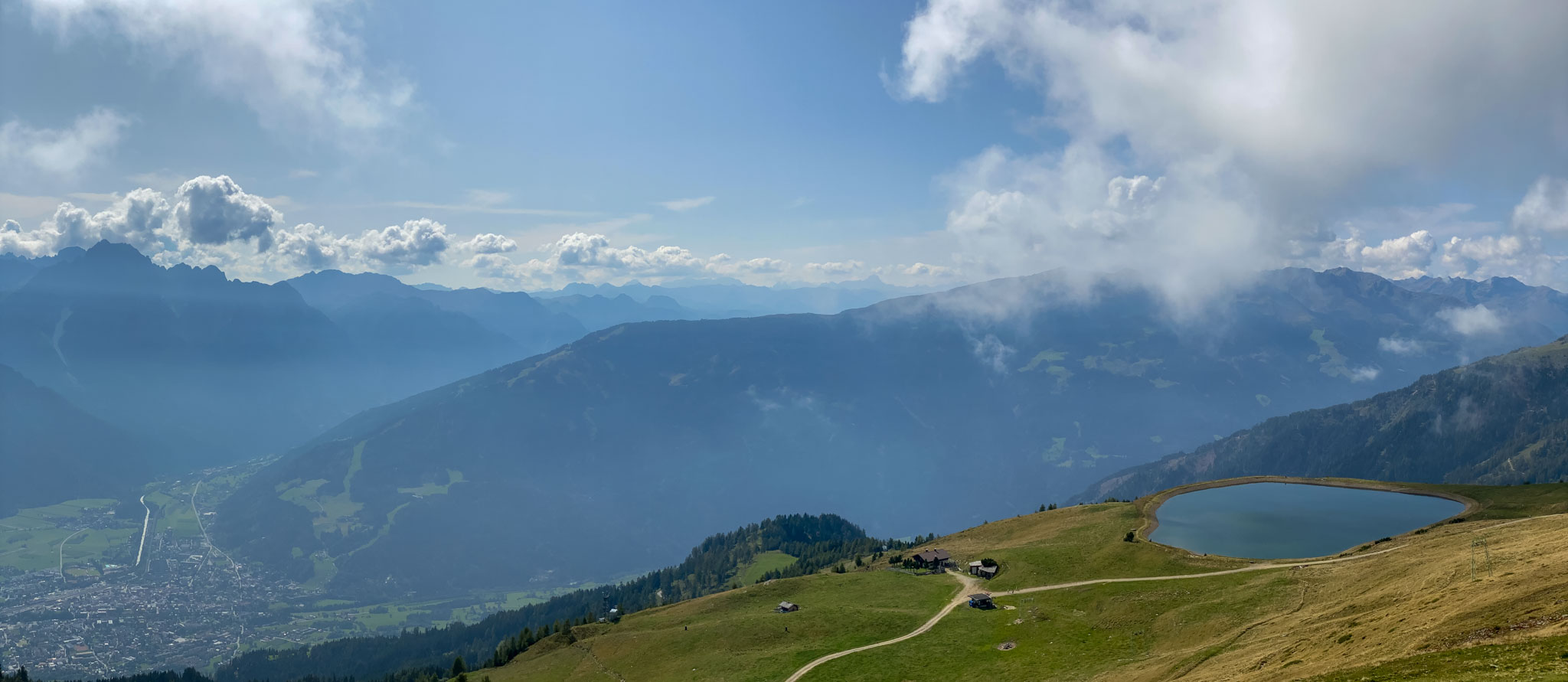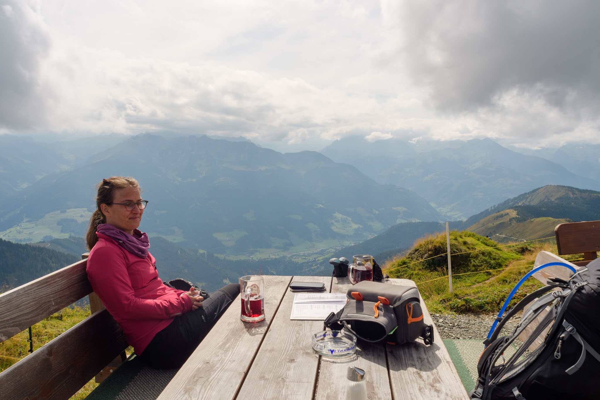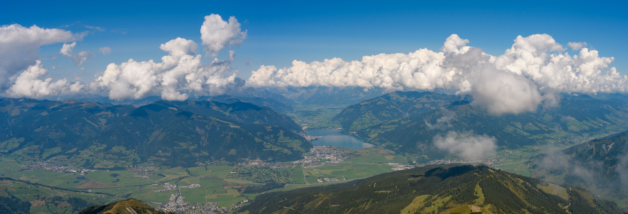 Über die Wiesen ging es weiter bergauf und wir waren froh über jede Wolke, die uns Schatten gespendet hat. Die Aussicht wurde immer besser, man sieht auch den Zeller See und den Hundstein mit Statzerhaus recht gut, der war teilweise aber in Wolken.