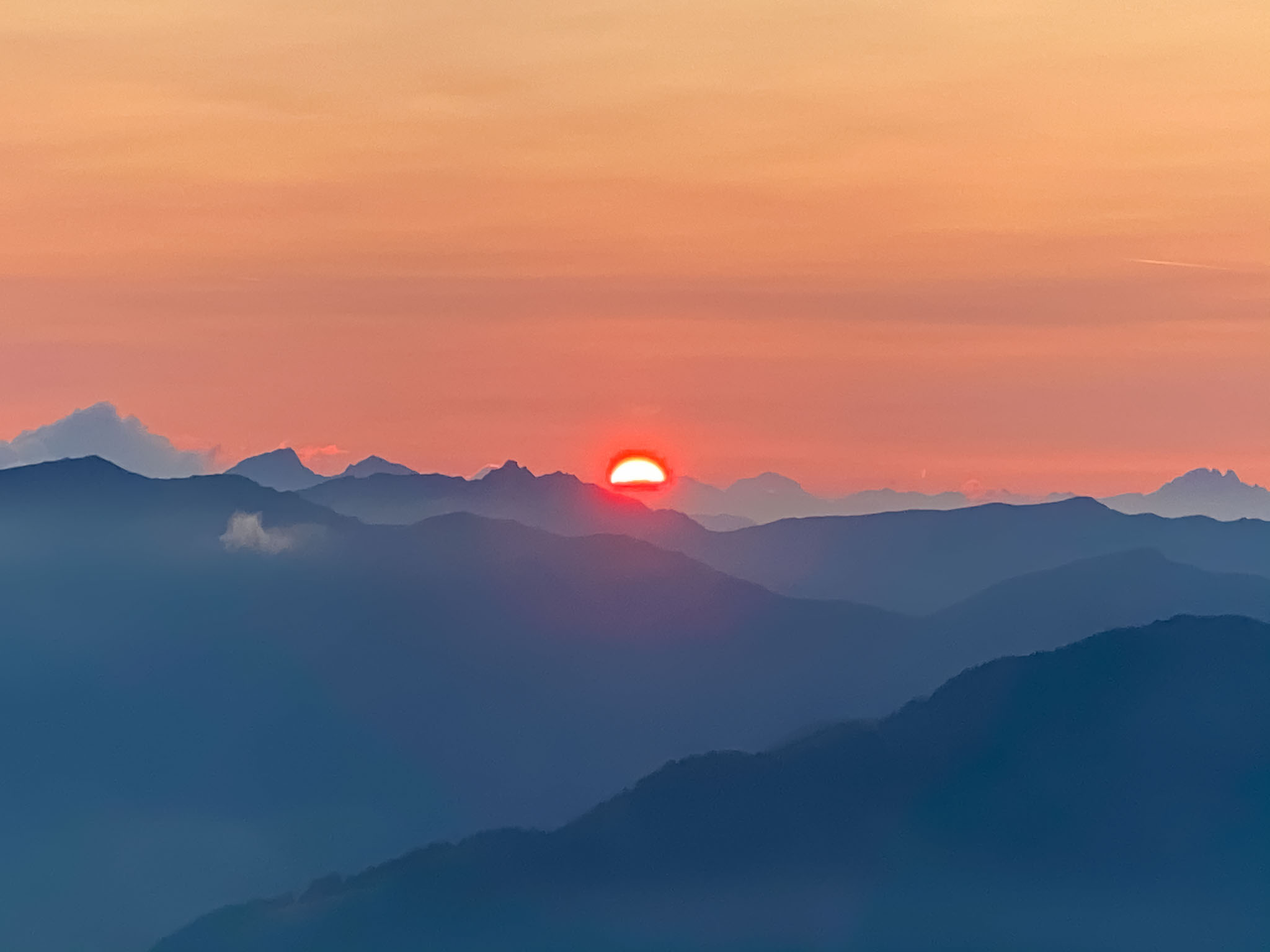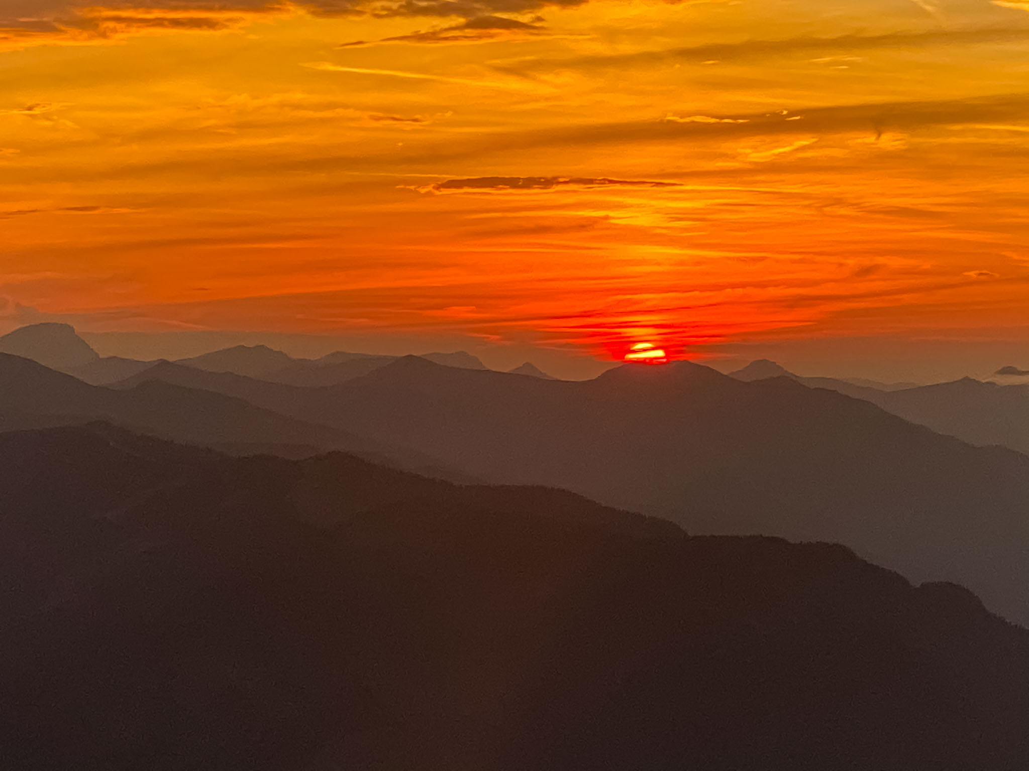 Heute dachten wir, dass es gleich in doppelter Hinsicht positiv war, dass gestern und heute nur kurze Etappen auf dem Programm standen. Zum einen konnten wir dadurch gestern auf einem Gipfel mit 360-Grad-Rundumsicht übernachten (statt dort nur eine kurze Rast zu haben). Und zum anderen sollte es heute Nachmittag regnen/gewittern. Die Aussicht gestern Abend war wirklich toll, doch statt dass es jetzt regnet, brüteten wir hier in der prallen Sonne.