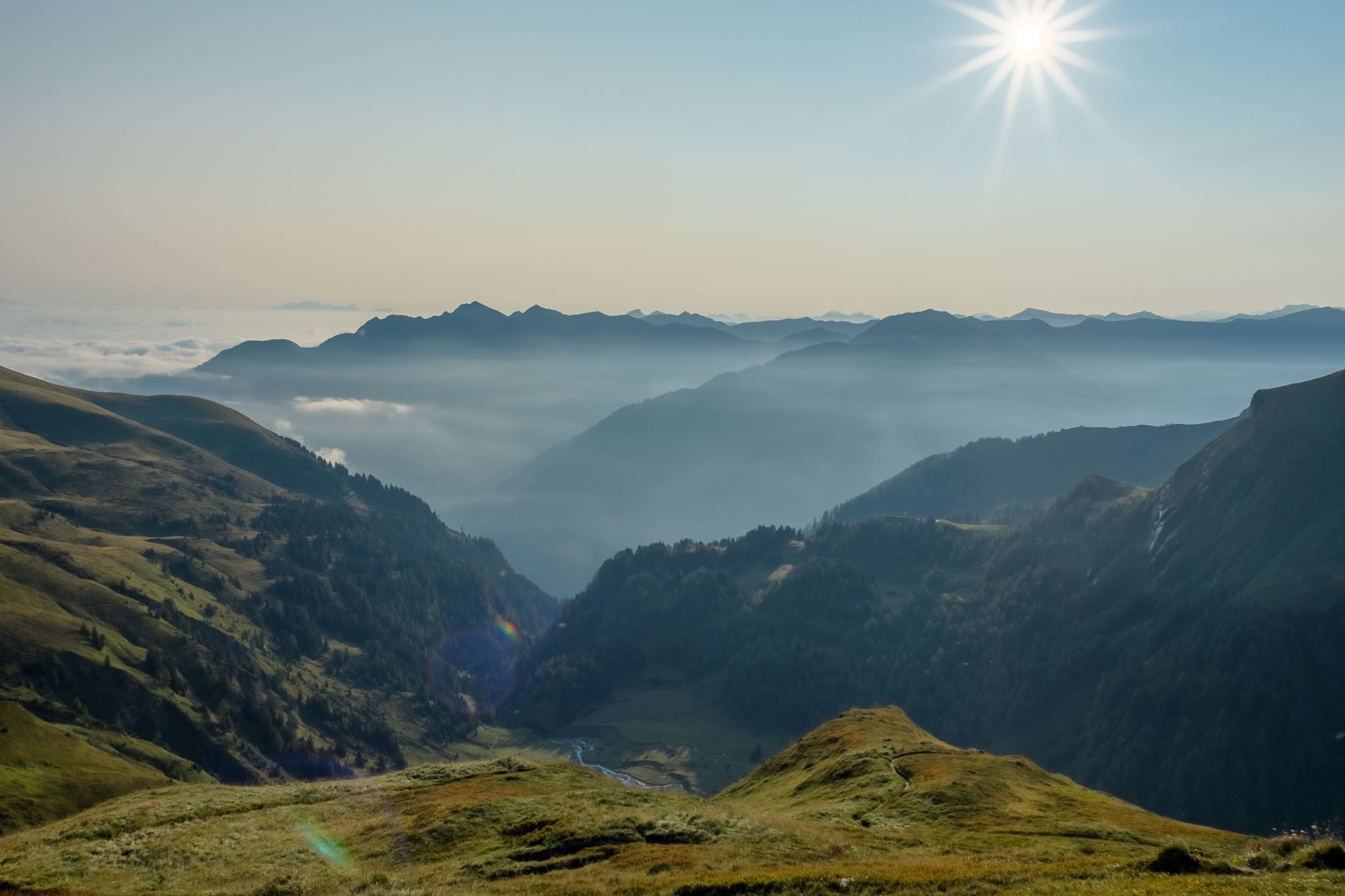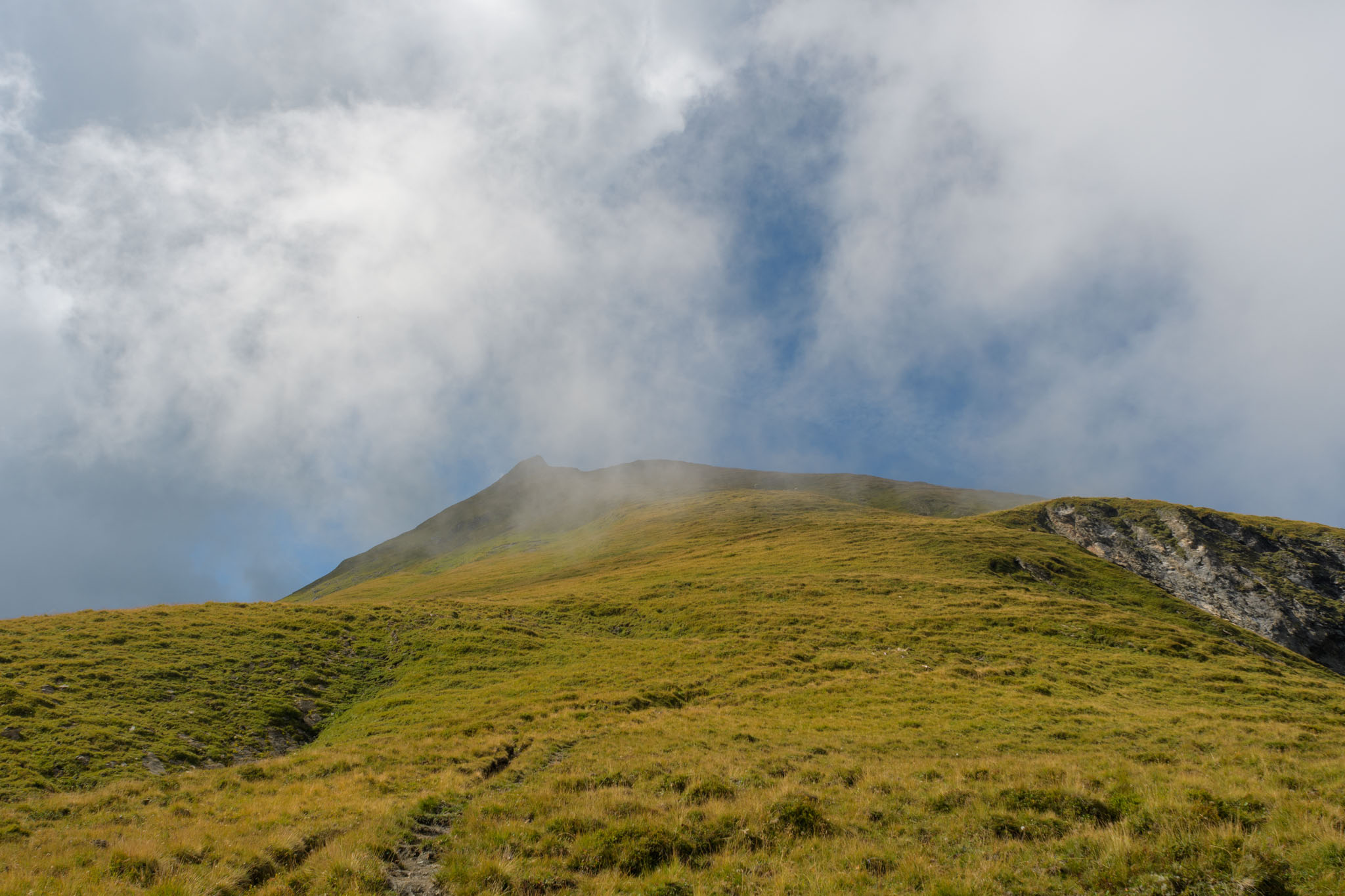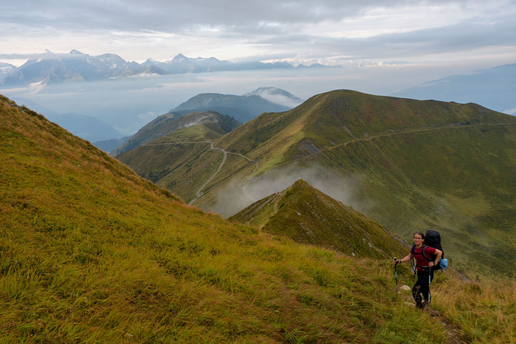 Heute ist Bruck an der Glocknerstraße unser Ziel und es geht nur bergab. Der Weg geht anfangs am Grat entlang mit Blick auf die nebelumwaberte Glocknergruppe. Nach ca. der halben Strecke haben wir Blick auf den Zeller See, der immer weiter aufklart. Es ist recht angenehm, heute mal nicht immer in der prallen Sonne zu laufen. Und das letzte Stück geht es durch den Wald bis runter ins Tal.