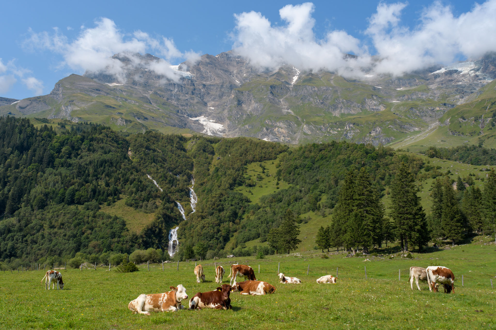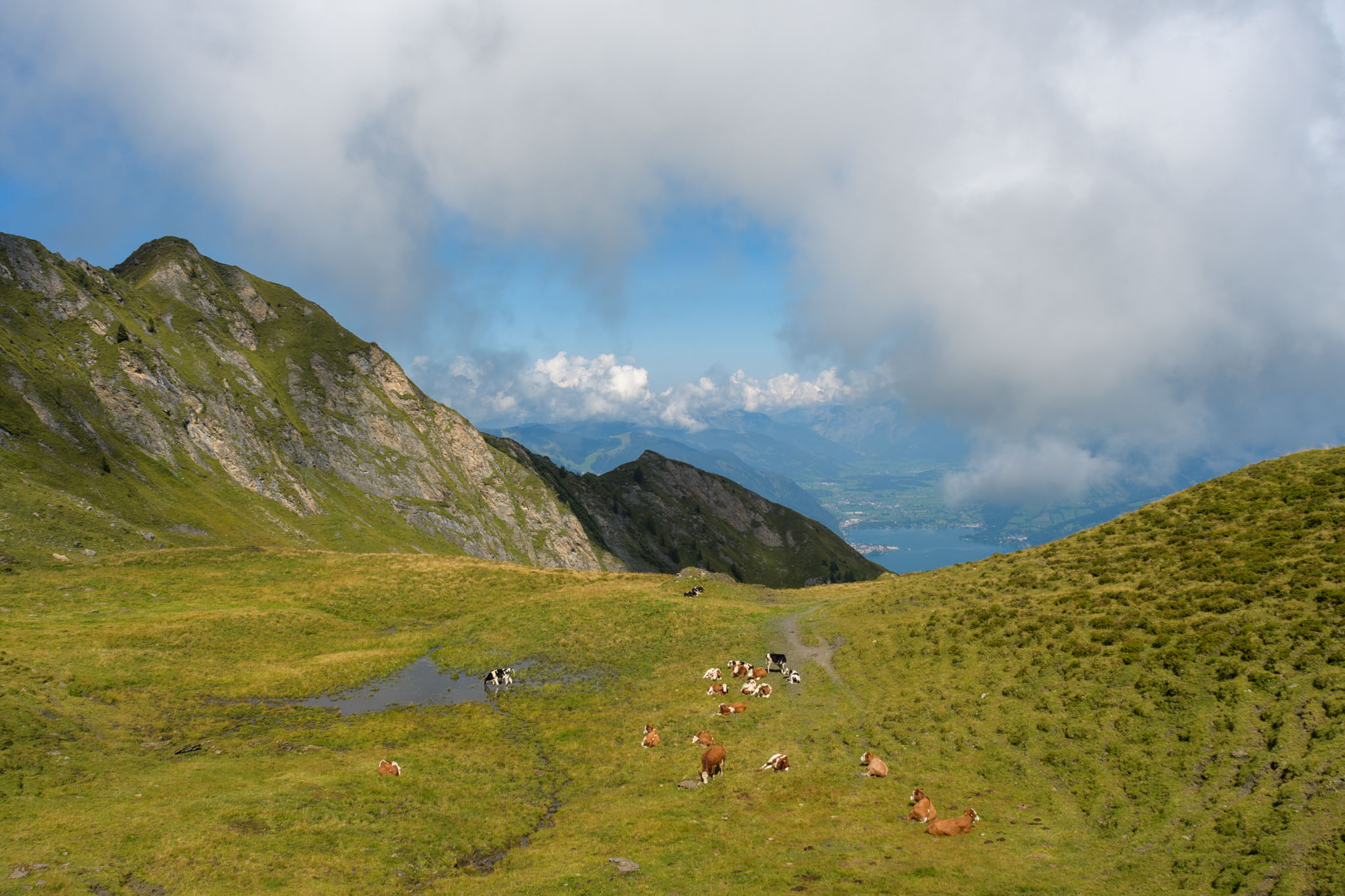 Recht bald sieht man dann schon das Imbachhorn, was der höchste Punkt unserer heutigen Tour ist. Allerdings ist uns noch nicht so recht klar, wie oder besser wo wir da hochgehen sollen. An der Abzweigung überlegen wir aber nur kurz und entscheiden uns für den Gipfelweg. Die Kühe am Weg machen uns auch recht bereitwillig Platz, so dass es keine Ausreden gibt, den steilen Weg hoch zu gehen.