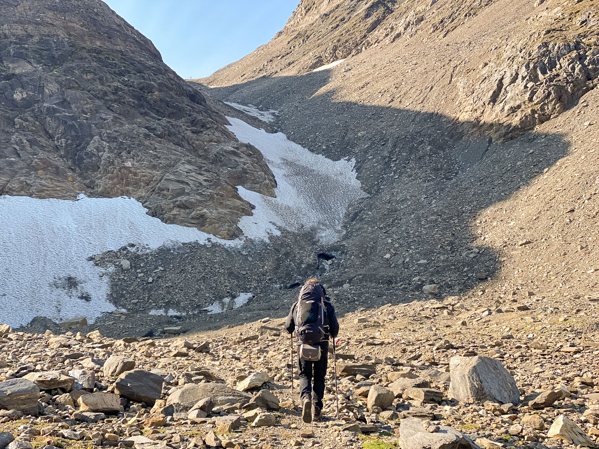 Von hier sieht man erstmals deutlich den nördlichen Pfandlscharten-Kees, einen kleinen Gletscher, über den wir gehen müssen, um zur Scharte zu kommen. Hier ist der Weg nur sehr grob markiert und nicht einfach zu finden.
