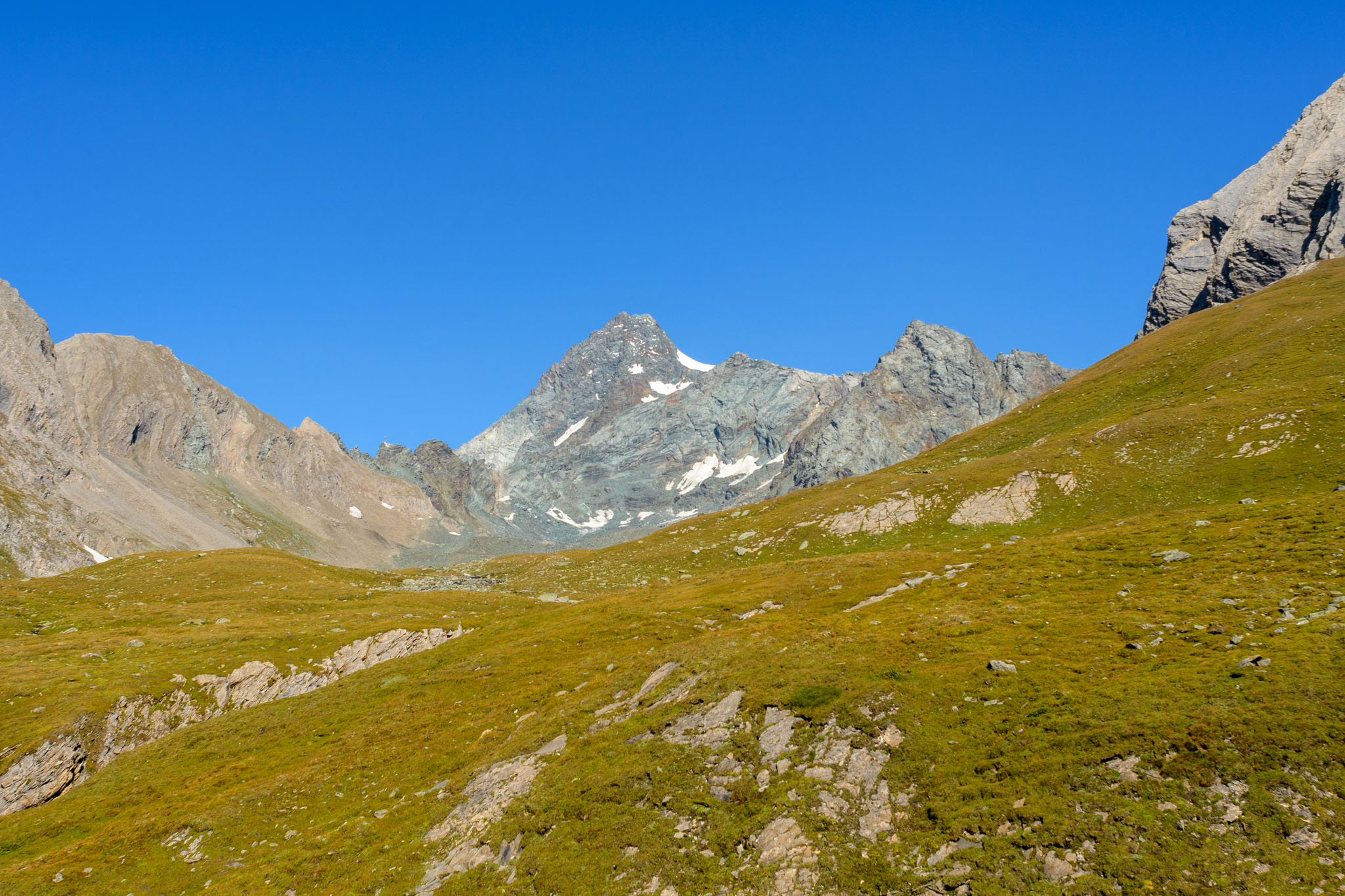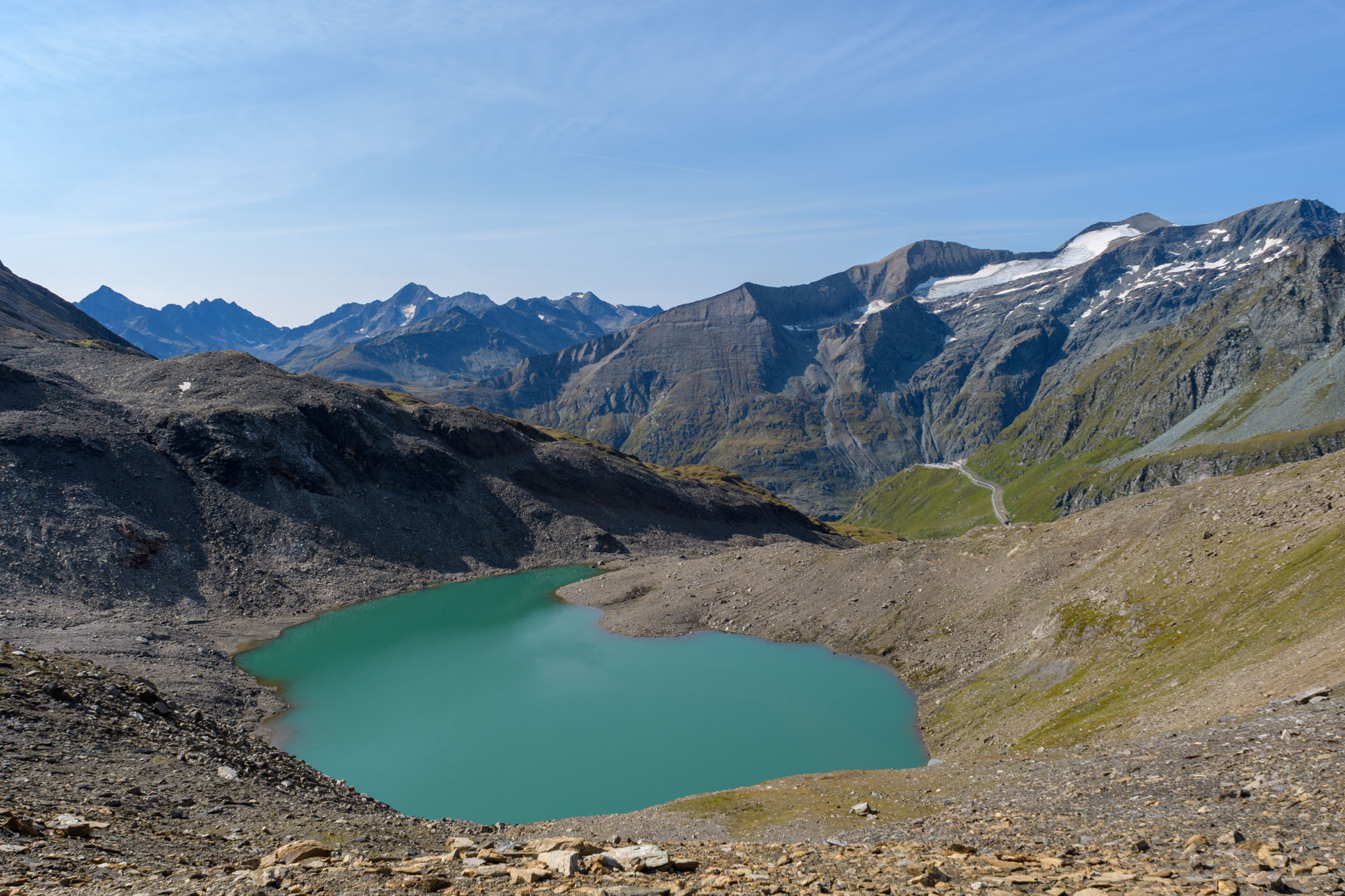 Vom „Gipfelkreuz“ der unteren Pfandlscharte sieht man einen kleinen See auf der Kärntner Seite und das letzte Stück der Großglockner-Hochalpenstraße, aber noch nicht den Großglockner. Dazu müssen wir erst Richtung See absteigen, am Hang außenrum und auf der anderen Seite wieder hoch über einen kleinen Hügel gehen, bis der Großglockner – allerdings noch ohne Gletscher – sichtbar wird.