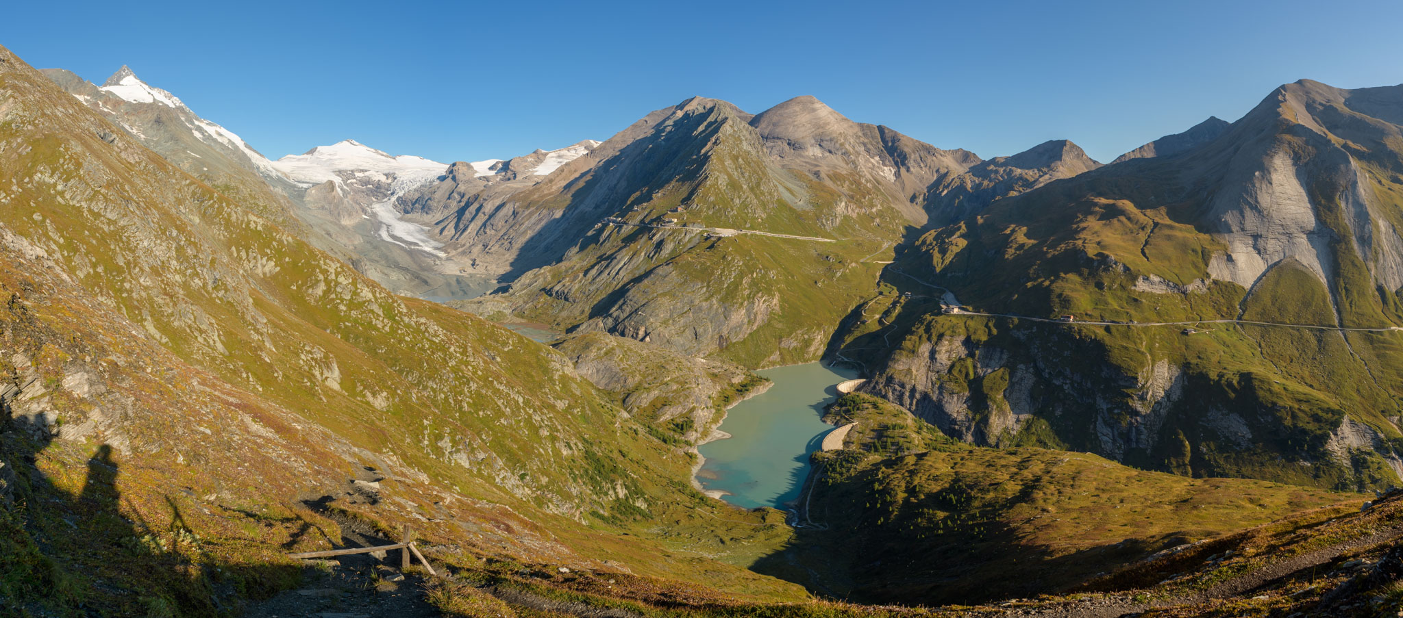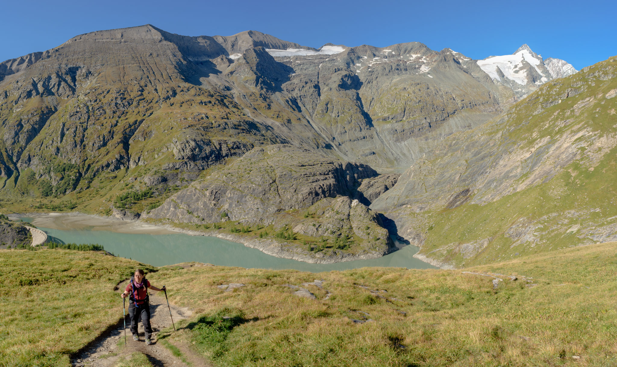 Vom Glocknerhaus, wo unsere kleine Rundwanderung zum Gletscher beginnt, hat man Blick auf den kleinen etwas tiefergelegenen Stausee Margaritze, zu dem wir als erstes absteigen. Dann geht es im Uhrzeigersinn um den Stausee. Wir haben sehr guten Blick auf den Großglockner und die Gletscher, die sich im See spiegeln.